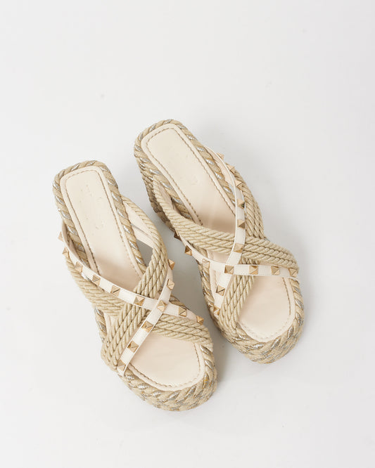 Beige Metallic Jute Rockstud Espadrille Wedge Sandals - 39