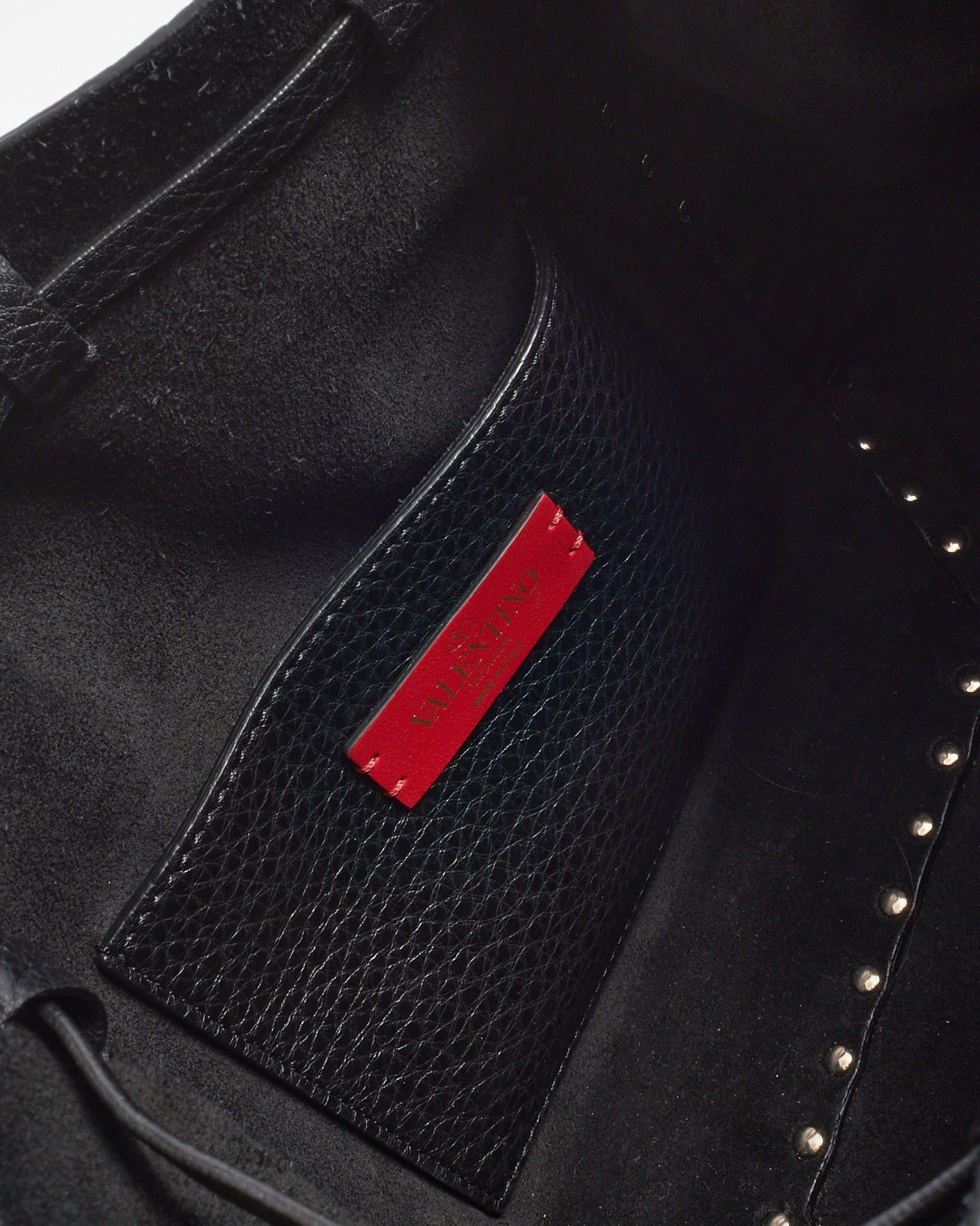 Add an edge of modern elegance to your accessories with this pre-loved authentic Valentino bucket bag, rendered in black grained leather and accented with the house’s signature silver Rockstud hardware. The drawstring closure cinches the softly structured silhouette, while the adjustable shoulder strap offers effortless styling. Both versatile and statement-making, this piece perfectly balances edgy sophistication with timeless Italian craftsmanship—ideal for adding a bold finish to your daily edit.