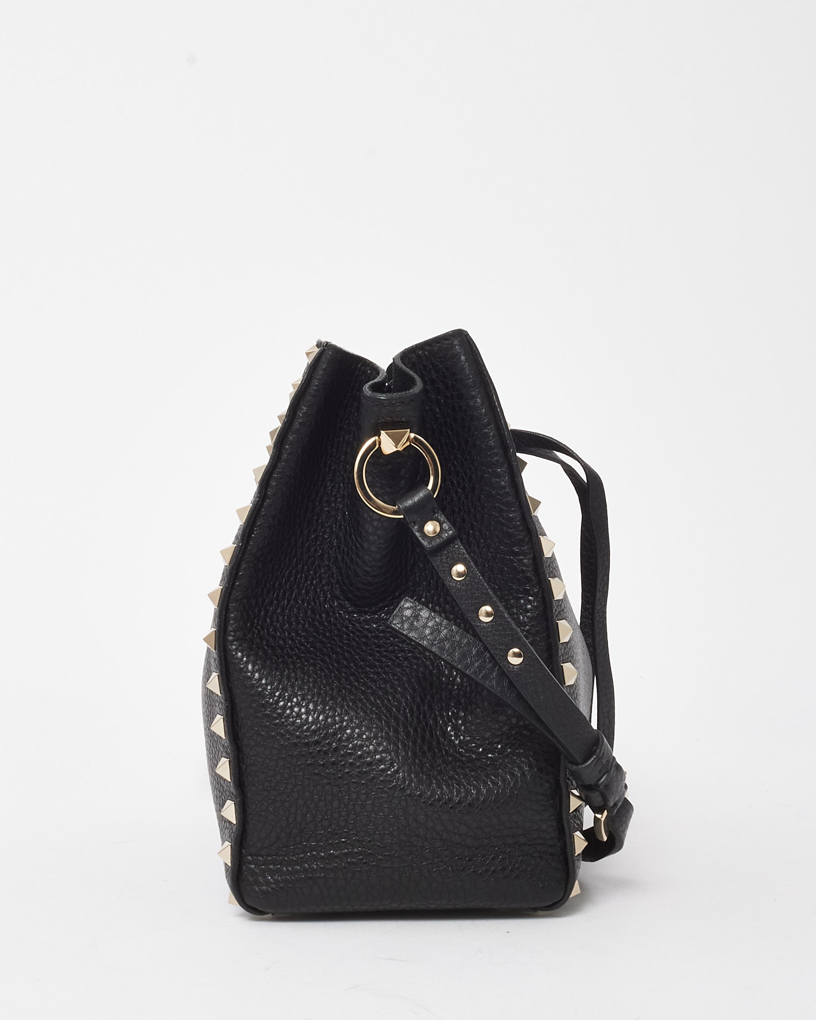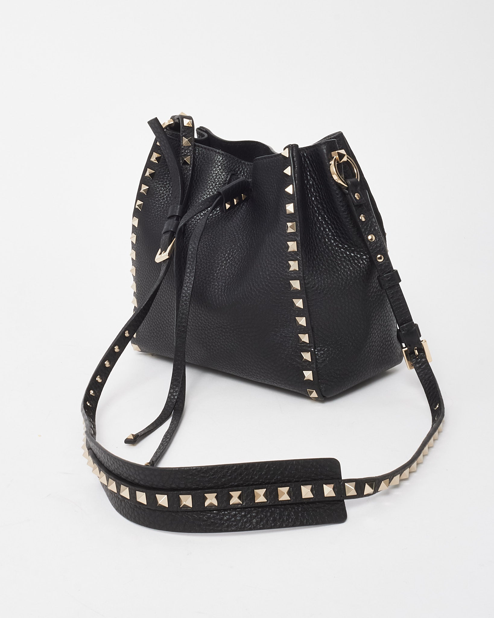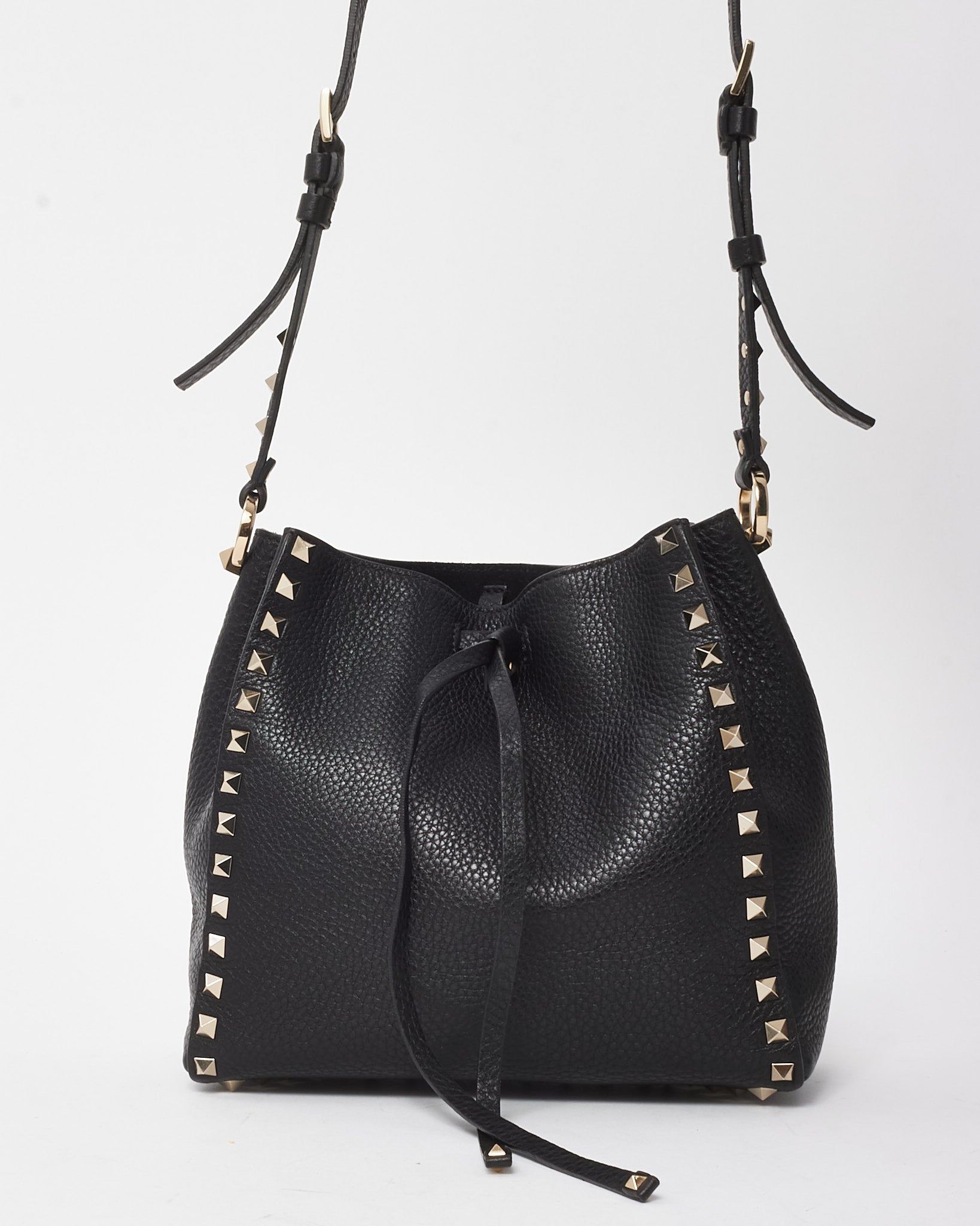 Black Grained Leather Silver Rockstud Drawstring Bucket Bag