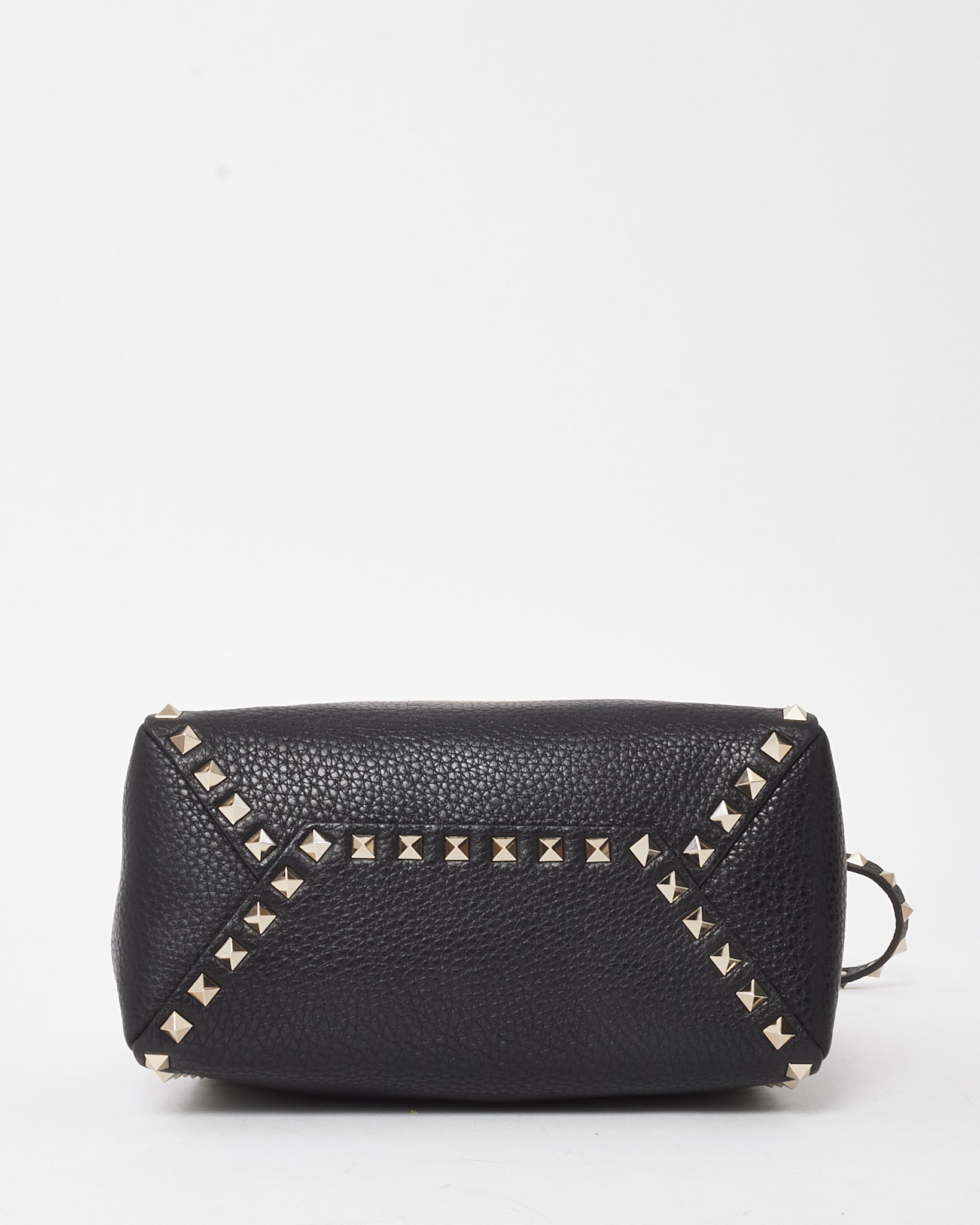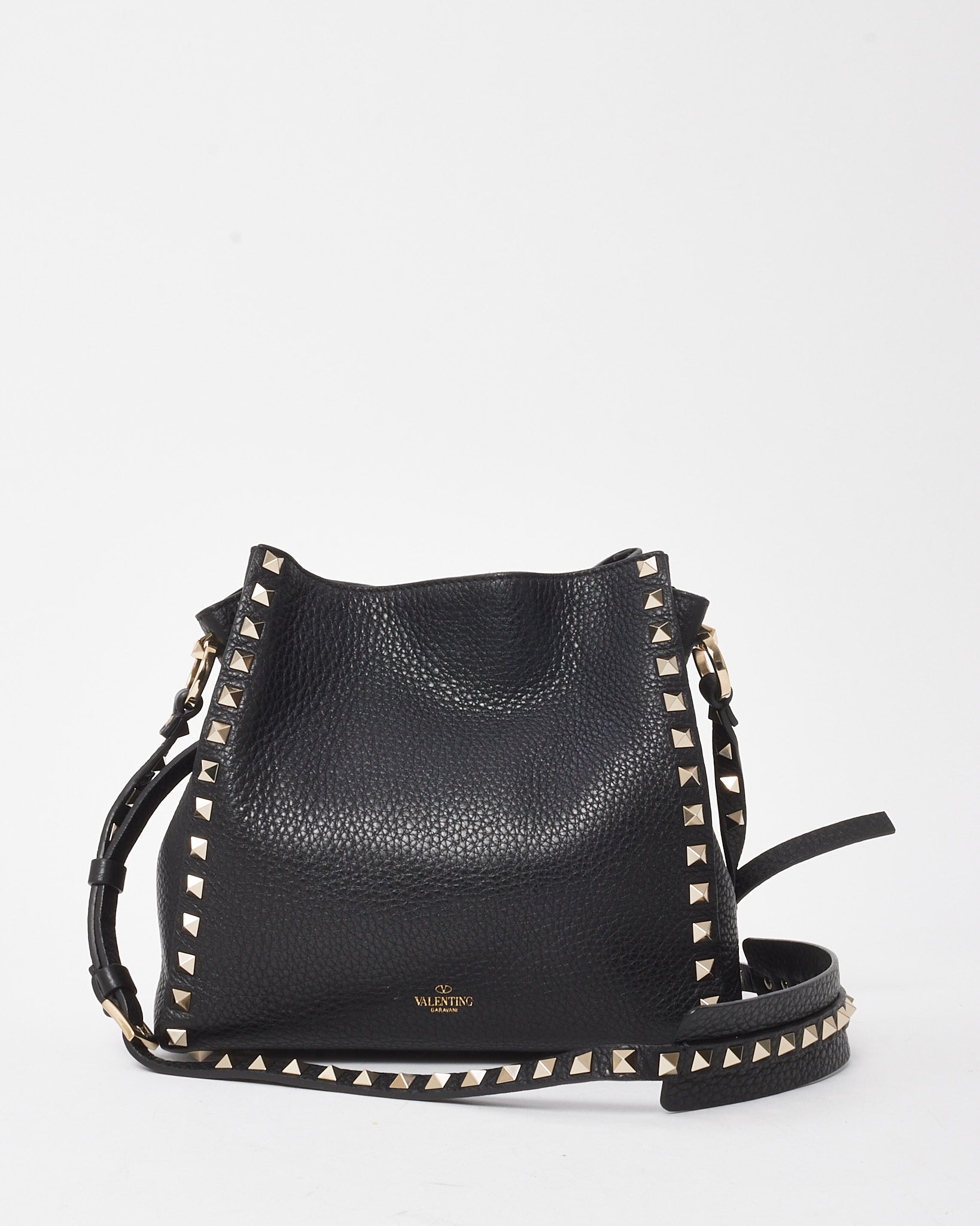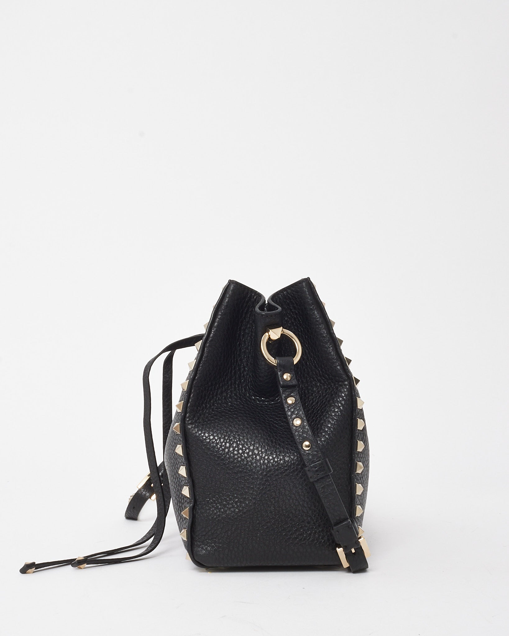 Black Grained Leather Silver Rockstud Drawstring Bucket Bag