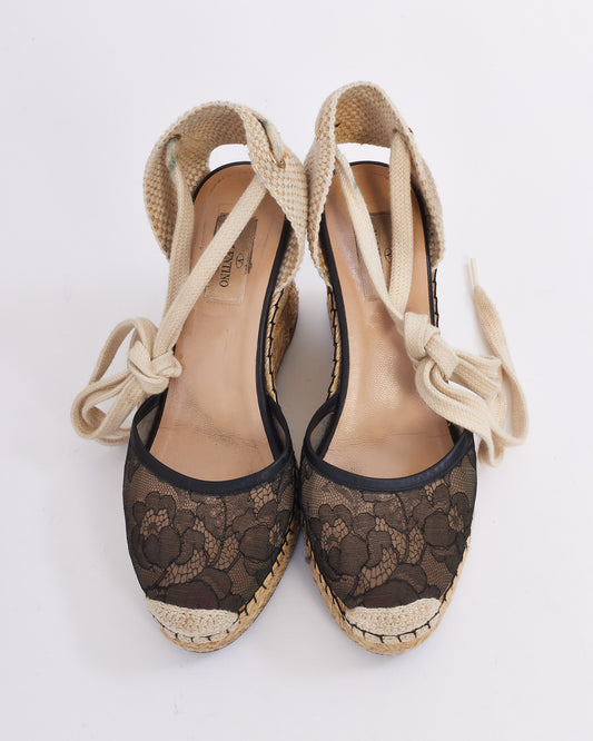 Black Lace Pattern Slingback Sandal Wedges - 39