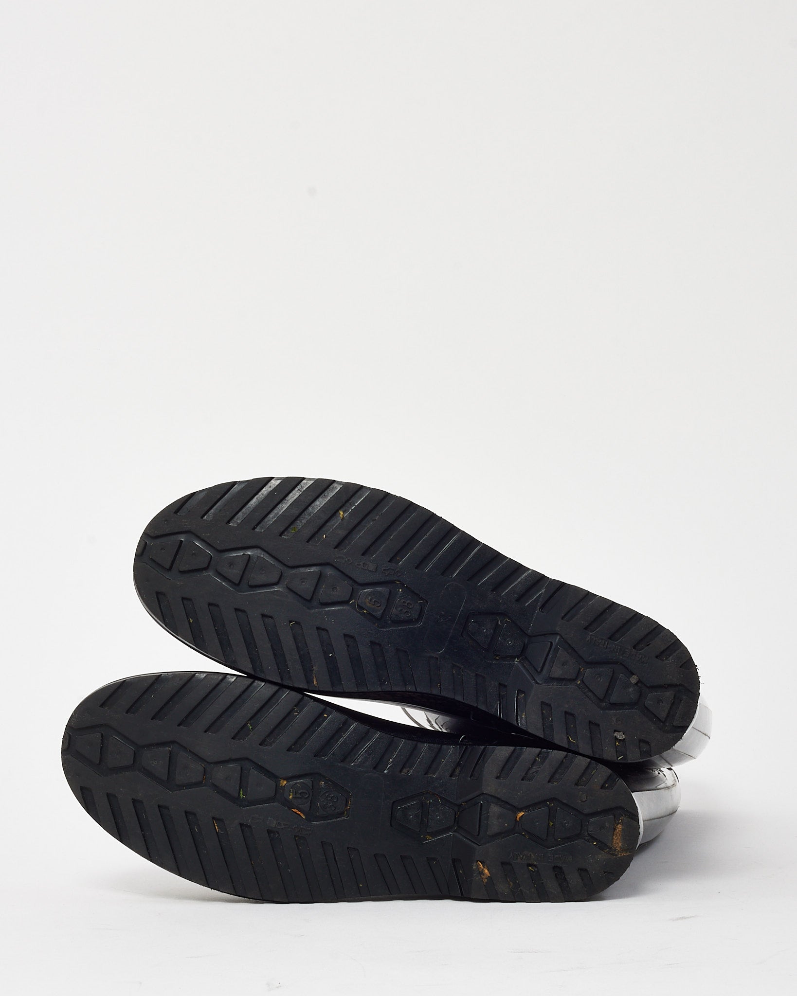 Step out in style, rain or shine, with these pre-loved authentic Valentino Black Lace Print Rubber Rain Boots in size 38. Crafted from durable rubber, these knee-high boots feature an elegant black lace print overlay that brings a romantic twist to wet-weather wear. Designed with a rounded toe and low block heel, they offer both comfort and practicality, while the tonal branding adds a subtle designer touch. Chic and functional, they elevate rainy day outfits with signature Valentino flair.