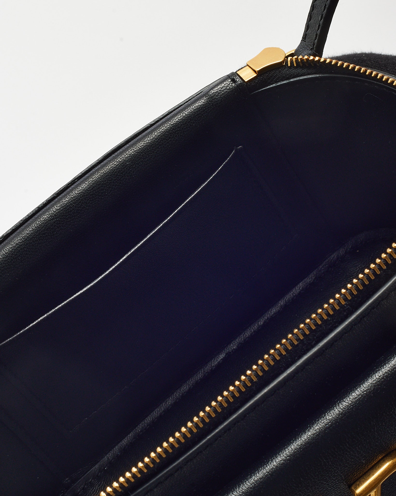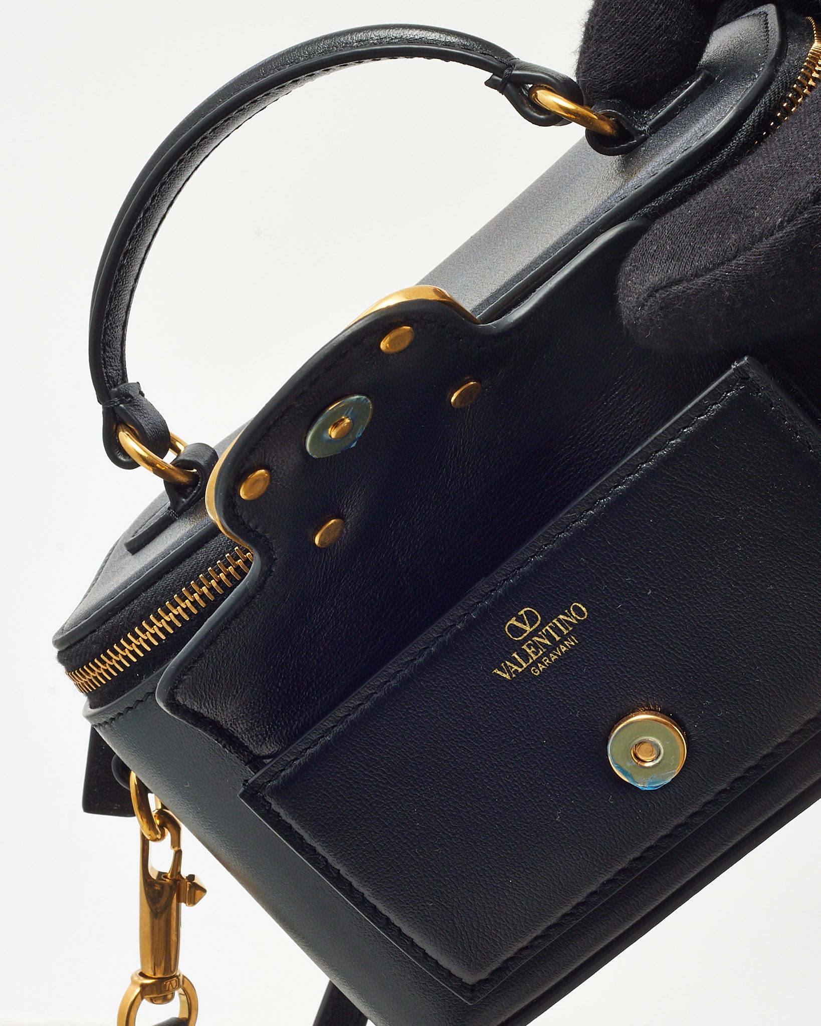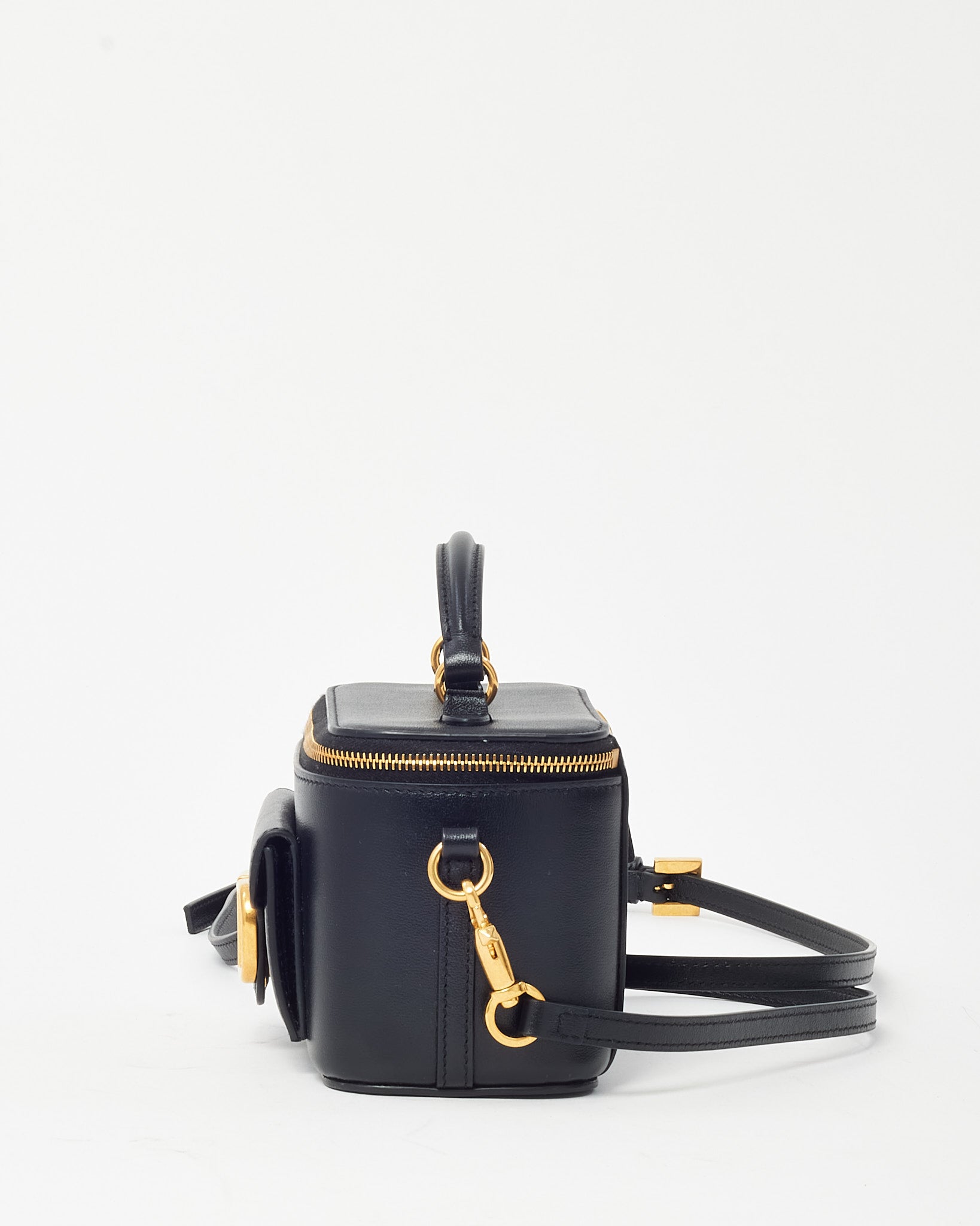 Add a touch of refined elegance to your rotation with this pre-loved authentic Valentino VLogo Mini Vanity Bag. Crafted in sleek black leather, this compact piece is accented with gleaming gold-tone hardware and the signature VLogo emblem for a polished finish. The structured silhouette features a top handle for classic styling and a zip-around closure for secure storage. Whether carried by hand or styled with a crossbody strap, this mini vanity bag is the perfect on-the-go statement for evening outings or day-to-night transitions.