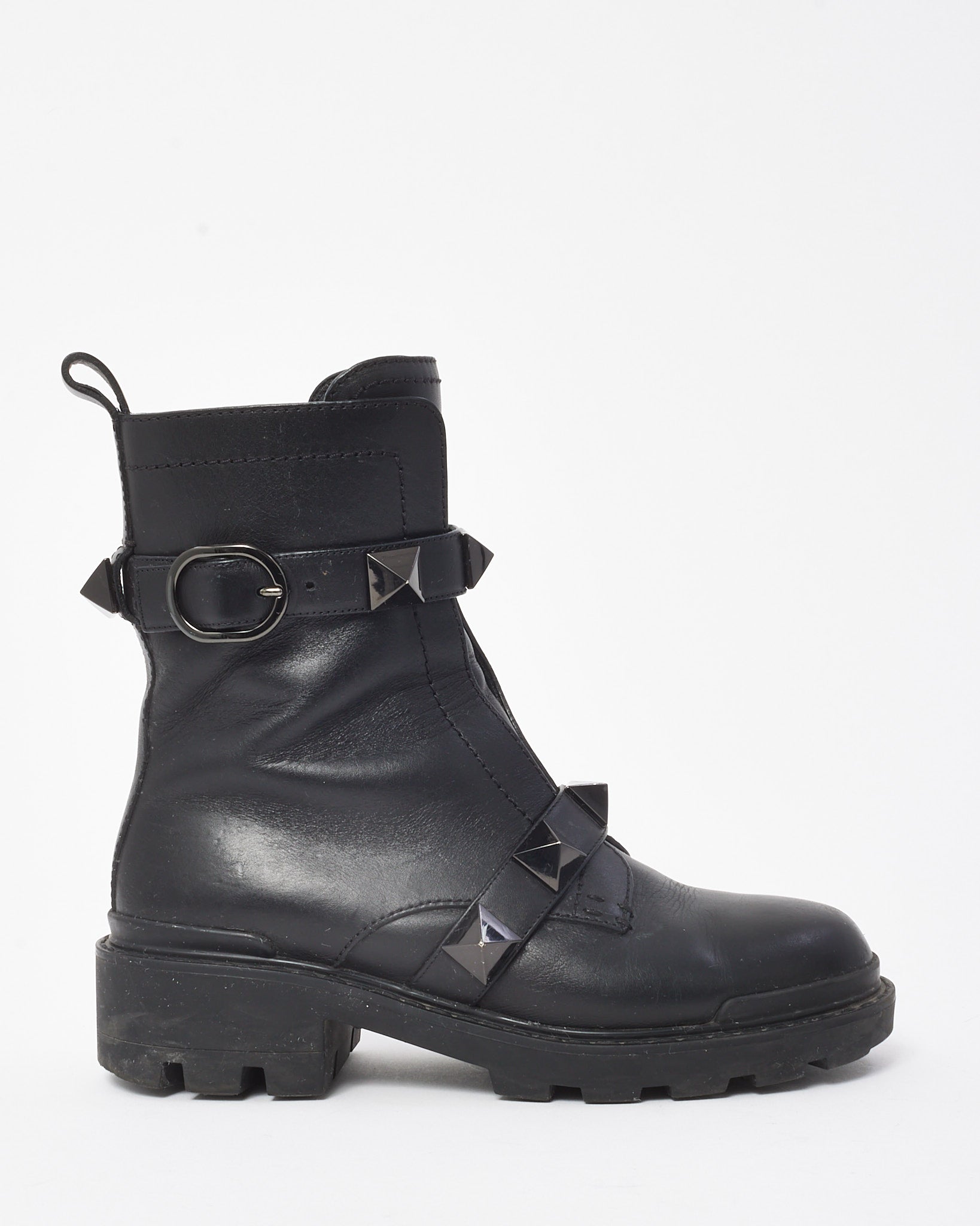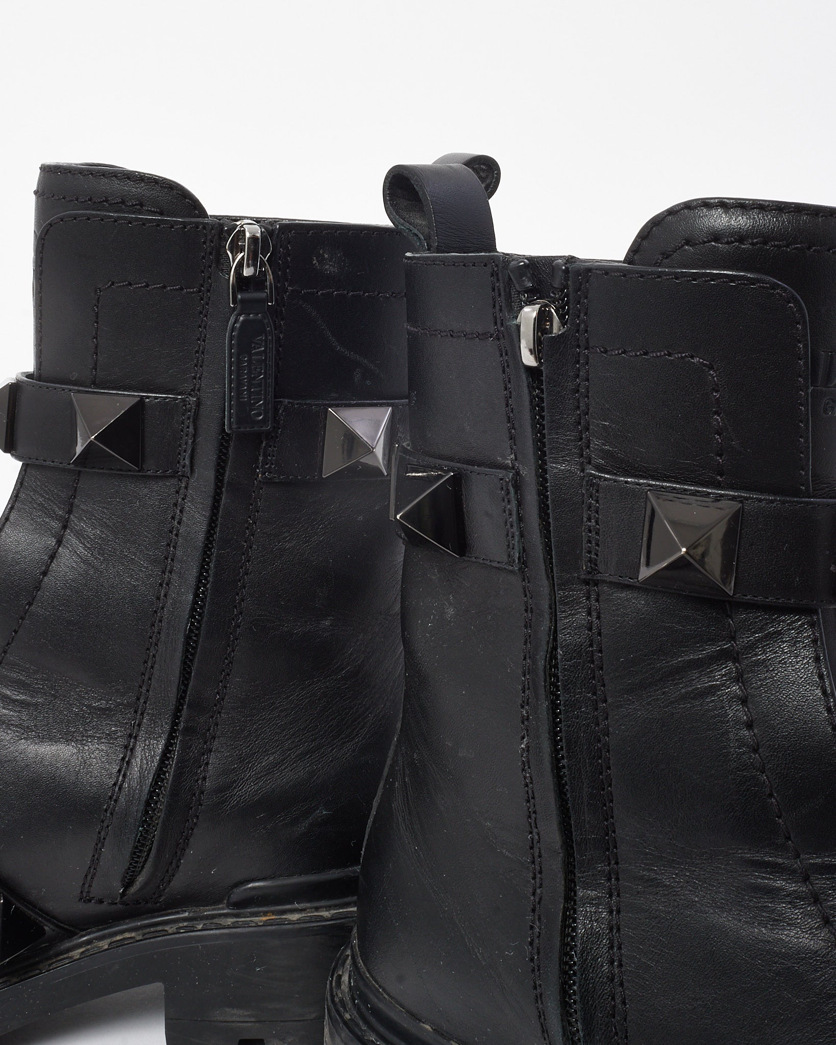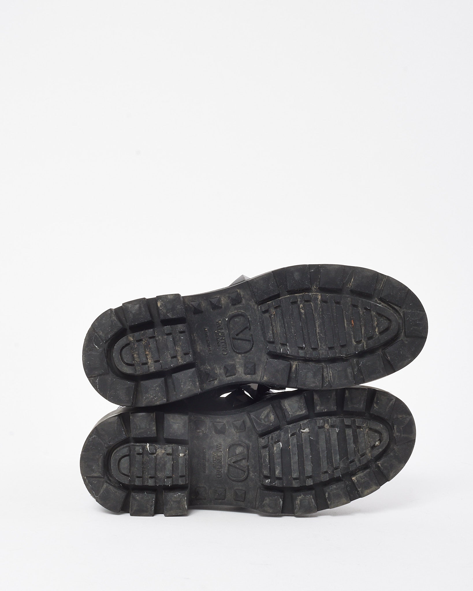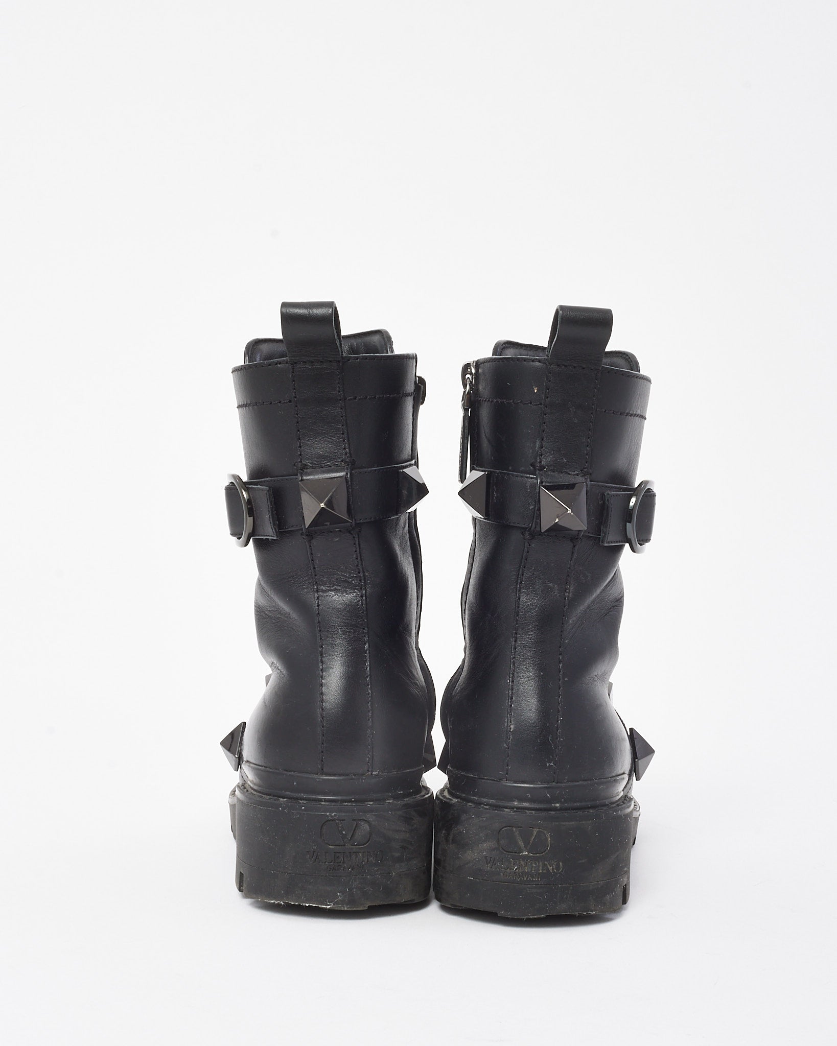 Toughen up your wardrobe with these pre-loved authentic Valentino Black Leather Rockstud Combat Boots in size 36.5. Expertly crafted from supple black calfskin leather, this edgy silhouette features lace-up styling, a rounded toe, and a durable rubber lug sole designed for comfort and traction. The signature Valentino Rockstud trim lines the heel and welt, delivering bold attitude with iconic edge. Finished with a practical side zipper for easy on and off, these Italian-made boots strike the perfect balance between street-style grit and high-fashion elegance. A standout pair to ground feminine dresses or elevate denim with confident flair.