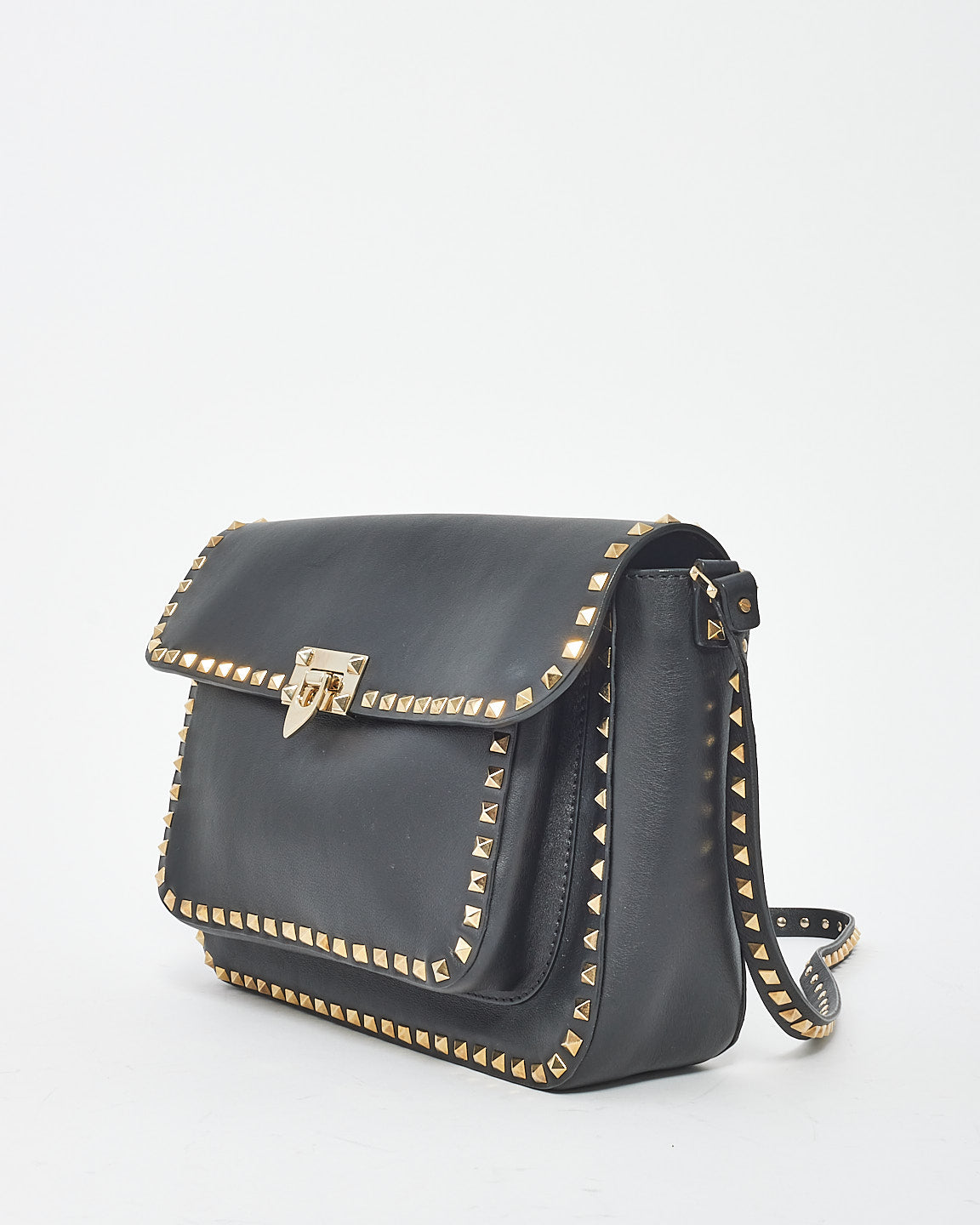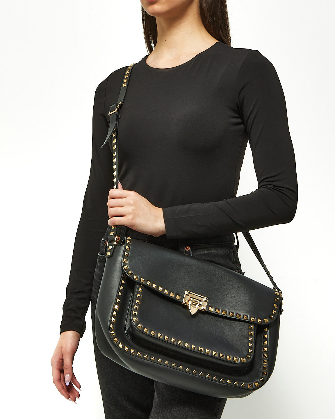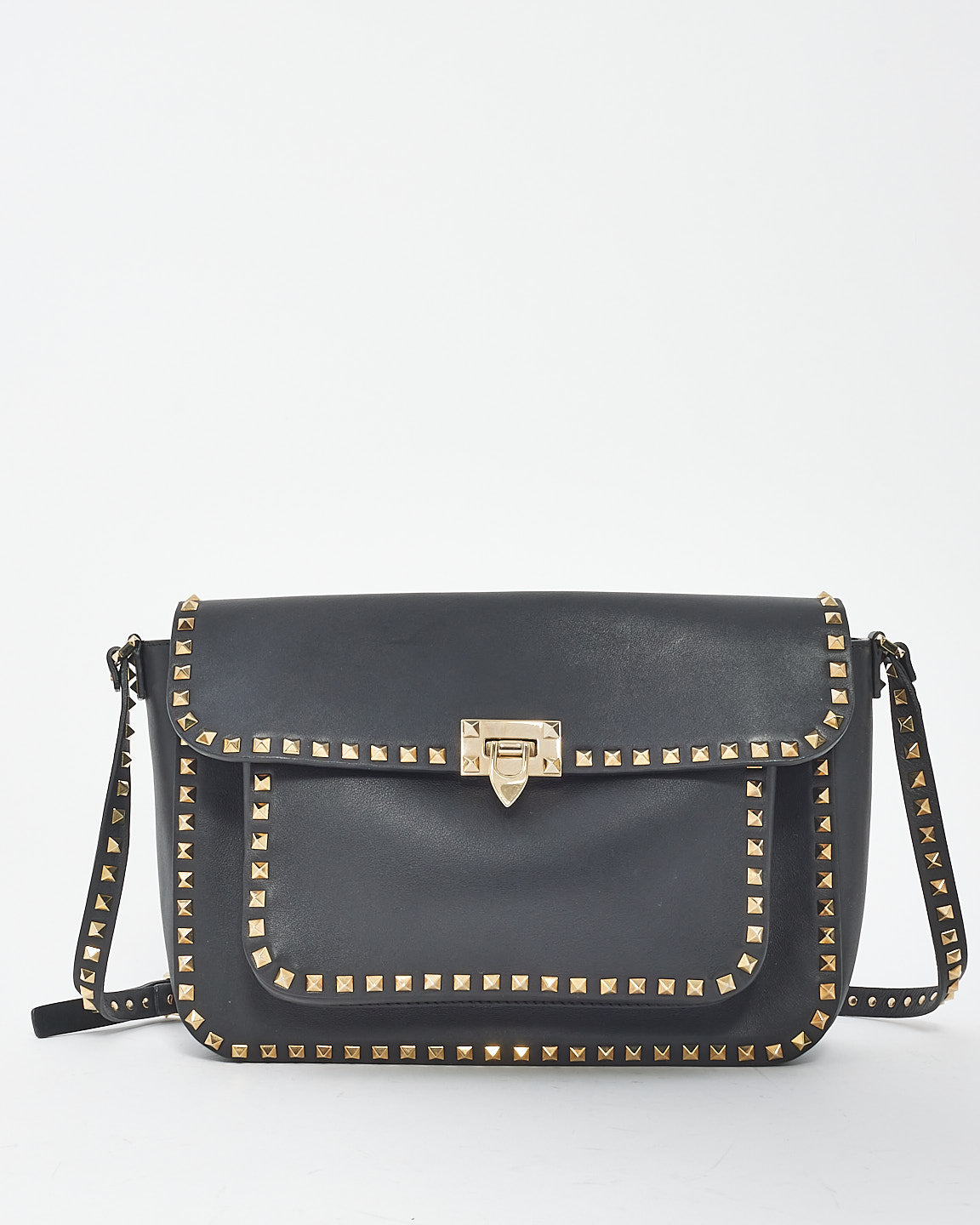Black Leather Front Pocket Flap Rockstud Crossbody Bag