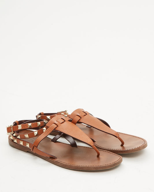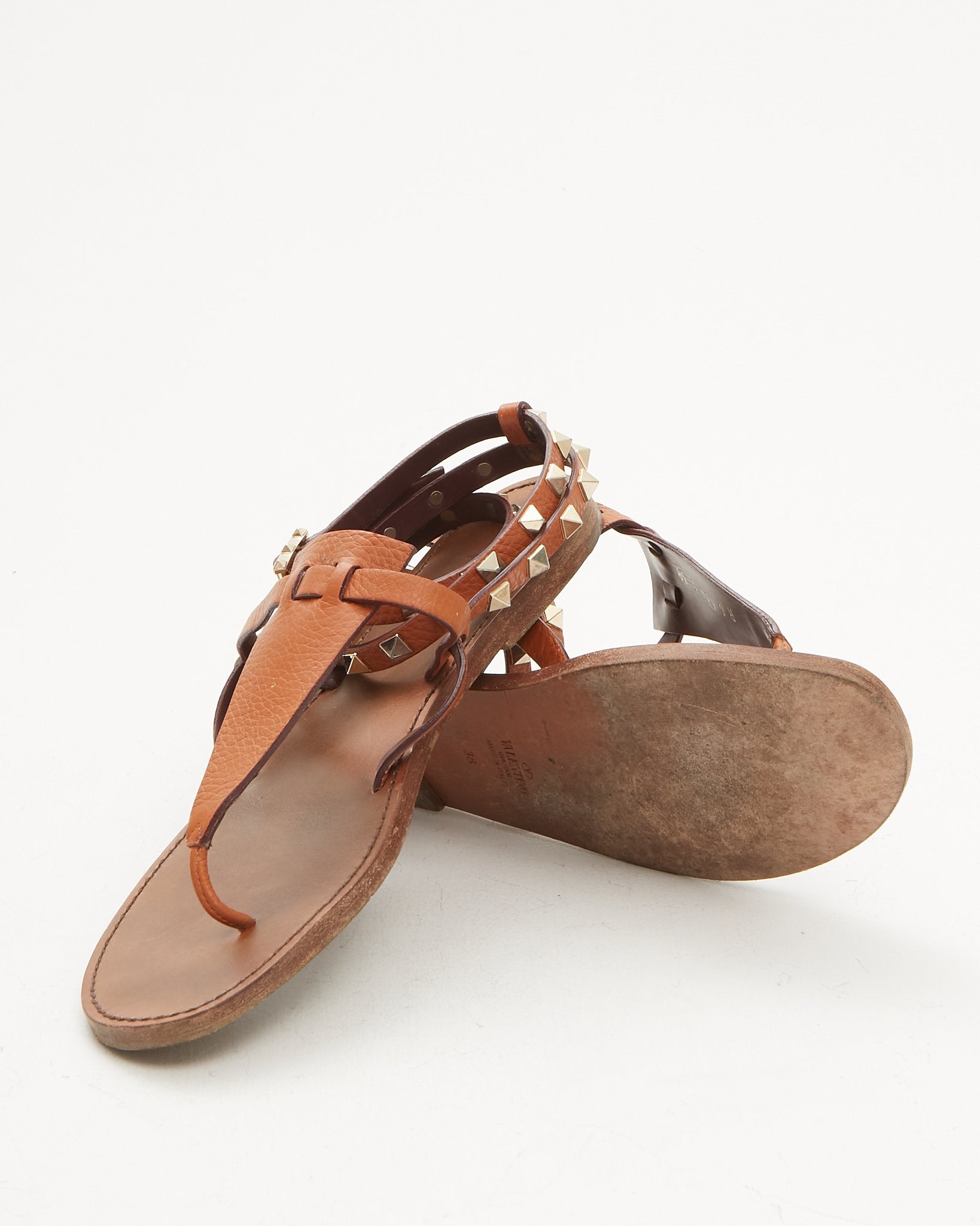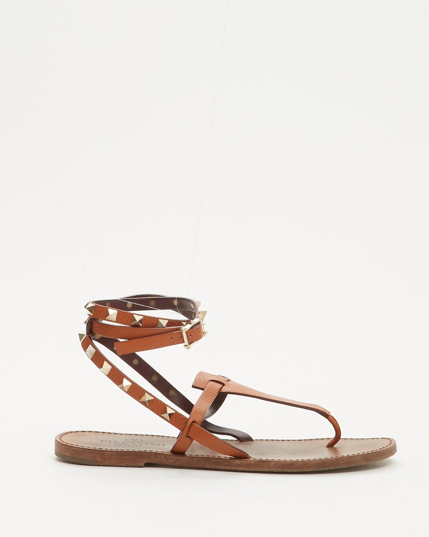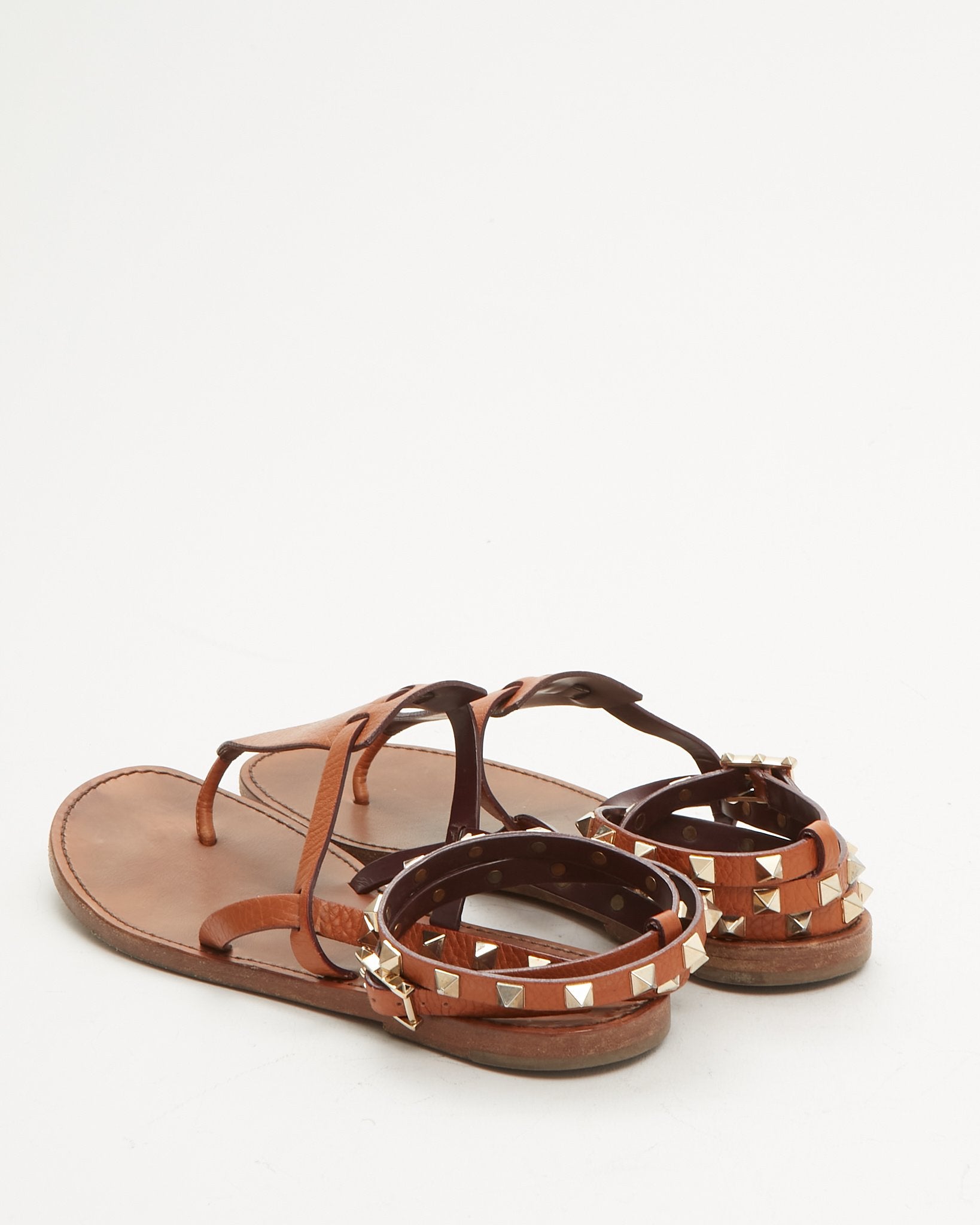 Tan Grained Leather Wrap Rockstud Sandals- 38