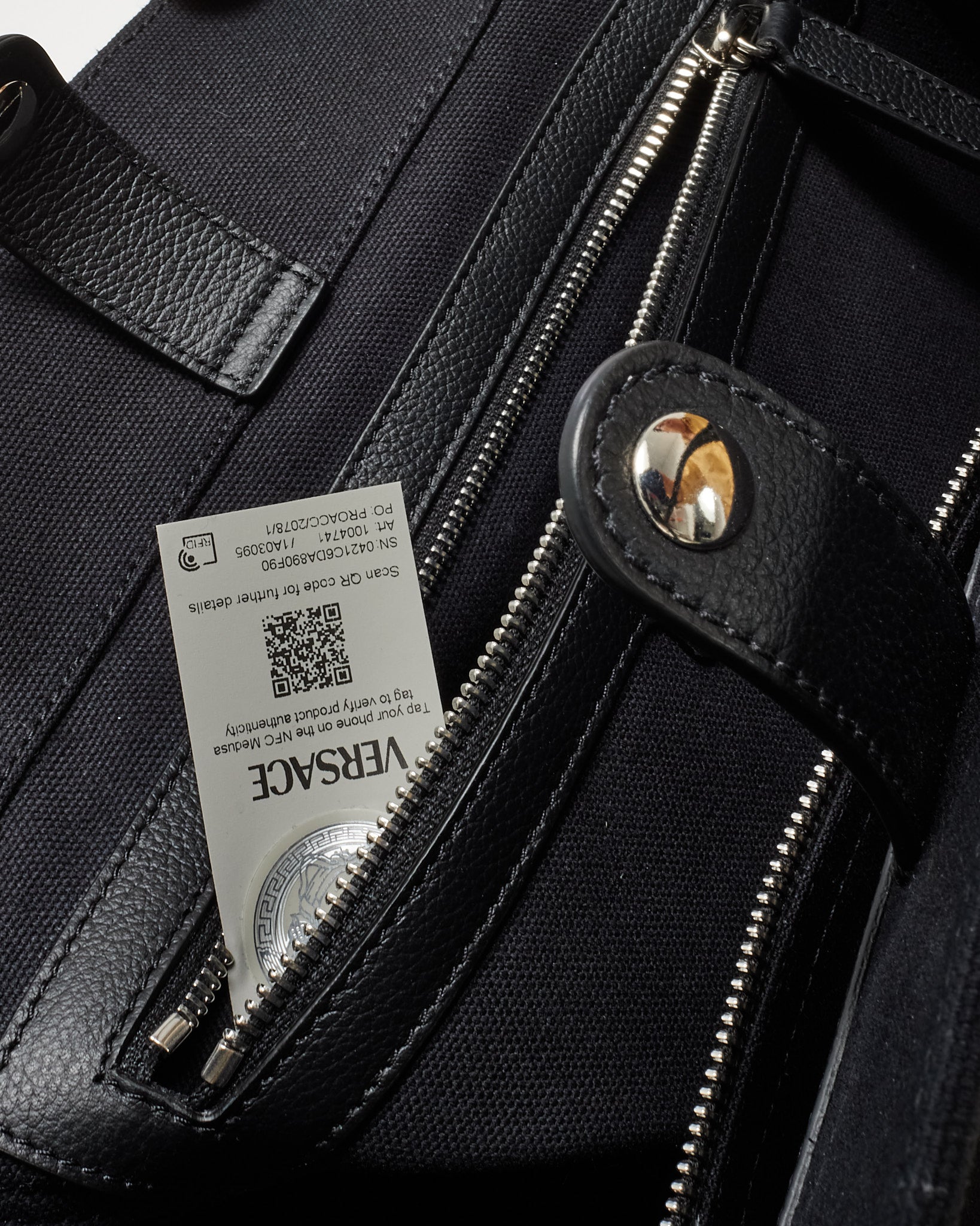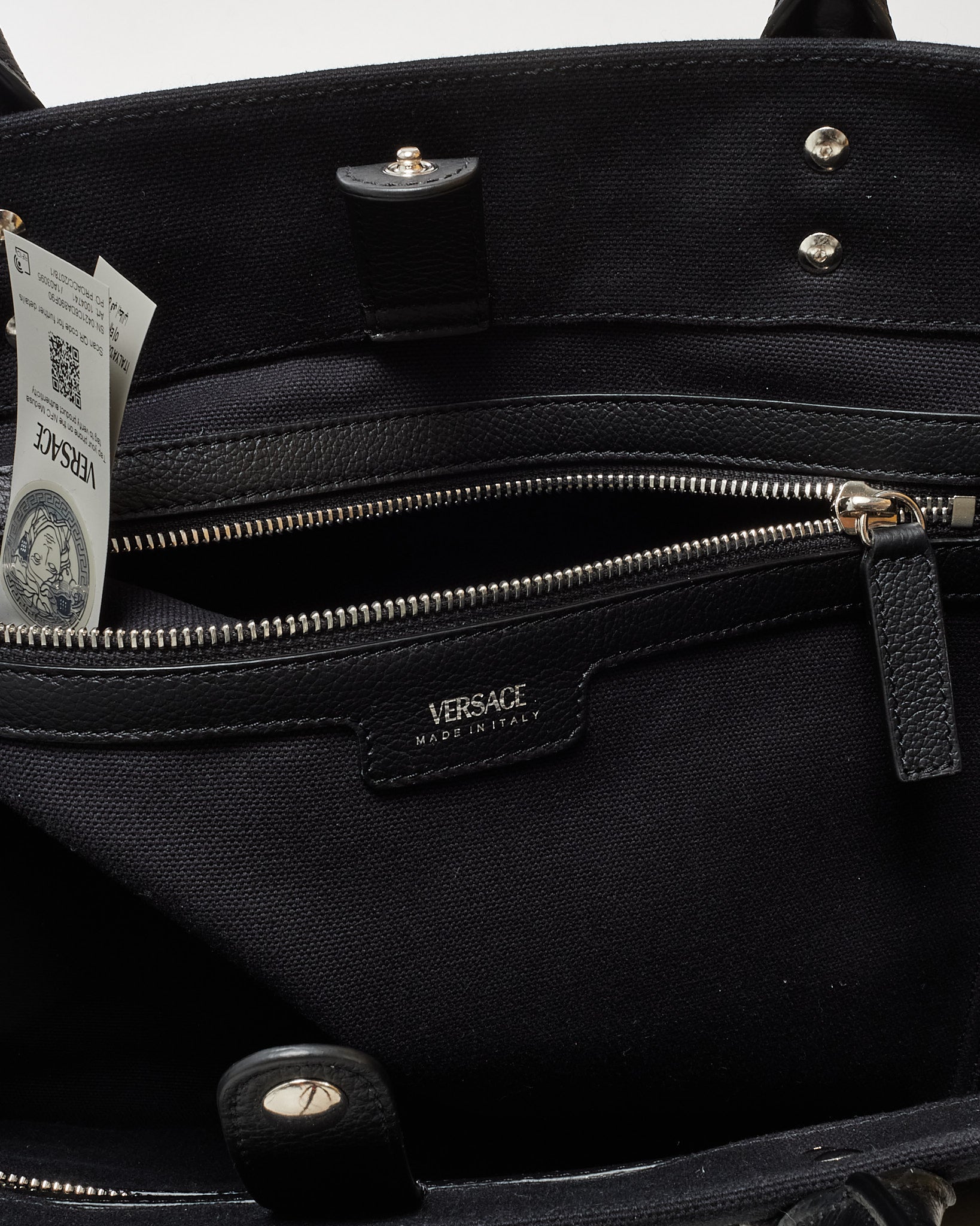 A statement of modern elegance, this pre-loved authentic Versace Black La Medusa Large Tote Bag is crafted from durable black canvas with a structured silhouette. Featuring the signature Medusa head emblem, this spacious tote offers a refined yet bold aesthetic, perfect for elevating both casual and polished looks. The open-top design and roomy interior make it ideal for everyday use, while the sturdy top handles ensure comfortable carrying. A versatile piece that blends iconic Versace style with practicality.