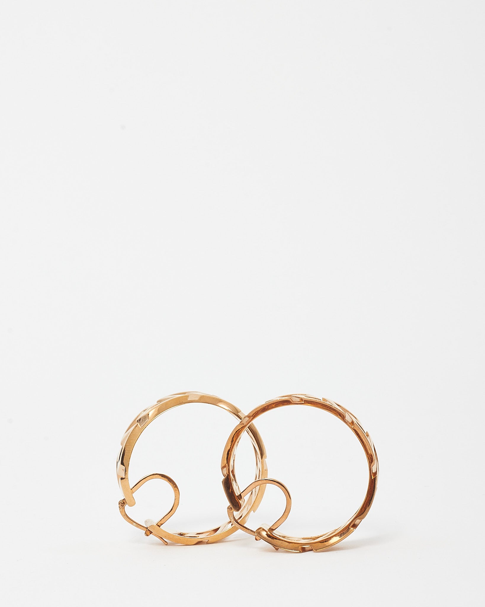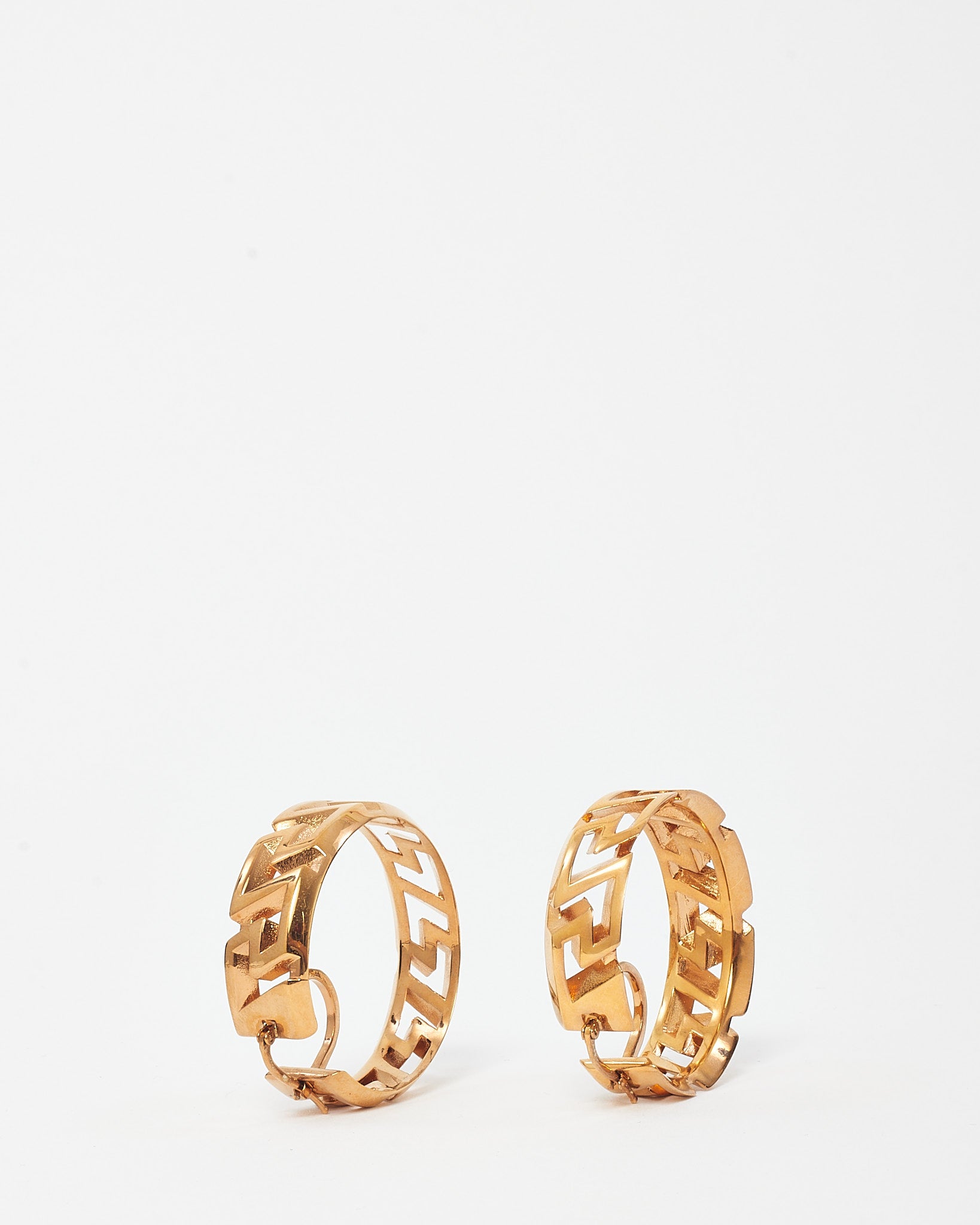 Elevate your accessories with these pre-loved authentic Versace Gold Versace Logo Hoop Earrings. Crafted from gleaming gold-tone metal, these bold hoops feature a sleek cutout of the iconic Versace logo, blending sculptural design with statement-making style. Lightweight and eye-catching, they offer a modern twist on a classic silhouette—perfect for day-to-night wear. With their striking presence and signature branding, these earrings bring unmistakable Versace glamour to any ensemble.