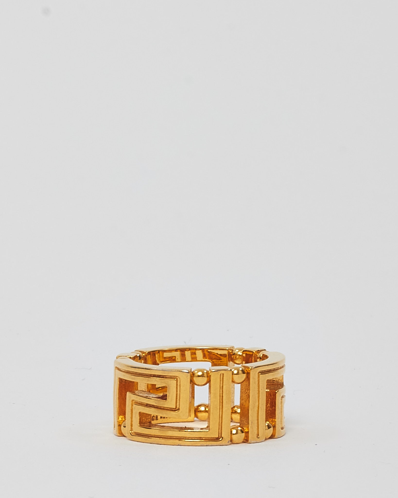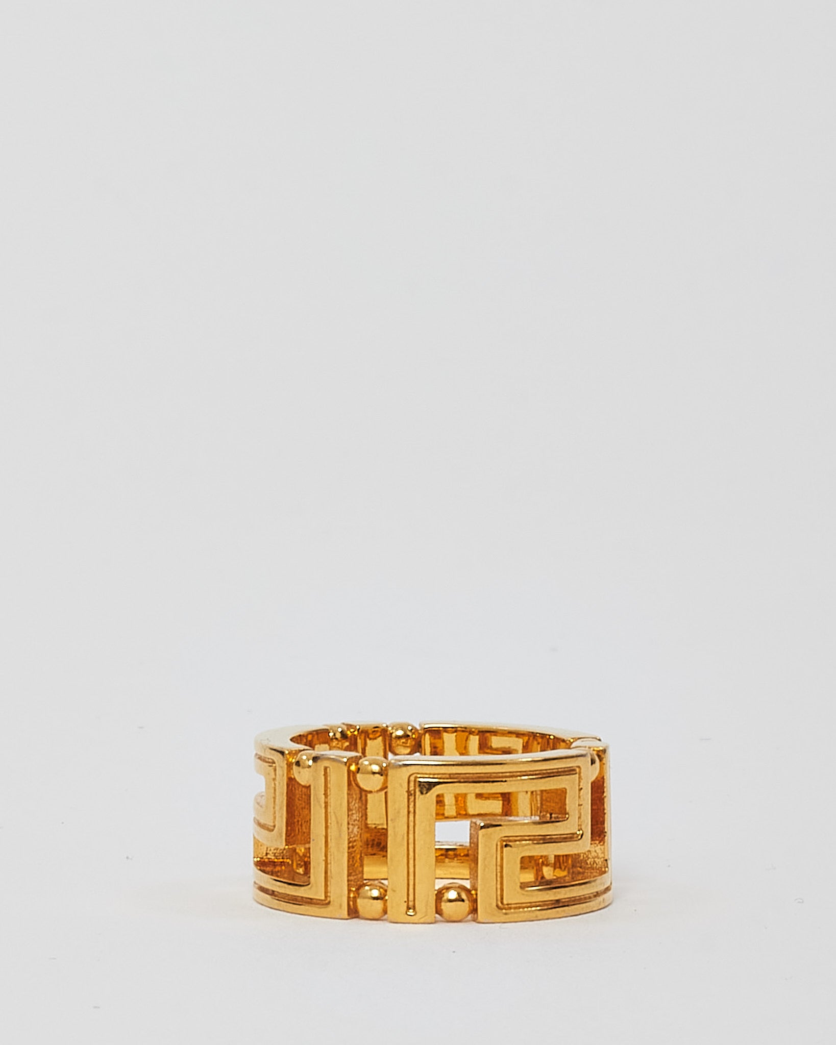 Add a sleek designer touch to your jewelry lineup with this pre-loved authentic Versace Gold Versace Logo Ring in size 4.5. Crafted from polished gold-tone metal, this minimalist band features a bold cutout of the Versace logo, offering modern edge with a refined finish. Its slim, sculptural silhouette makes it perfect for stacking or wearing solo as a statement piece. Subtle yet iconic, this ring embodies the brand’s signature blend of glamour and contemporary style.