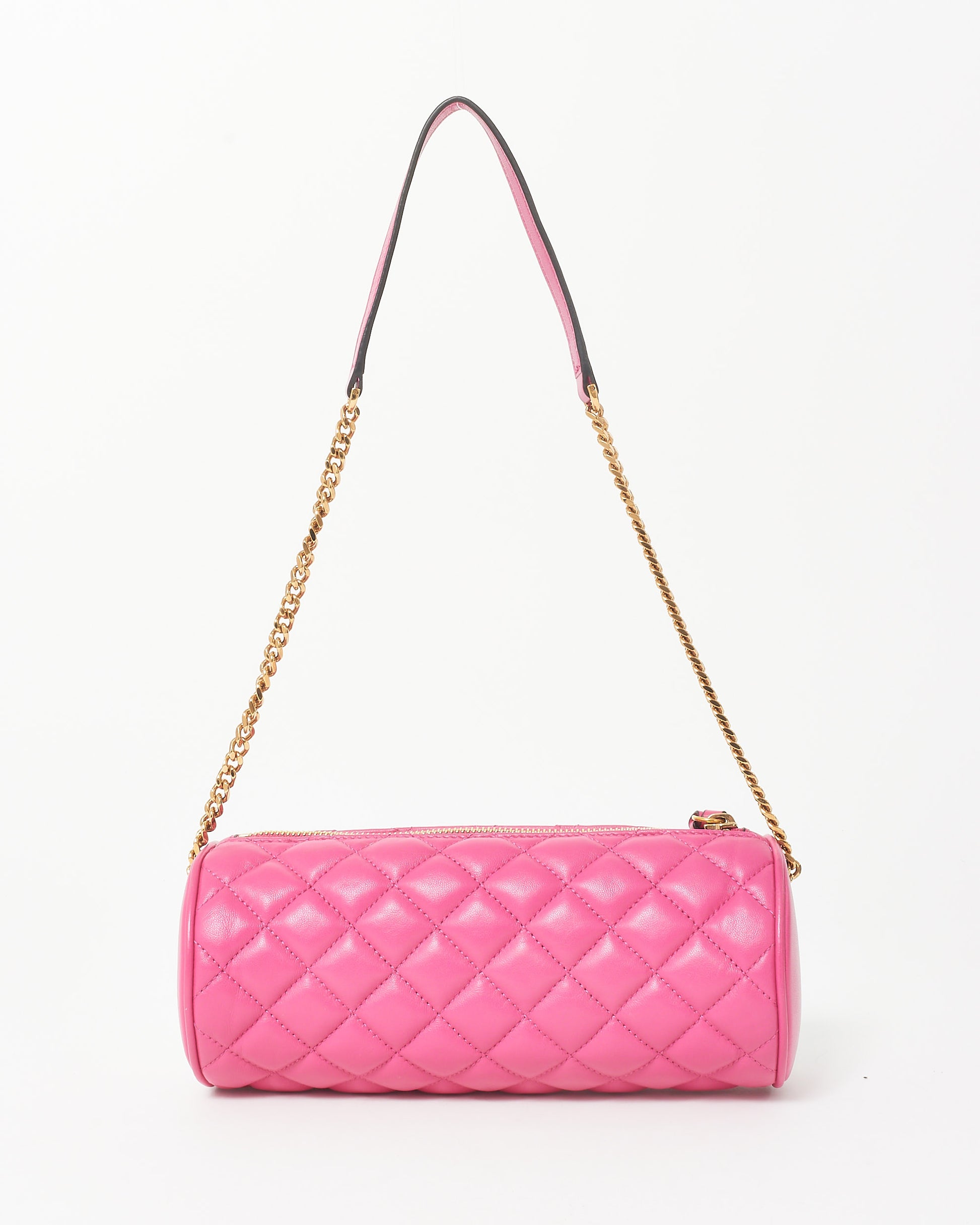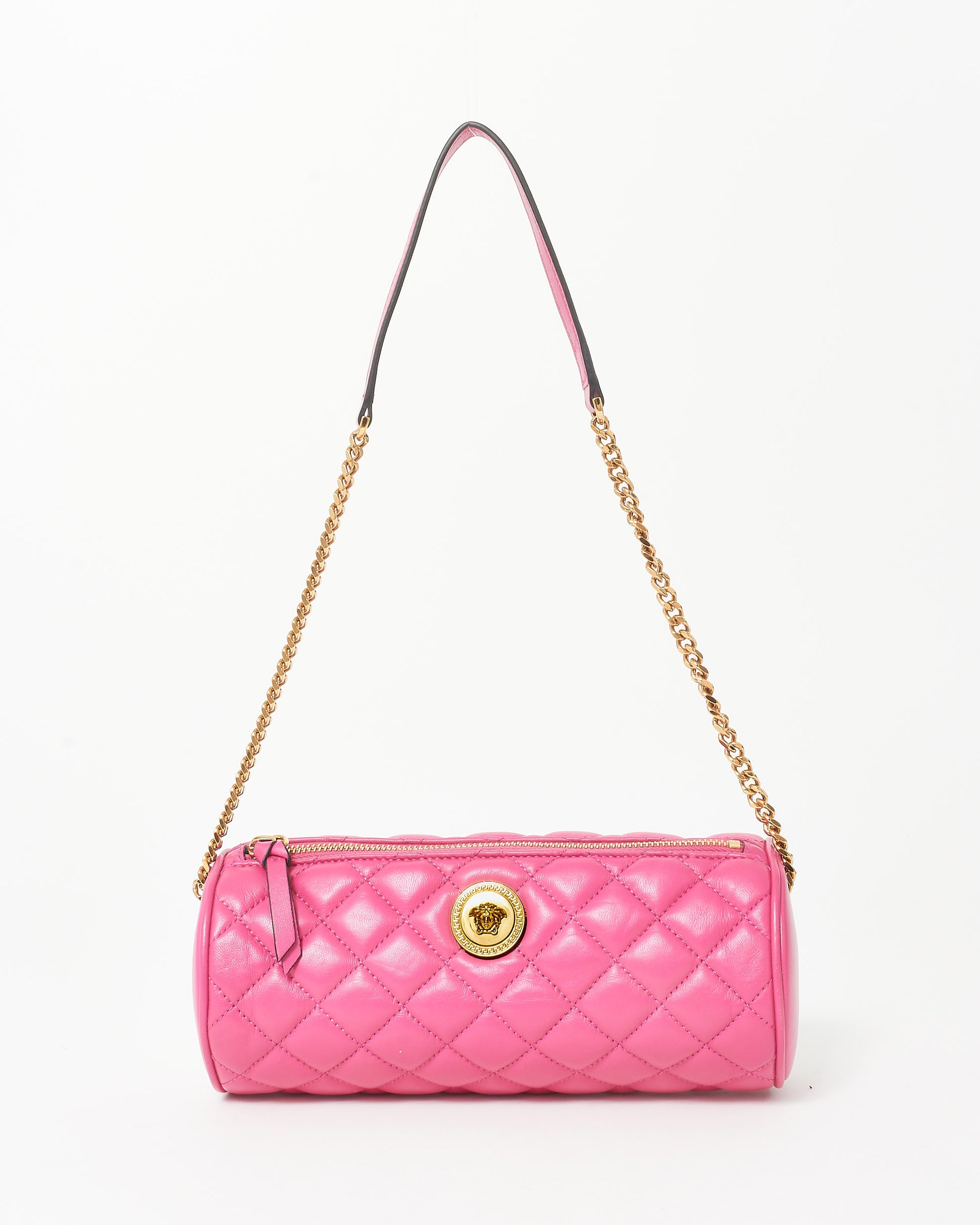 Discover luxury with the pre-owned authentic Versace Pink Leather & Gold Medusa Head Cylindrical Shoulder Bag – a statement piece that merges elegance with iconic design. Crafted from premium pink leather, this cylindrical shoulder bag is adorned with Versace’s signature gold Medusa head emblem, creating a bold, sophisticated look. Perfect for any stylish ensemble, this bag offers both glamour and versatility with a gold-tone chain shoulder strap, making it ideal for day-to-night wear. Elevate your style and express your individuality with this stunning Versace handbag.