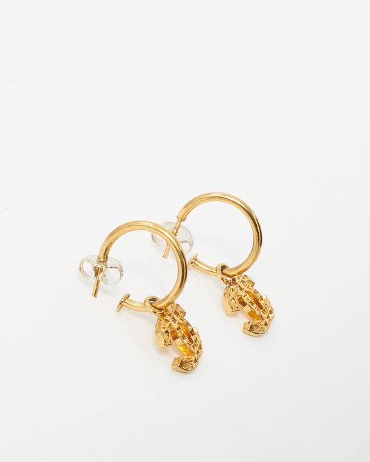 Gold Texture Metal Dangle Coco Mark CC Logo Hoop Earrings