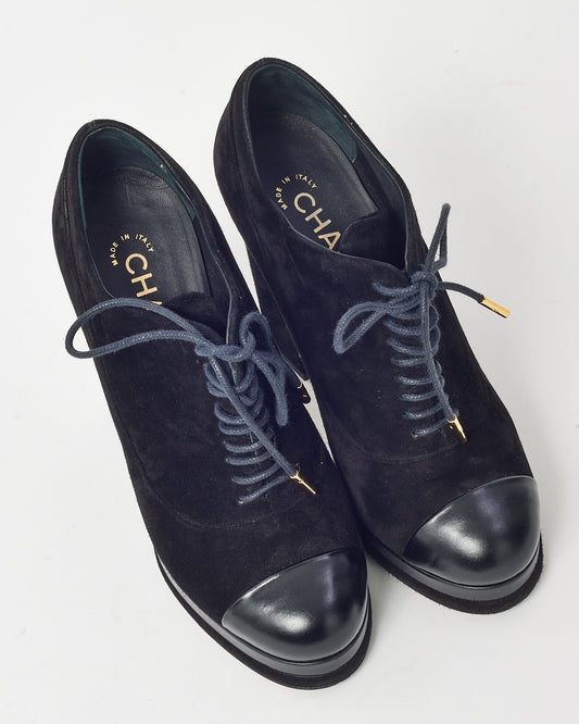 Black Suede Gold CC Logo Heel Lace Up Platform Booties - 38
