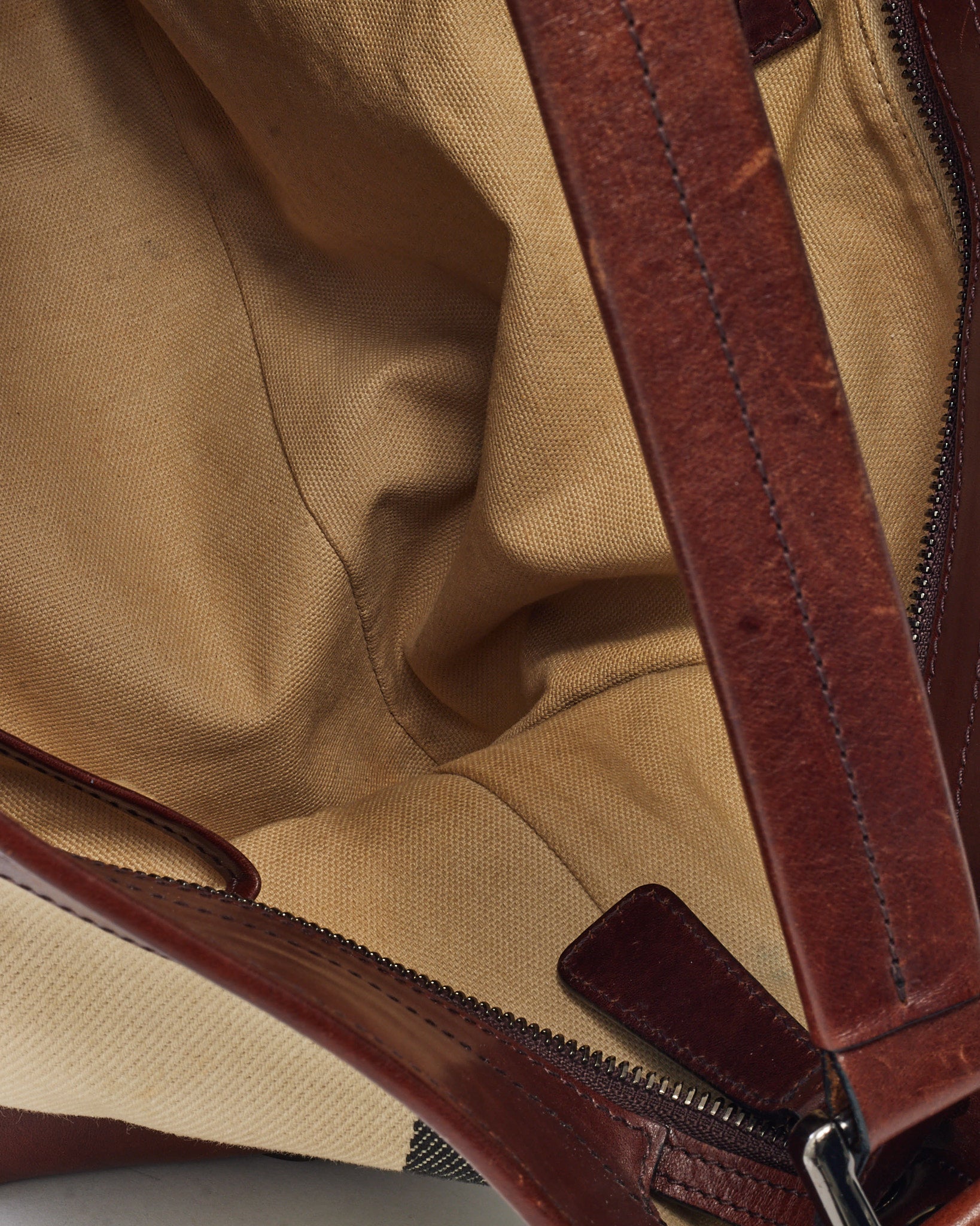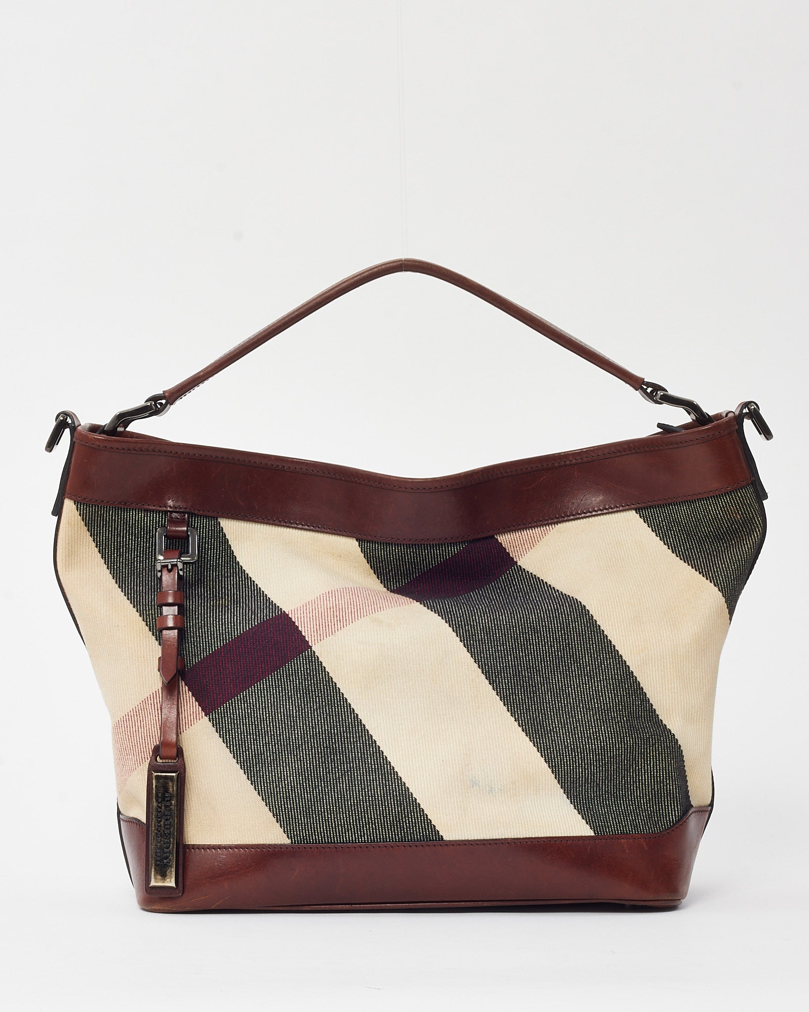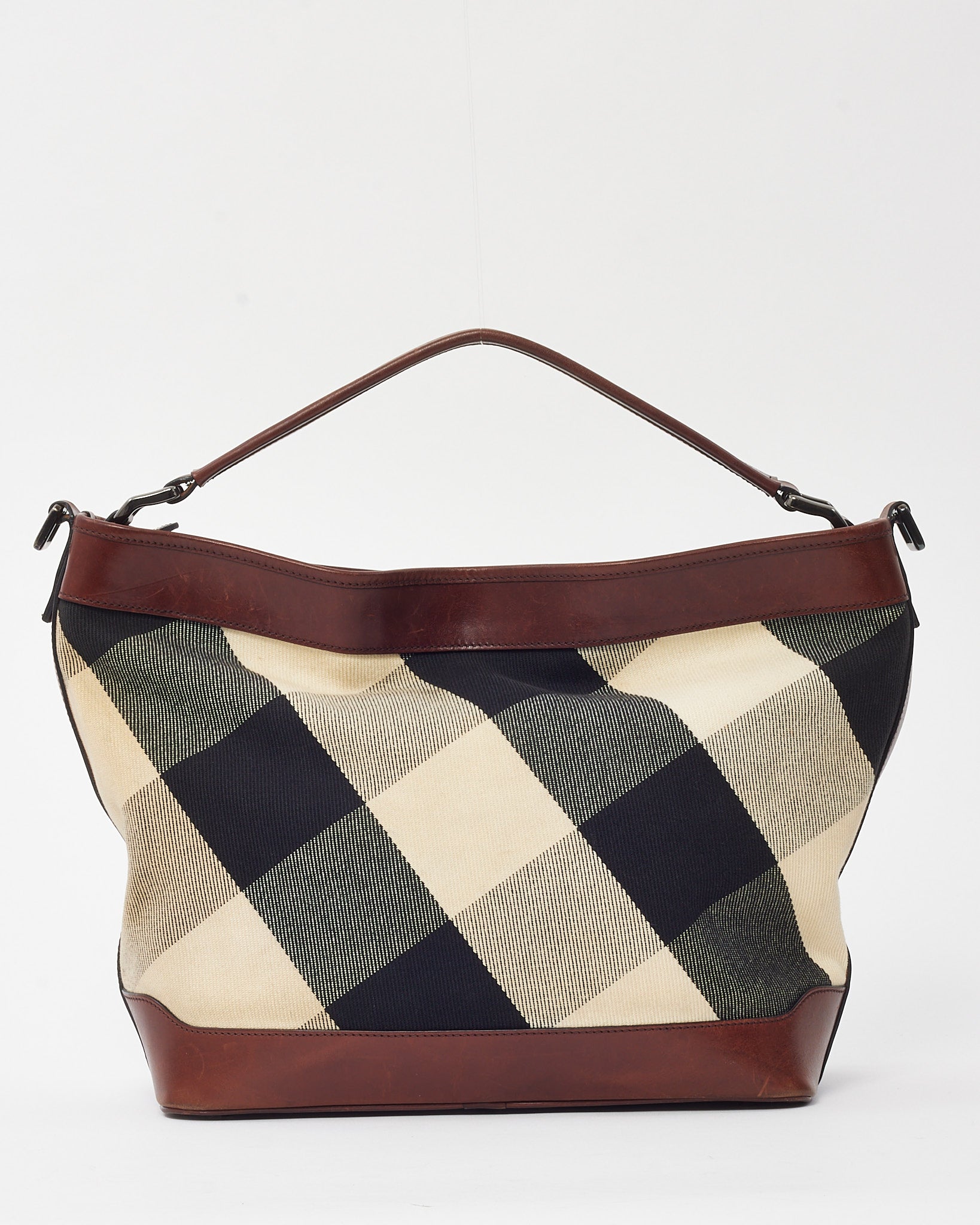 Brown Leather and Black/White Mega Nova Check Canvas Hobo Shoulder Bag