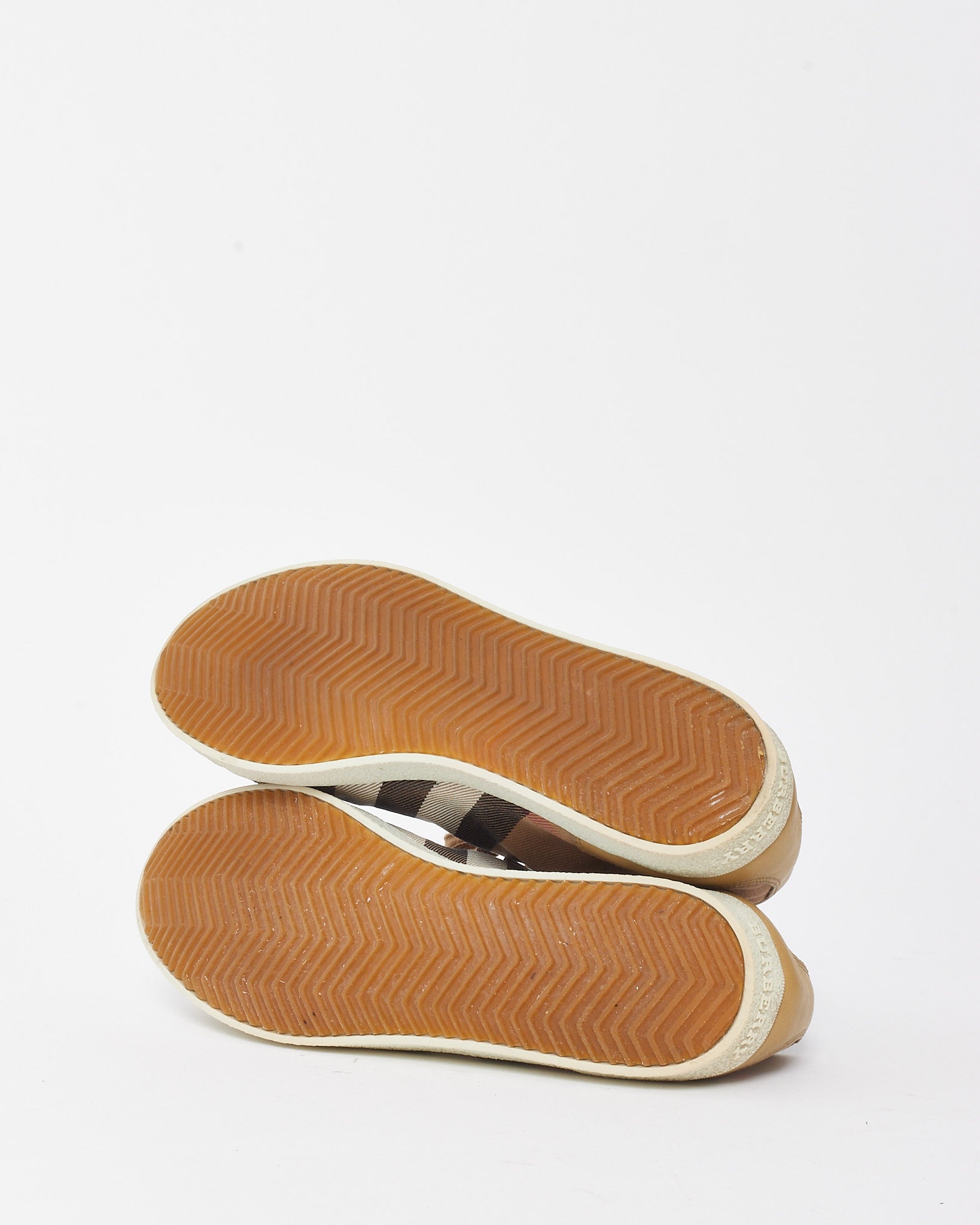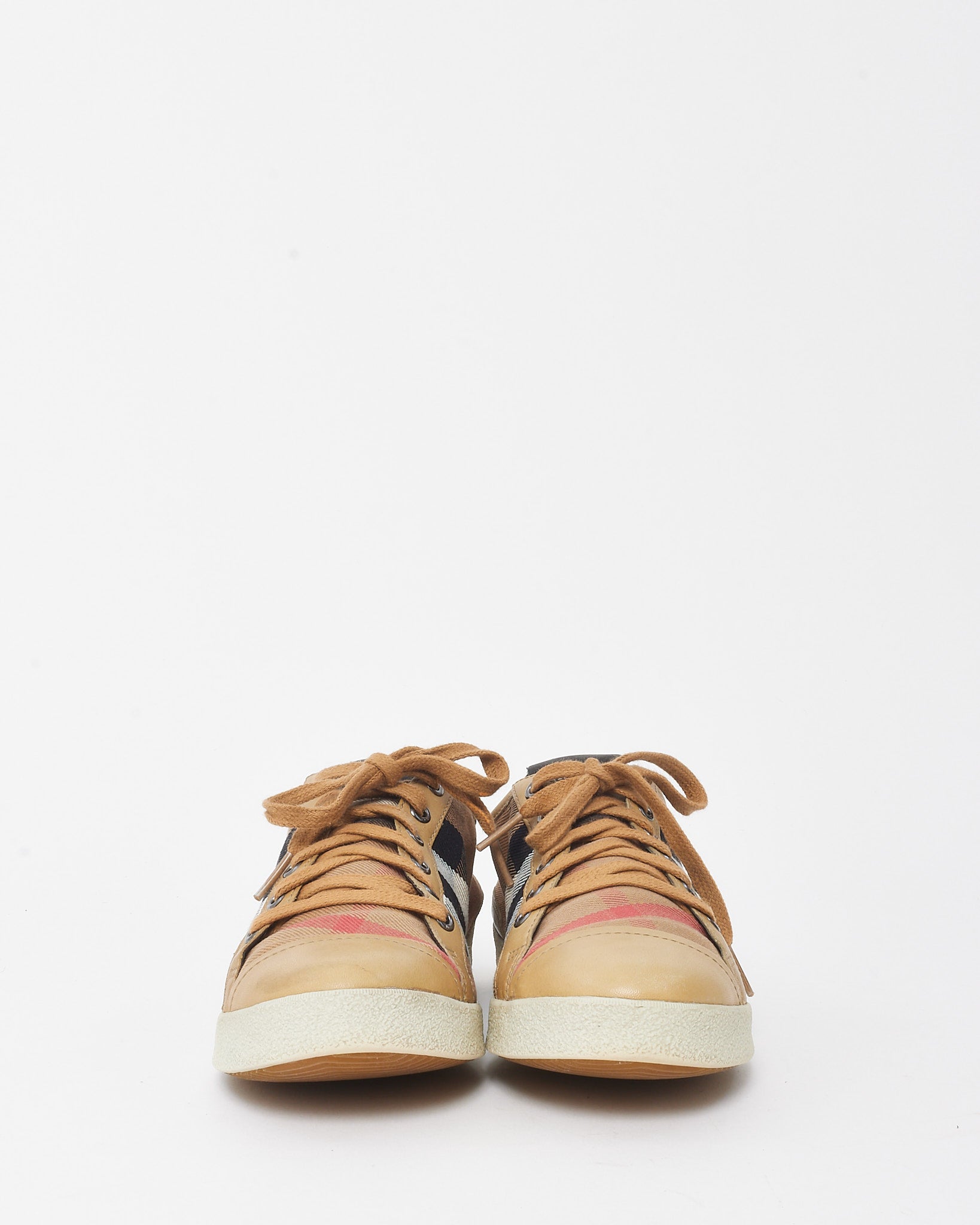 Step into timeless British style with these pre-loved authentic Burberry low top sneakers, crafted in classic beige Nova Check canvas with smooth leather accents. Designed with a lace-up front, padded collar, and durable rubber sole, this versatile pair blends iconic heritage with modern comfort. A signature statement for casual looks, perfect for weekend wear or travel-ready ensembles.