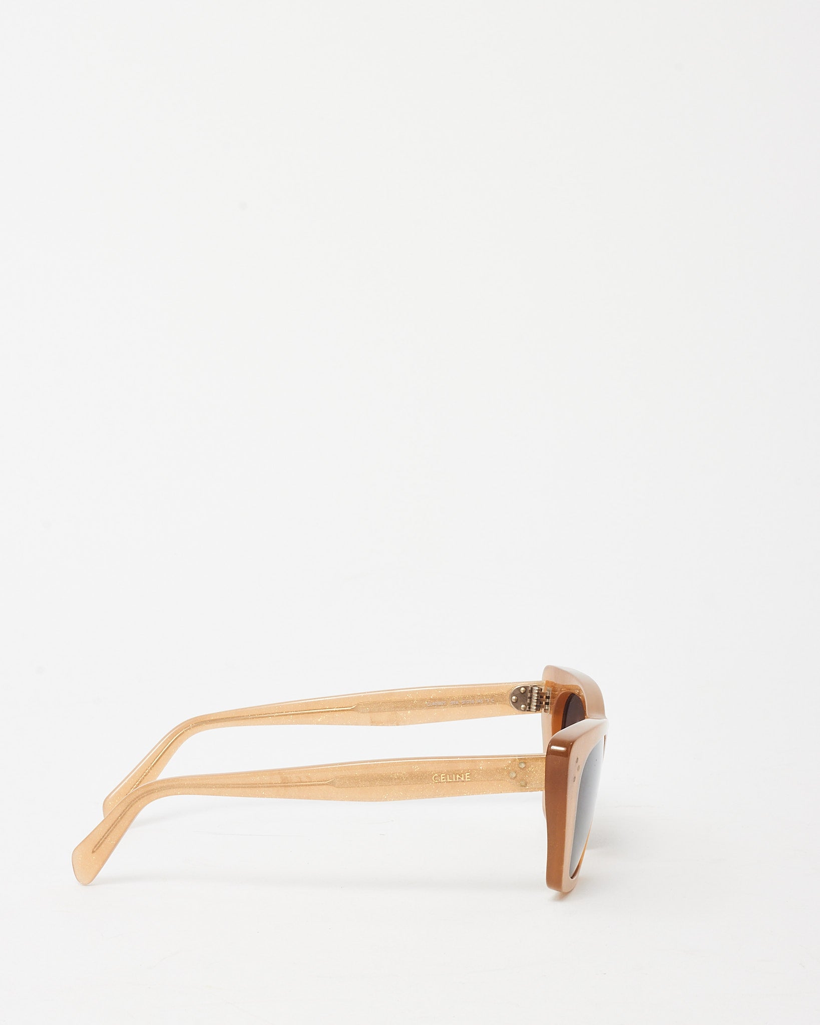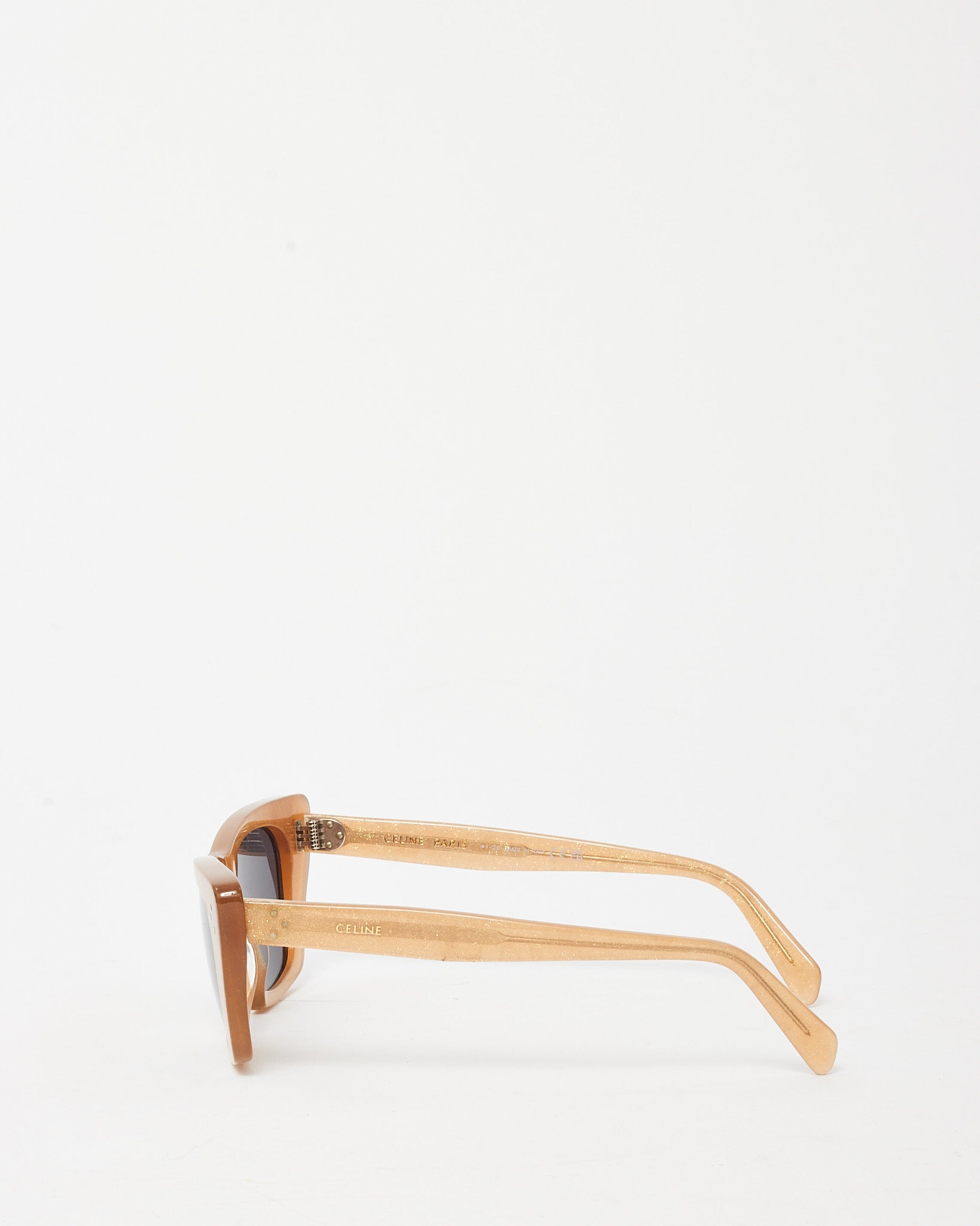 Add a touch of playful elegance to your accessories with these pre-loved authentic Celine Beige Glitter Acetate CL401871 Cat Eye Sunglasses. Crafted from subtly shimmering beige glitter acetate, this bold cat eye silhouette features sculpted angles and wide temples for a statement look. Gradient lenses provide full UV protection, while the discreet Celine logo at the temples adds a refined finish. A chic and confident choice for both casual and elevated styling.