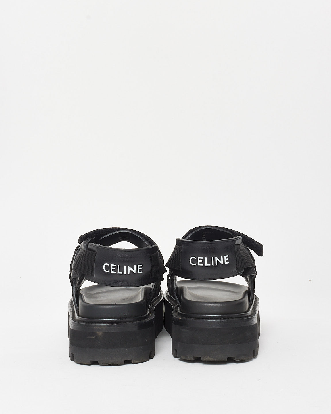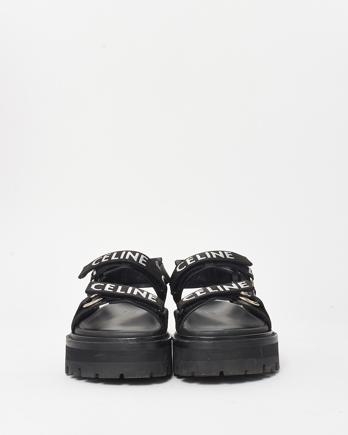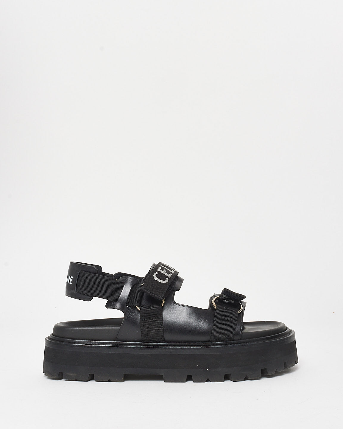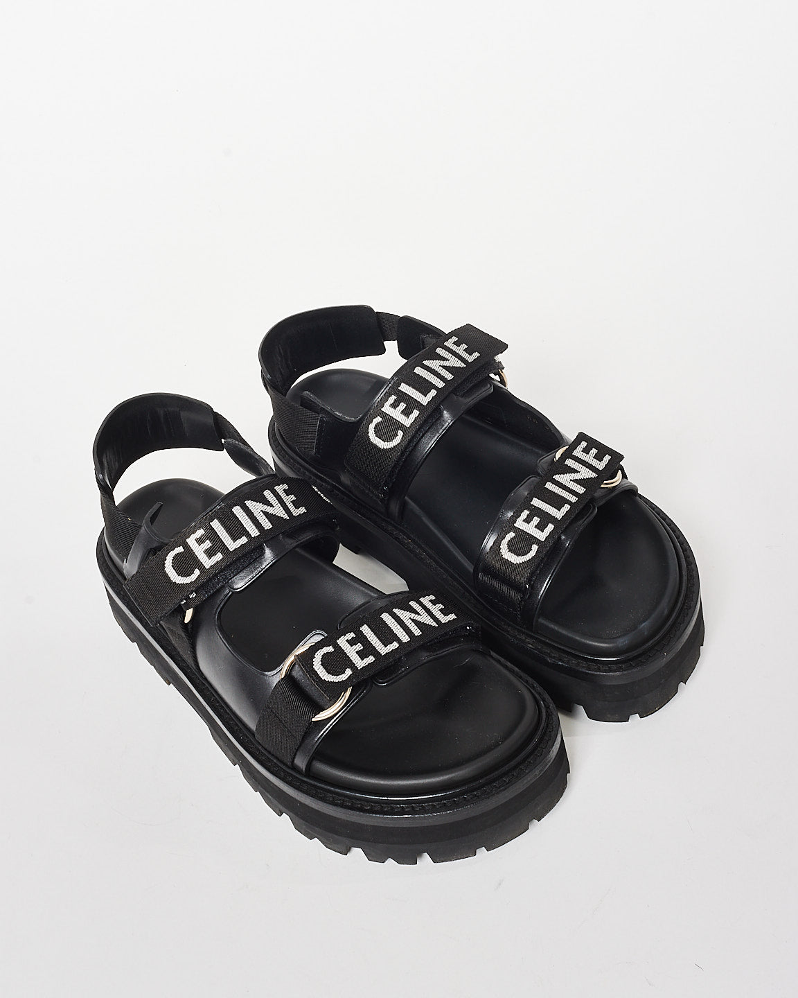Elevate your style with these 100% authentic pre-owned Celine Logo Print Lug Sole Dad Sandals - 40. Featuring a comfortable platform, these sandals also boast the iconic Celine logo on the secure straps for all-day wear. Perfect for adding a touch of luxury to any look!