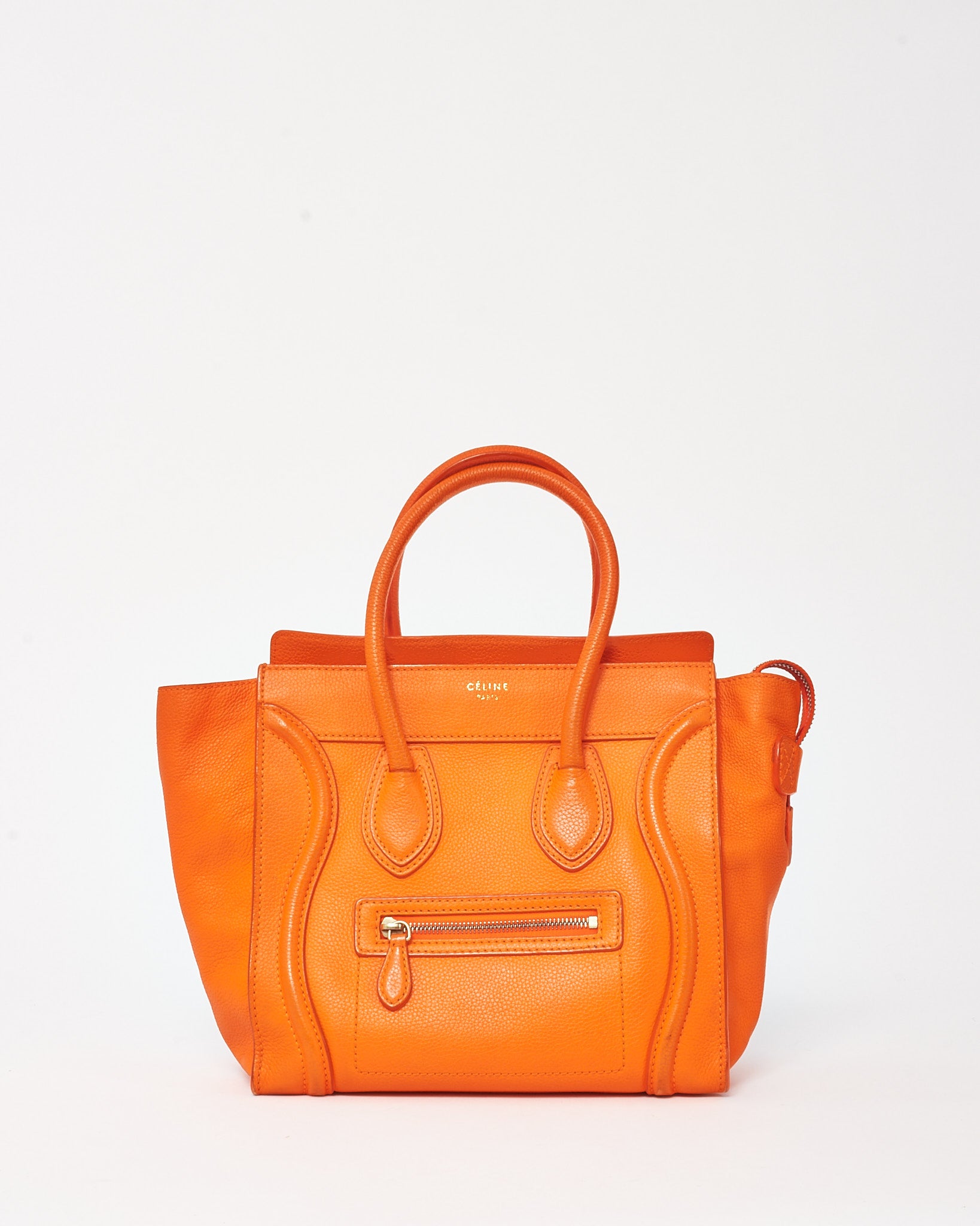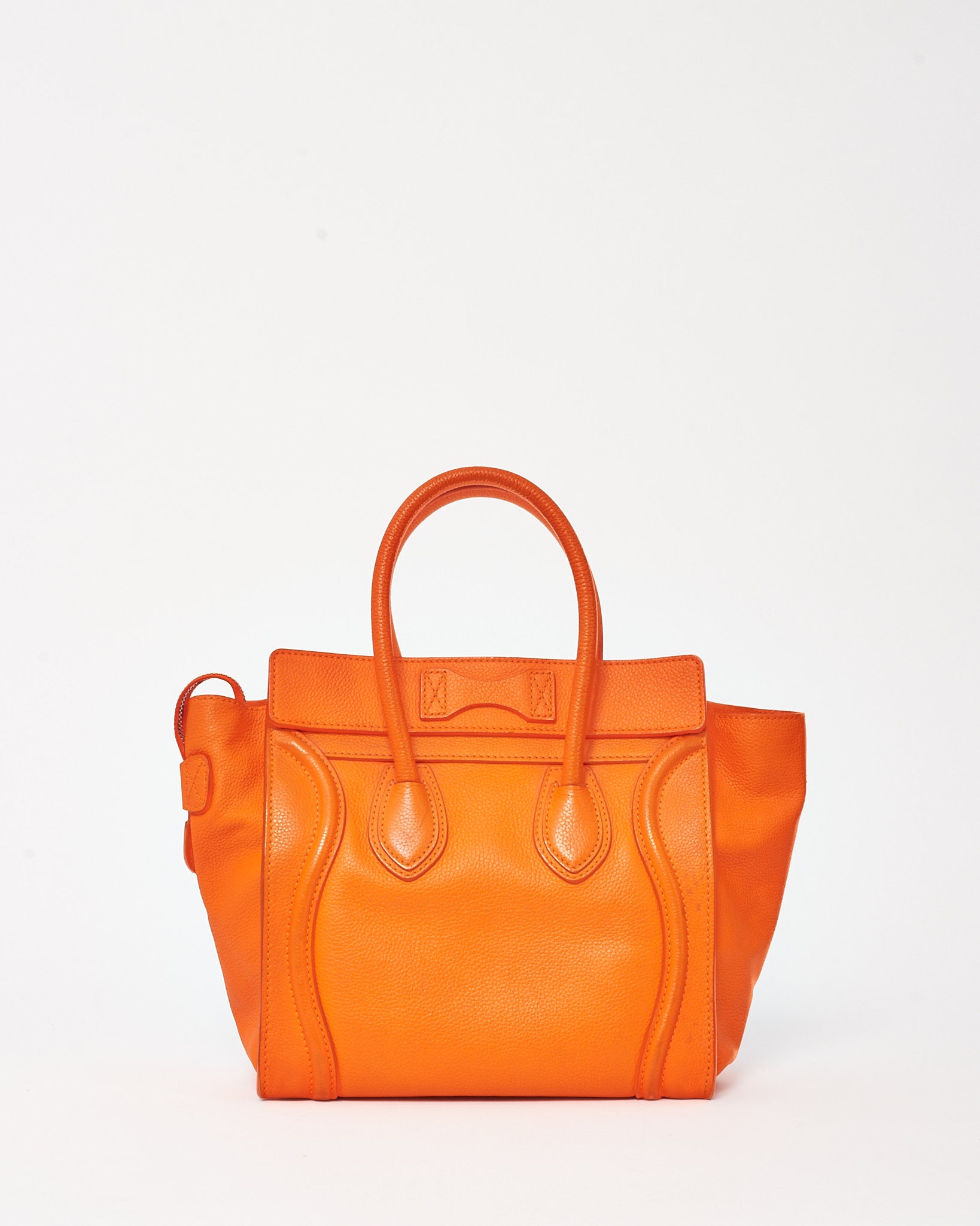 Bold and iconic, this pre-owned authentic Celine Mini Luggage Tote is crafted from vibrant orange grained leather with the signature curved front panel and winged silhouette. Finished with rolled top handles, a front zip pocket, and a structured open interior, it blends function with high-fashion appeal.