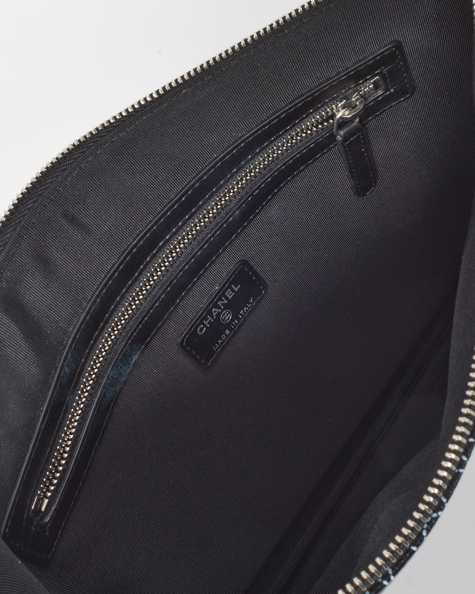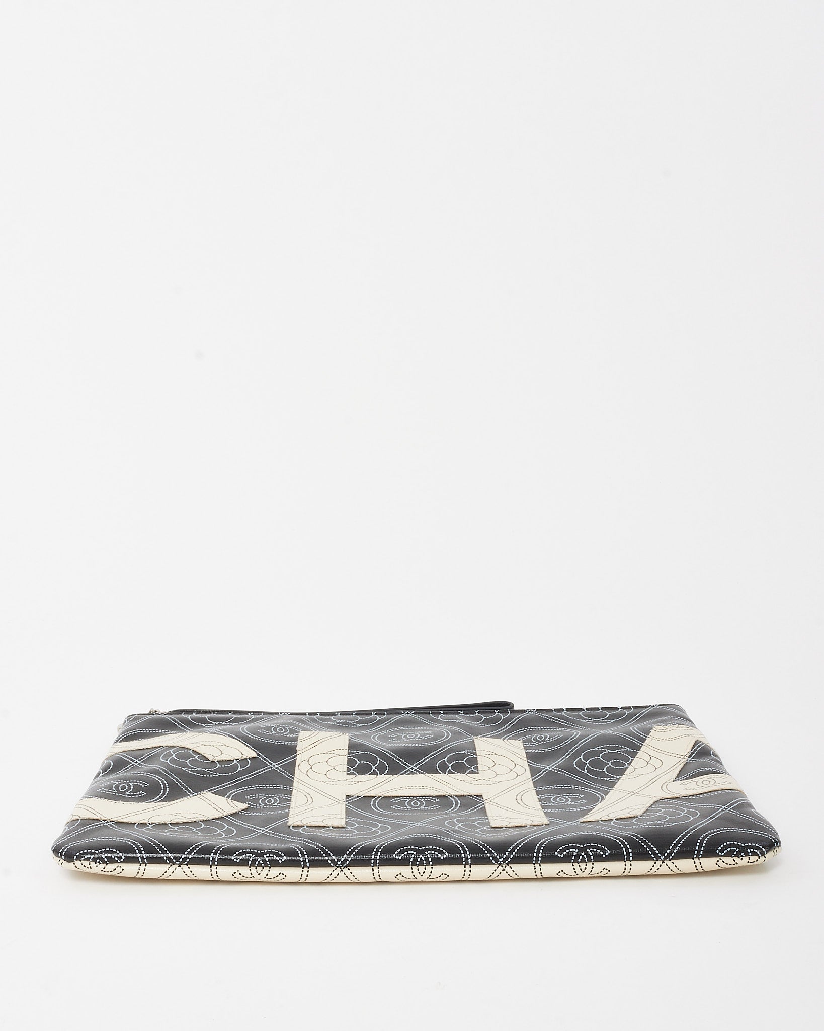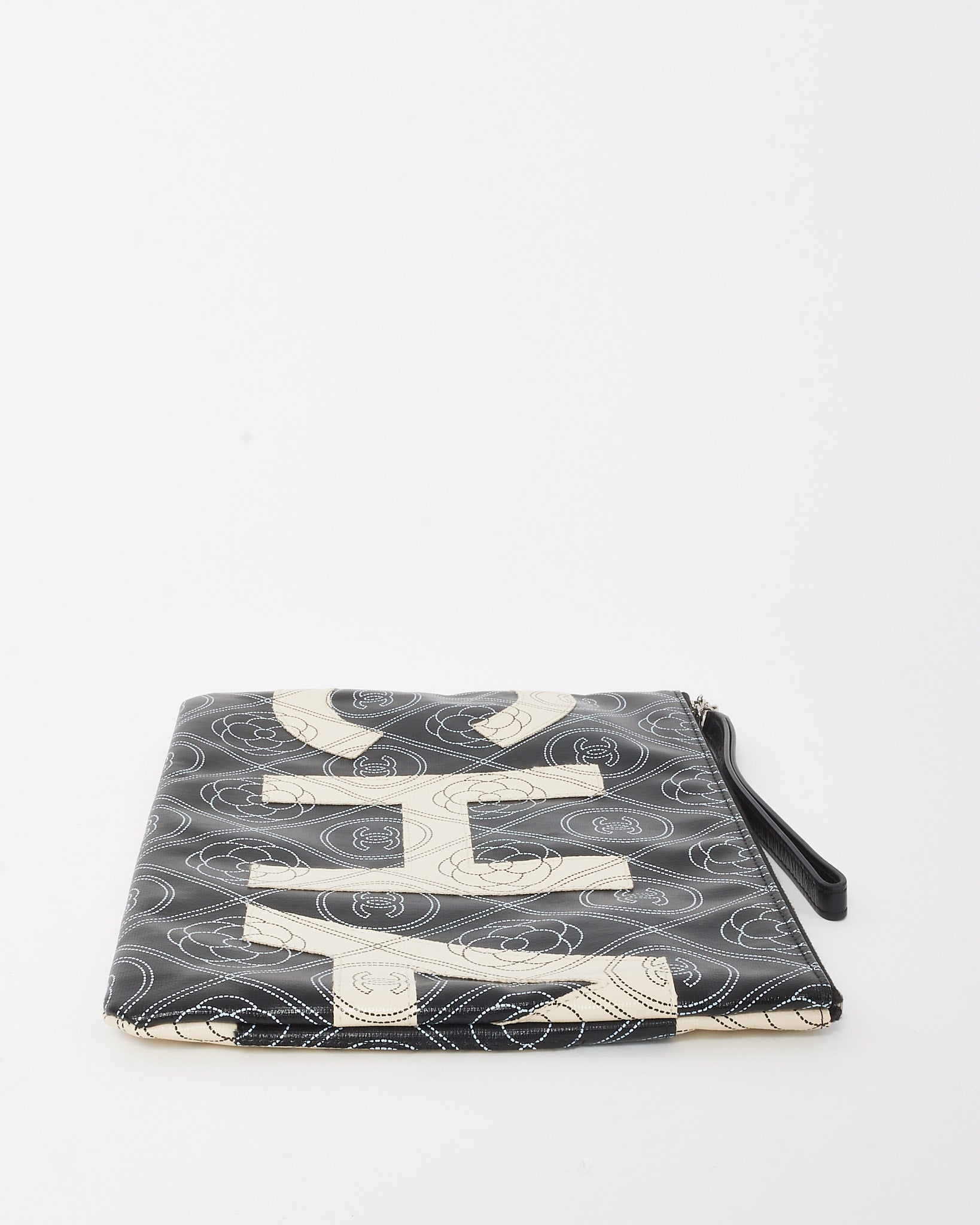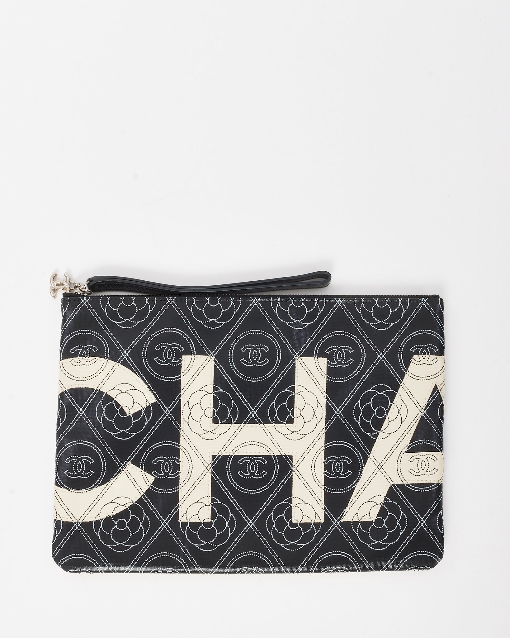 A bold fusion of artistry and function, this pre-loved authentic Chanel Maxi O Case Wristlet Pouch is crafted from coated black and white canvas featuring the signature Camellia motif. Designed in a spacious silhouette with a top zip closure and wristlet strap, it balances everyday practicality with unmistakable Chanel elegance. Perfect for organizing essentials or carrying solo, this striking accessory adds graphic sophistication to any curated luxury collection.