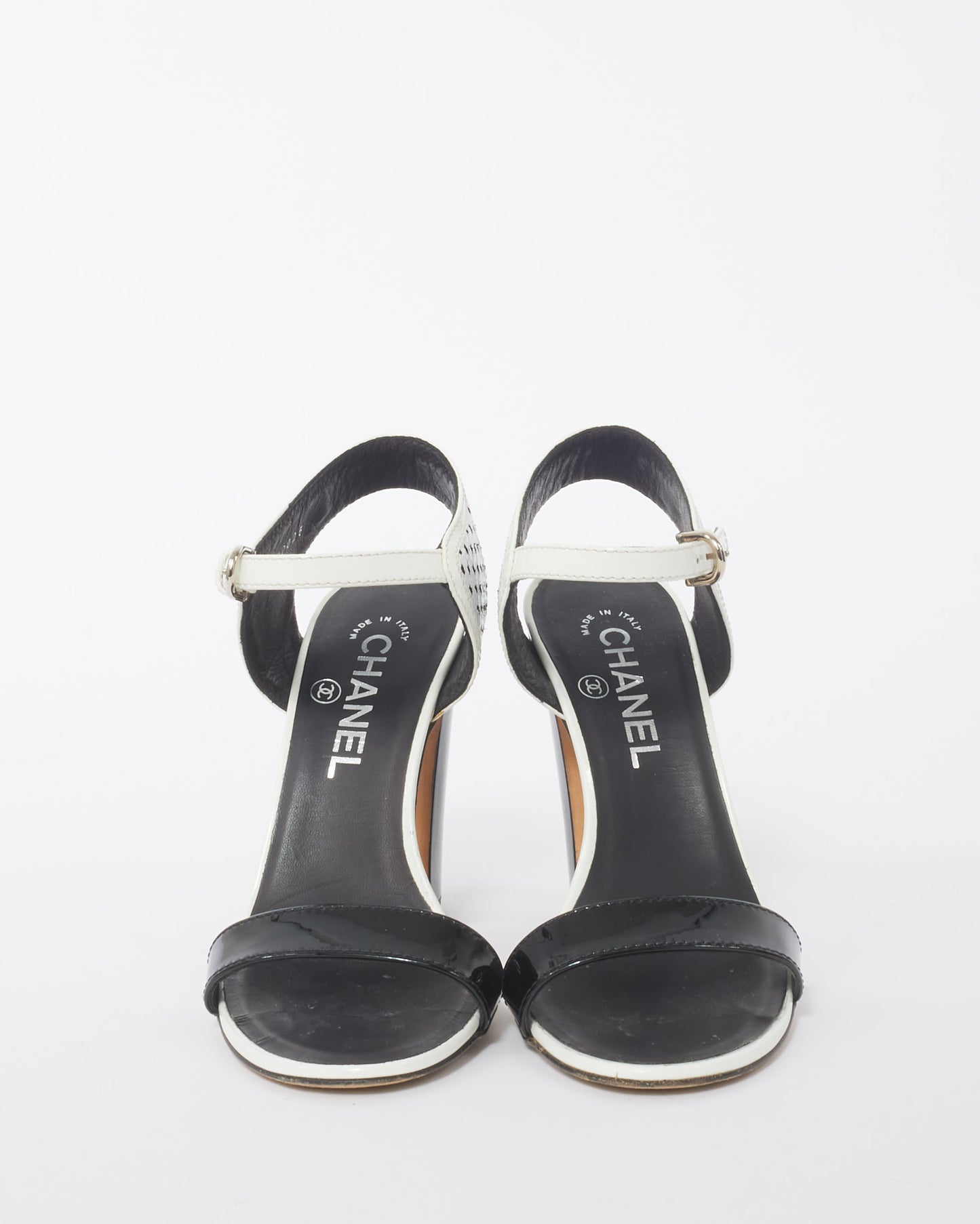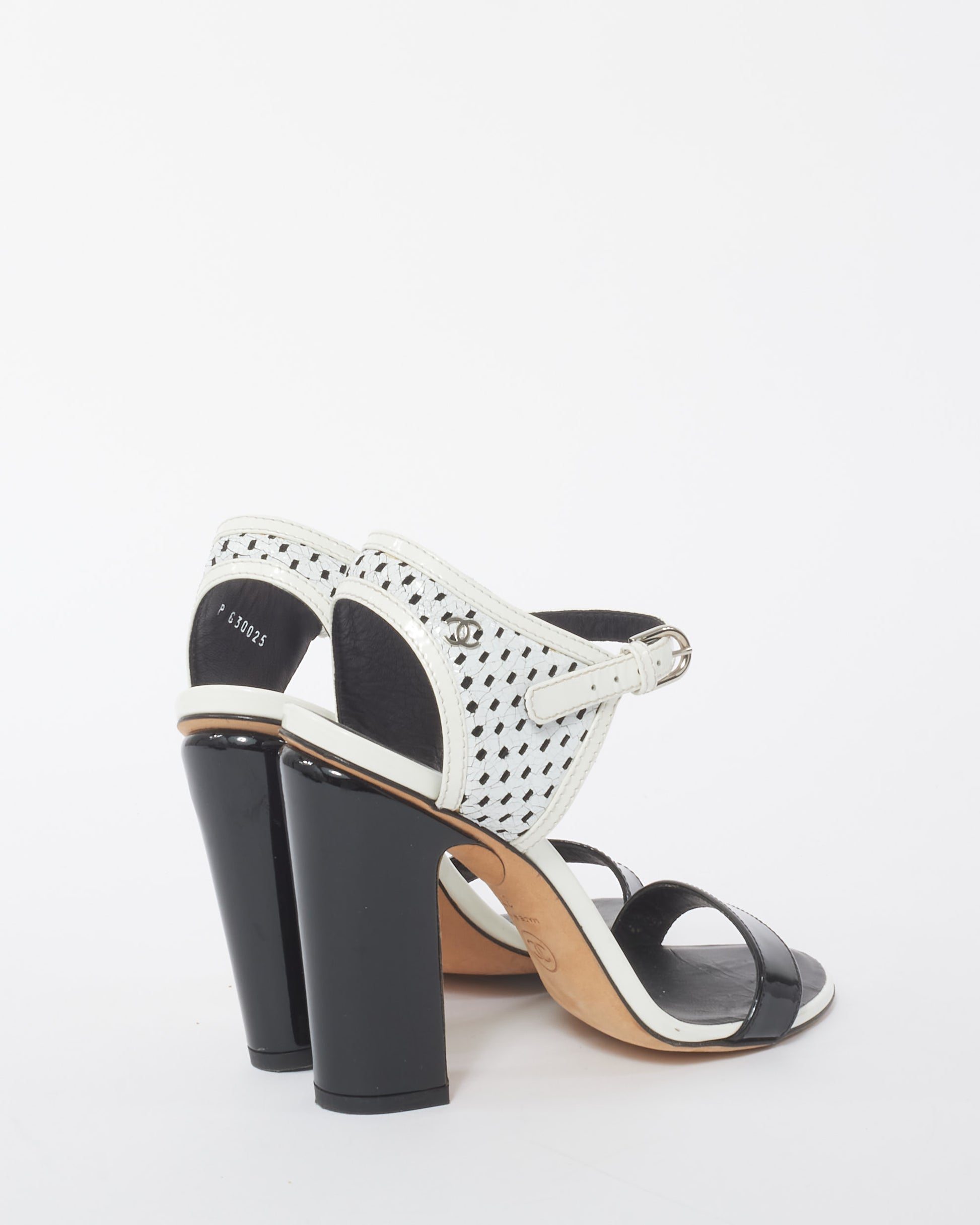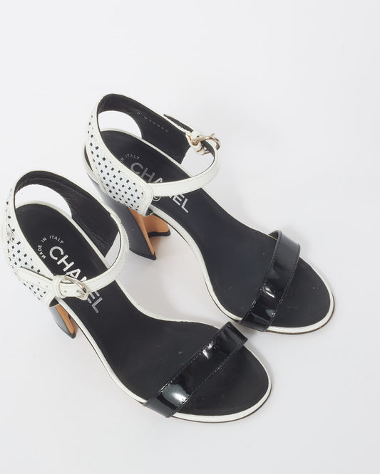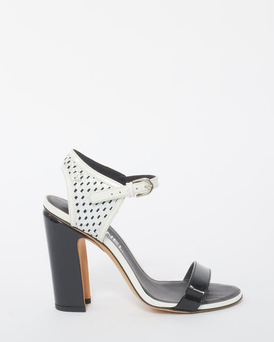 Black and White Perforated Crackled Patent Leather Calfskin Block Heel Sandals - 37
