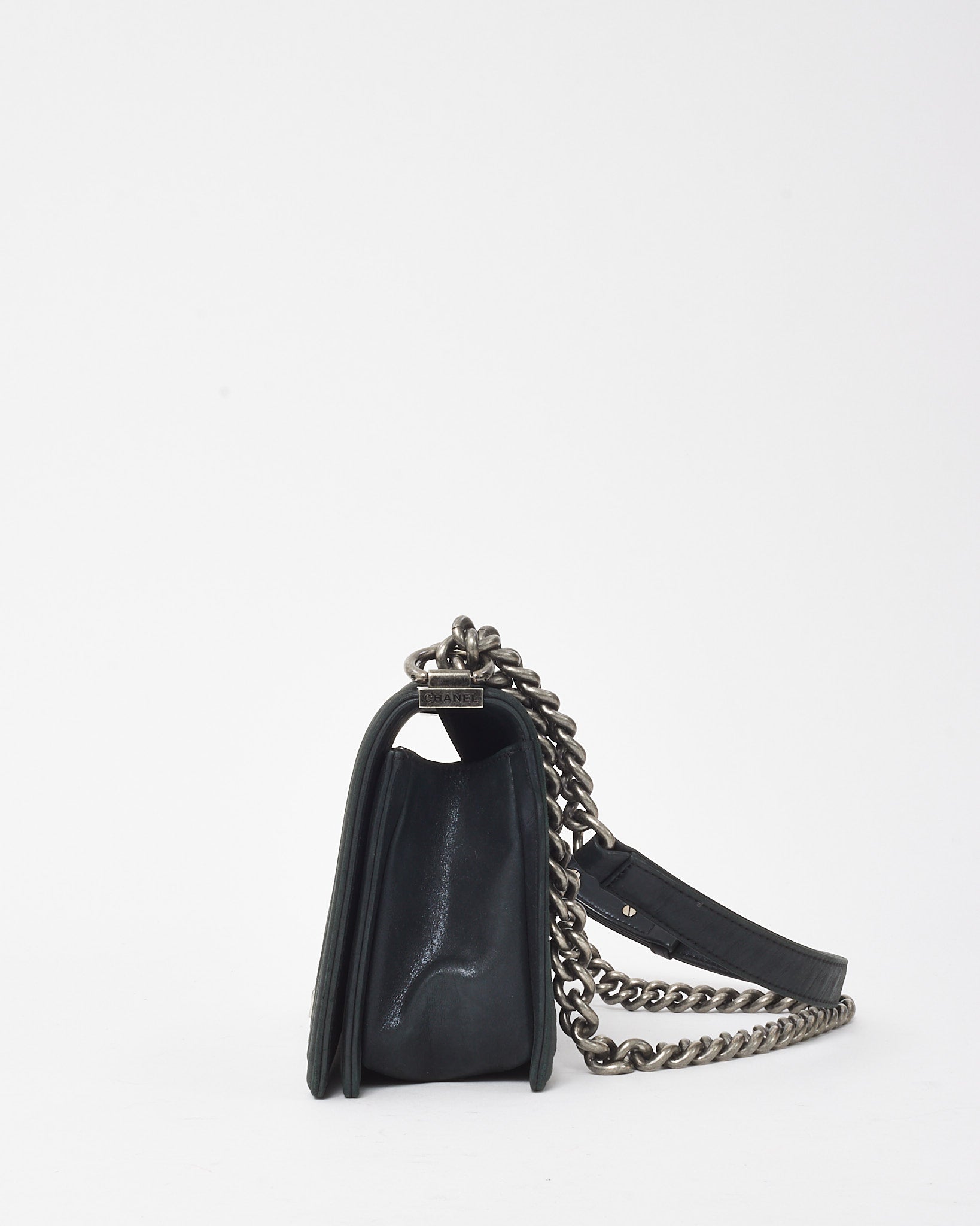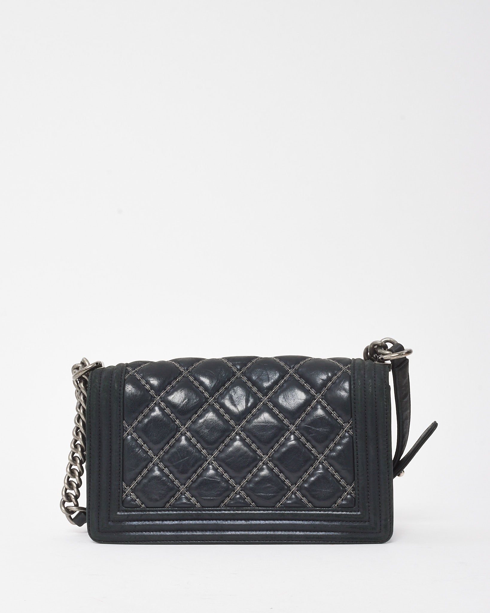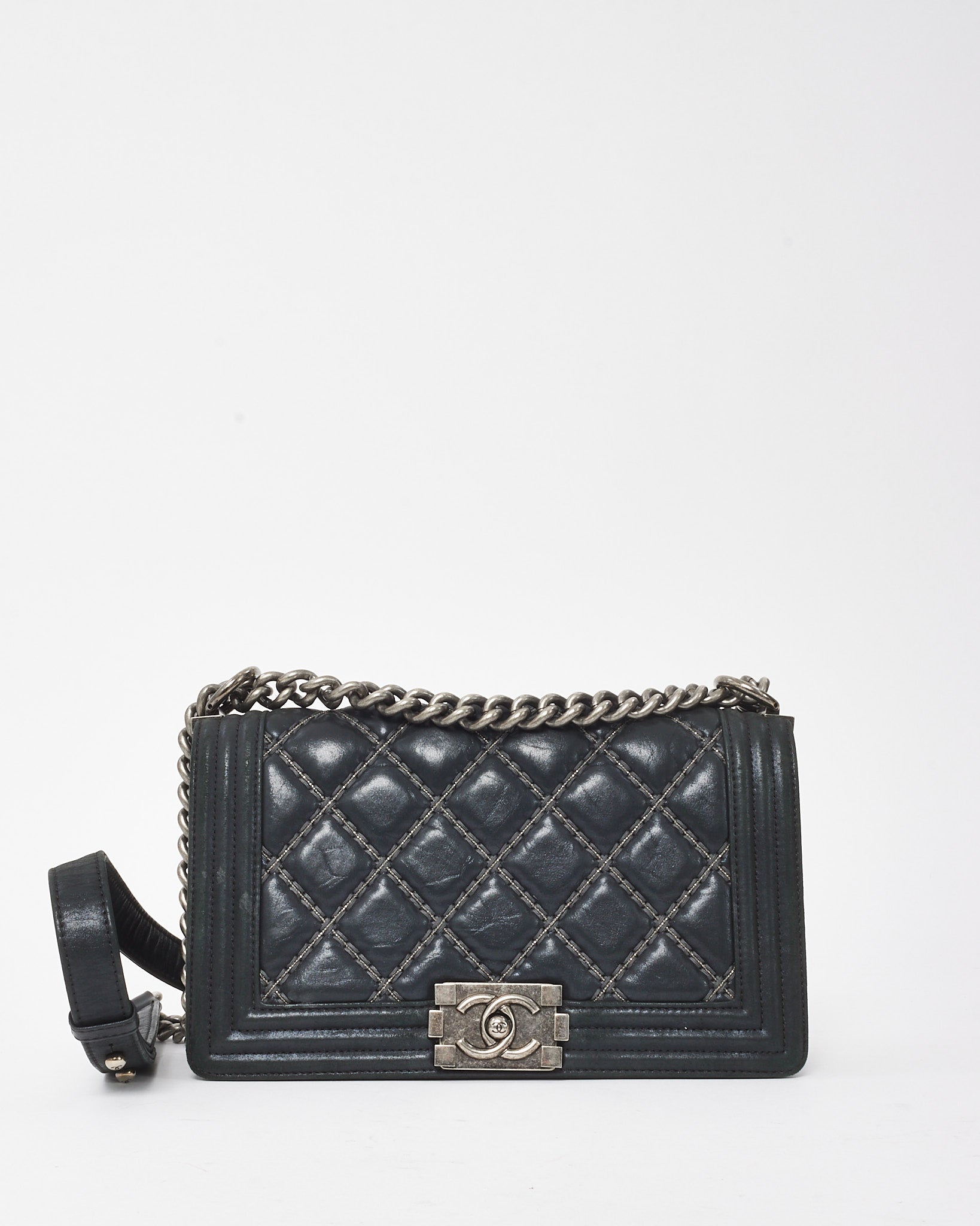 Elevated with bold structure and refined edge, this pre-loved authentic Chanel Medium Boy Flap Bag is crafted from smooth black calfskin leather, detailed with signature double-stitch quilting for a modern take on classic Chanel codes. The aged silver-tone hardware—including the iconic CC push-lock closure and chunky chain strap with leather shoulder insert—adds a rebellious yet sophisticated accent. Designed for versatility, it transitions seamlessly from daywear to evening edits, making it a staple piece for any curated collection.