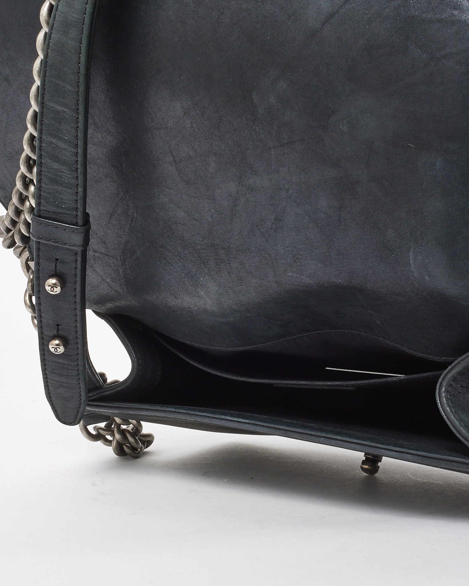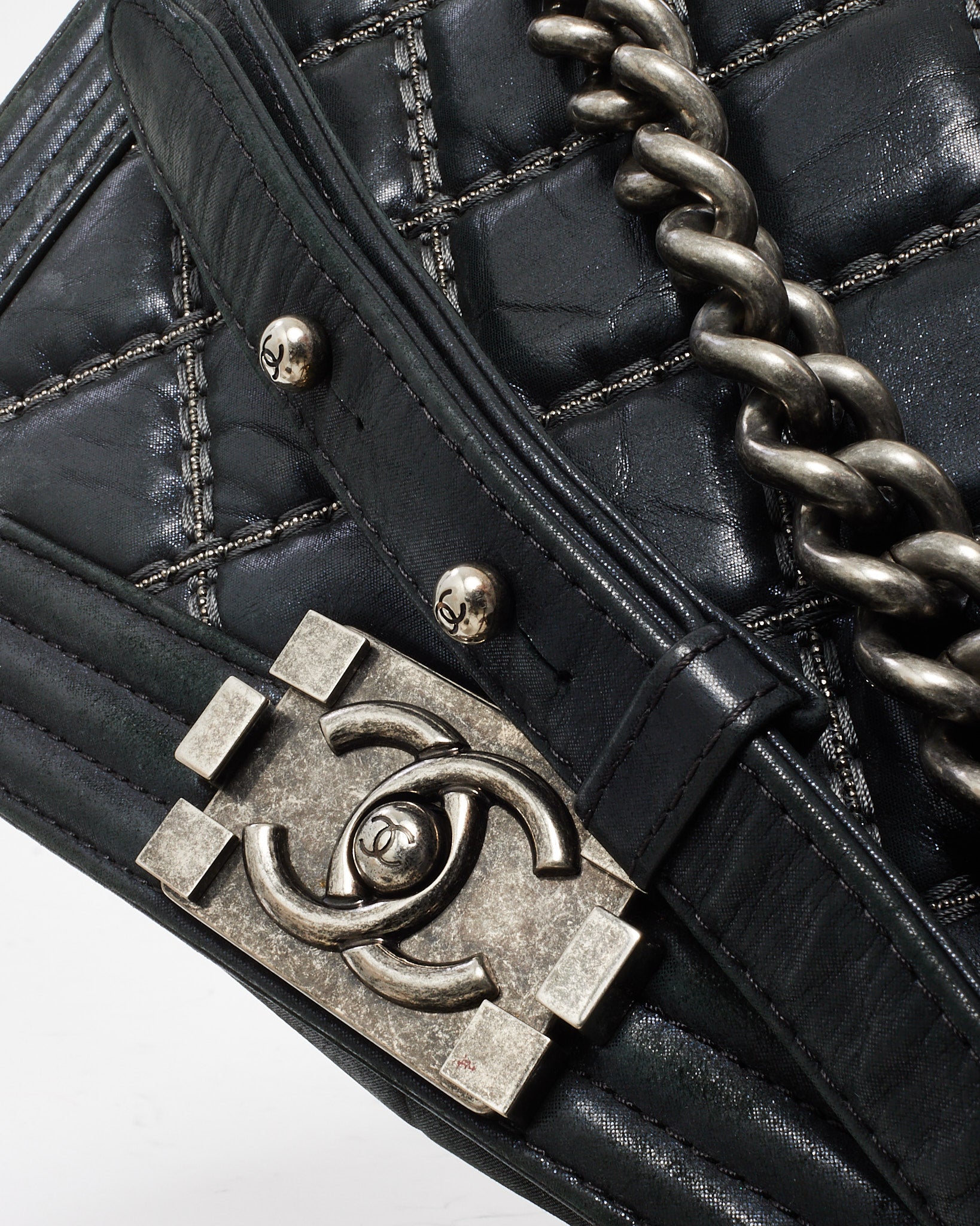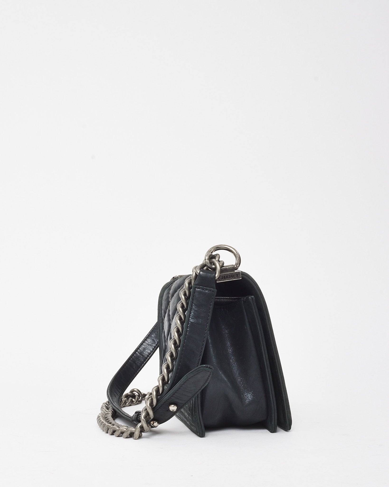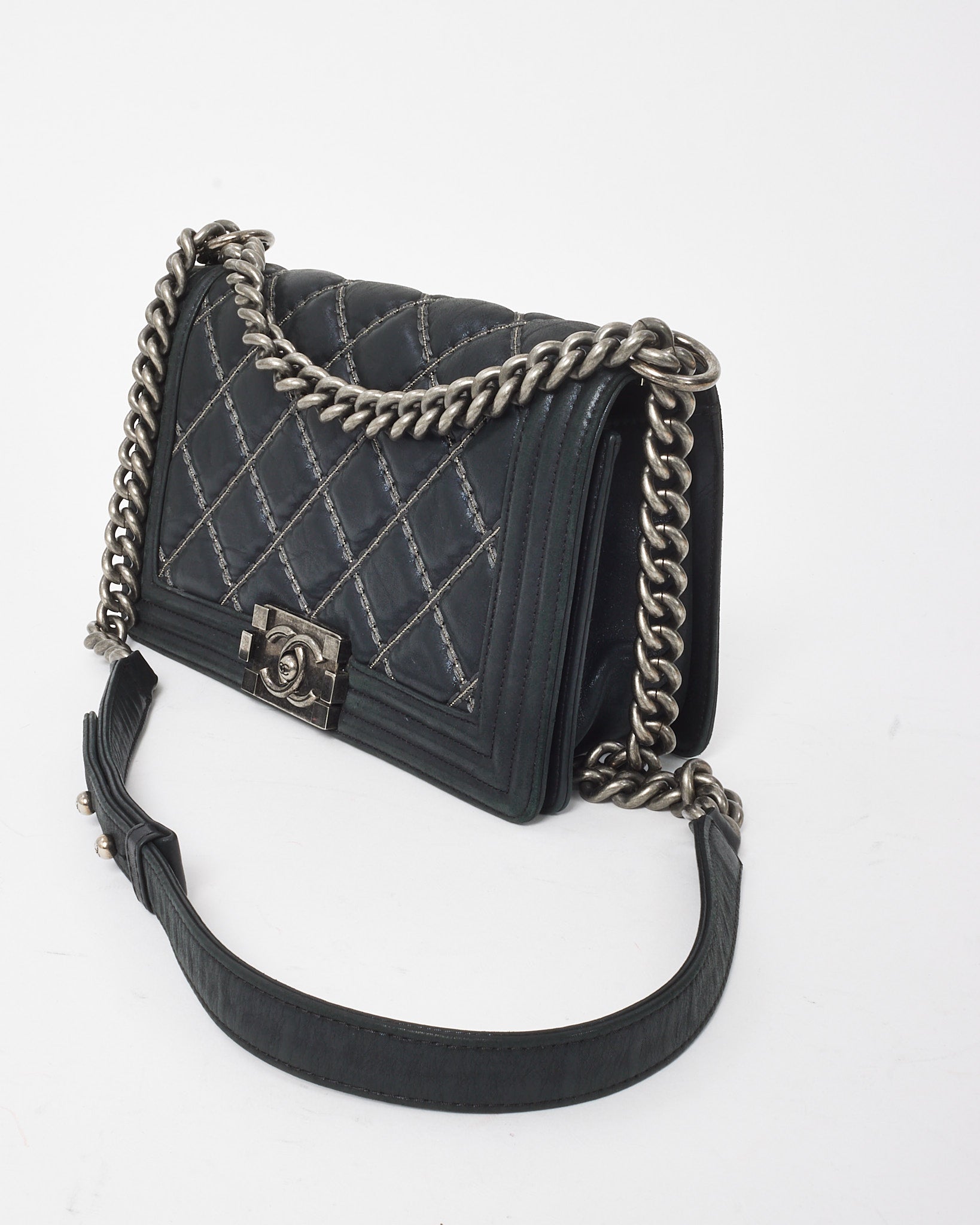 Elevated with bold structure and refined edge, this pre-loved authentic Chanel Medium Boy Flap Bag is crafted from smooth black calfskin leather, detailed with signature double-stitch quilting for a modern take on classic Chanel codes. The aged silver-tone hardware—including the iconic CC push-lock closure and chunky chain strap with leather shoulder insert—adds a rebellious yet sophisticated accent. Designed for versatility, it transitions seamlessly from daywear to evening edits, making it a staple piece for any curated collection.