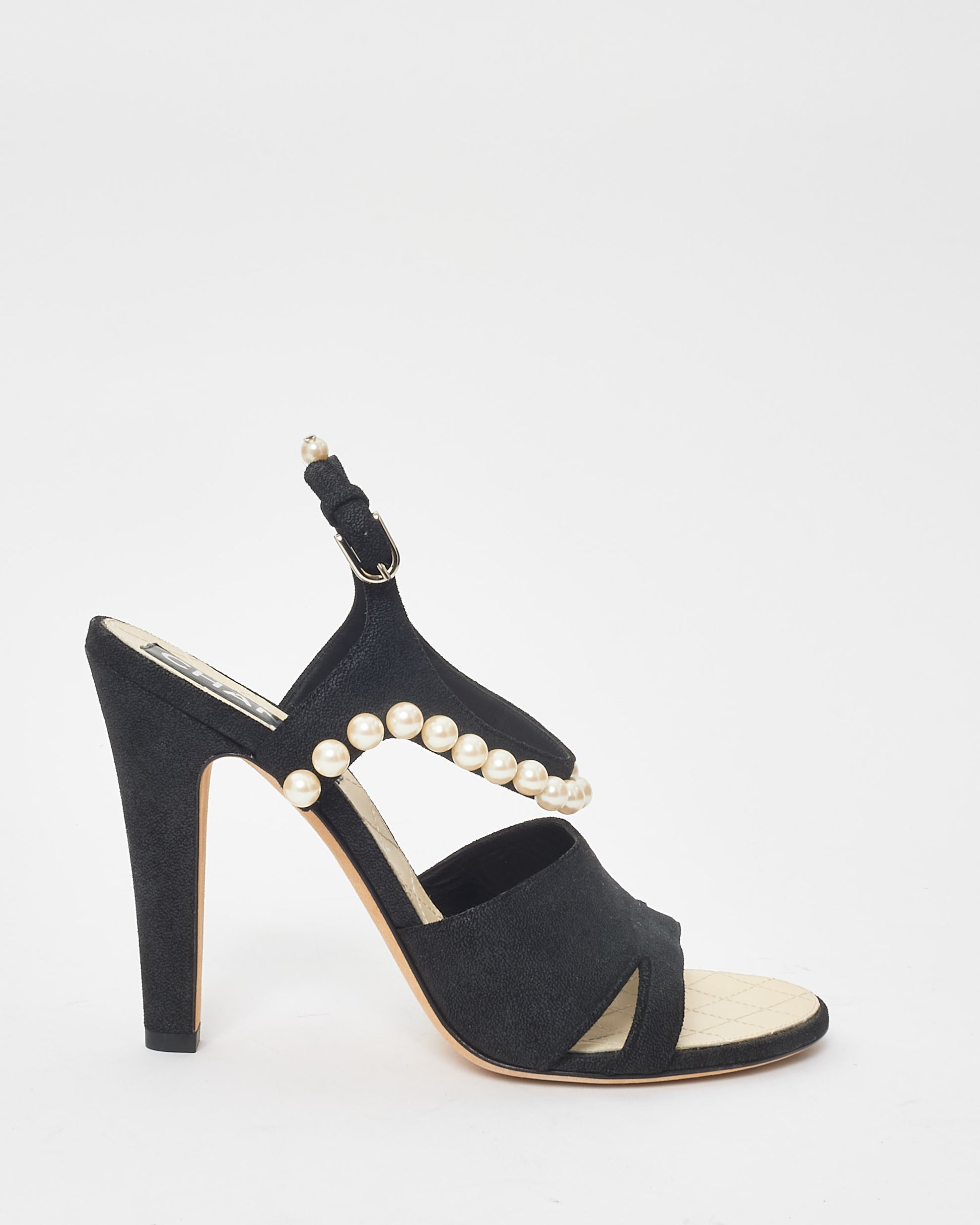 Black Fabric & Pearl Strappy Heel Sandals - 40