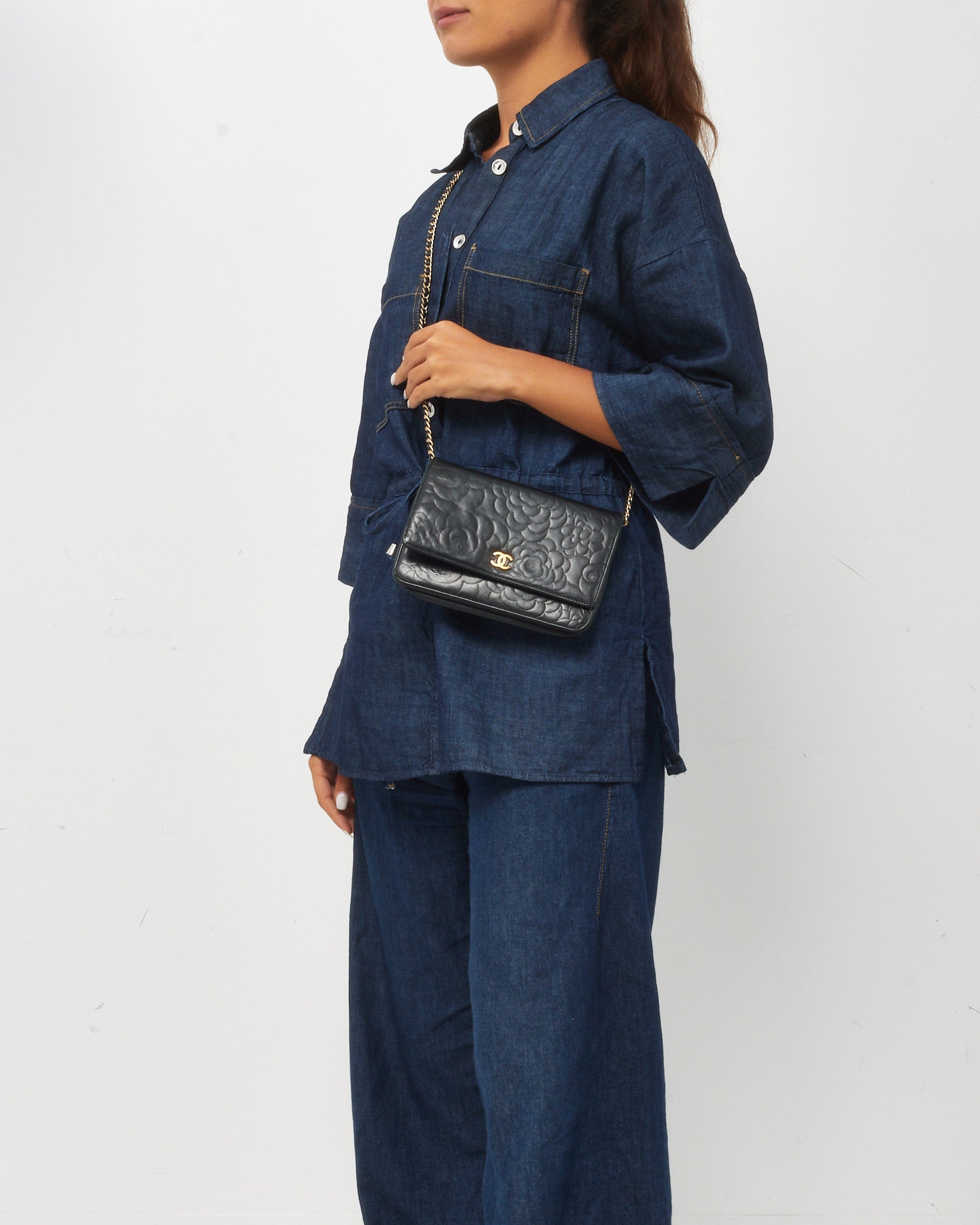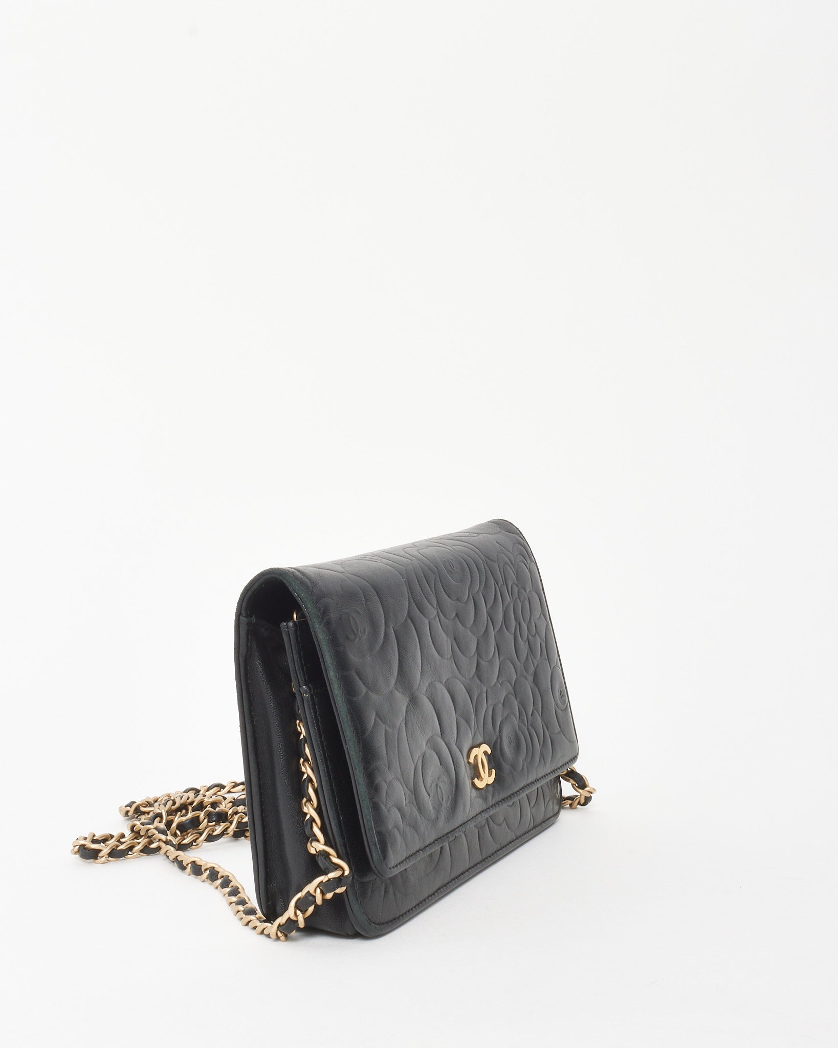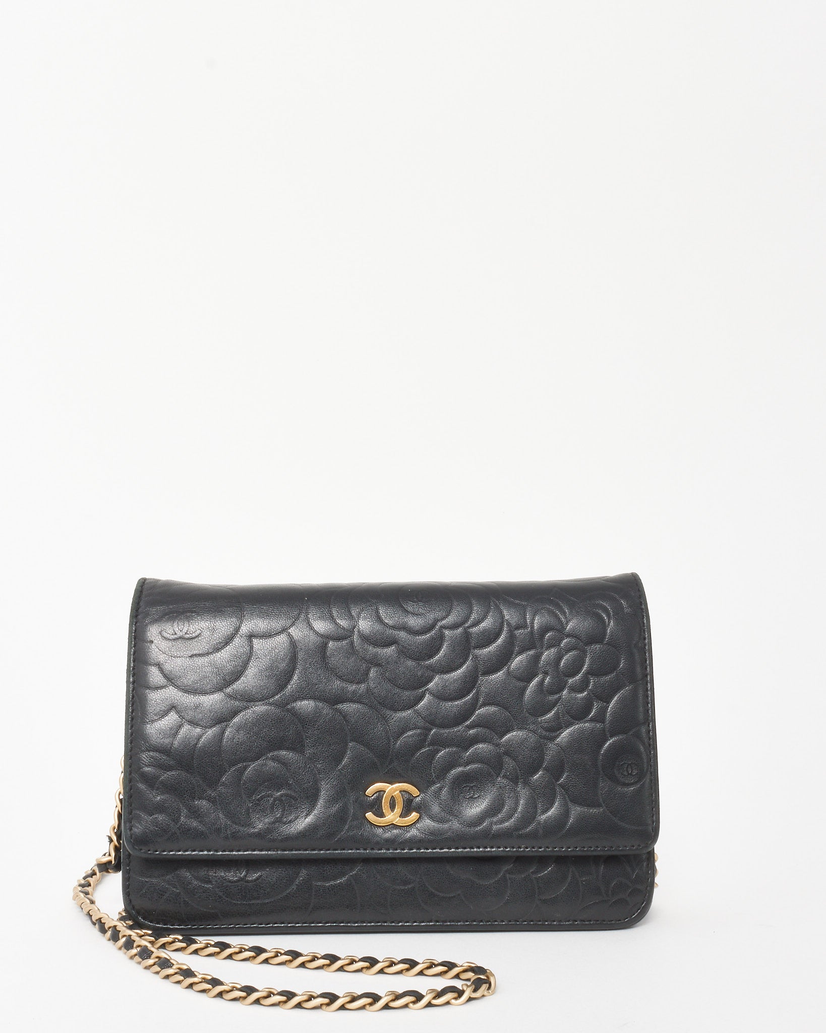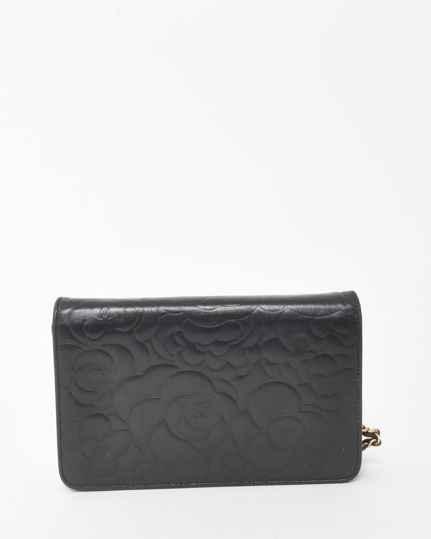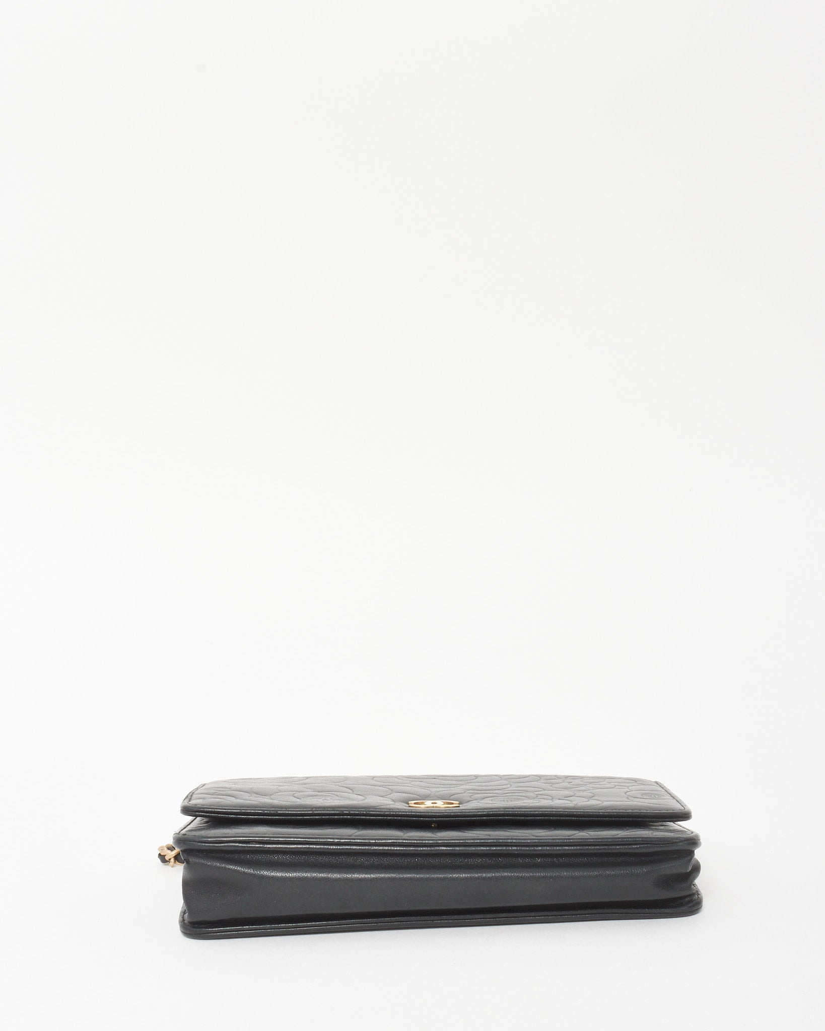 Black Lambskin Camellia Embossed Leather WOC Wallet on Chain Bag GHW