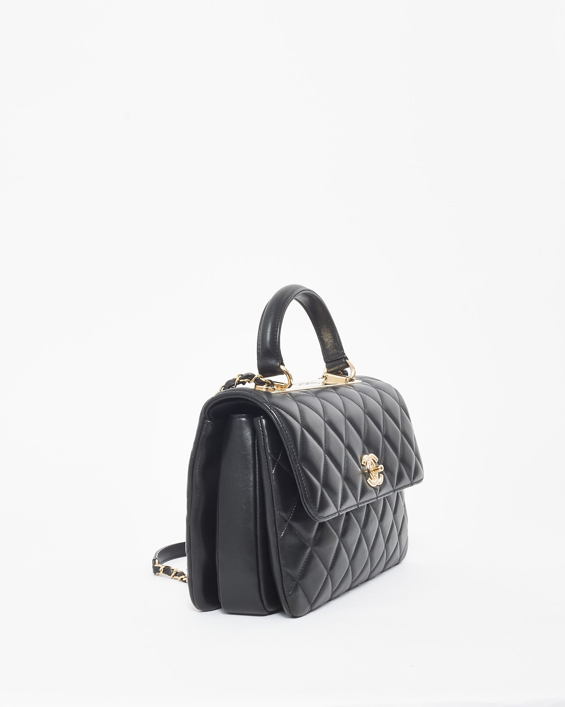 Explore Chanel's exquisite collection of handbags, featuring this certified pre-owned Black Lamsbkin Medium Trendy CC Top Handle Bag GHW. Embodying timeless elegance and modern sustainability, each piece, including favorites like this, is authenticated by Retyche. Discover sustainable luxury — shop our current treasures or find inspiration for your next coveted find.