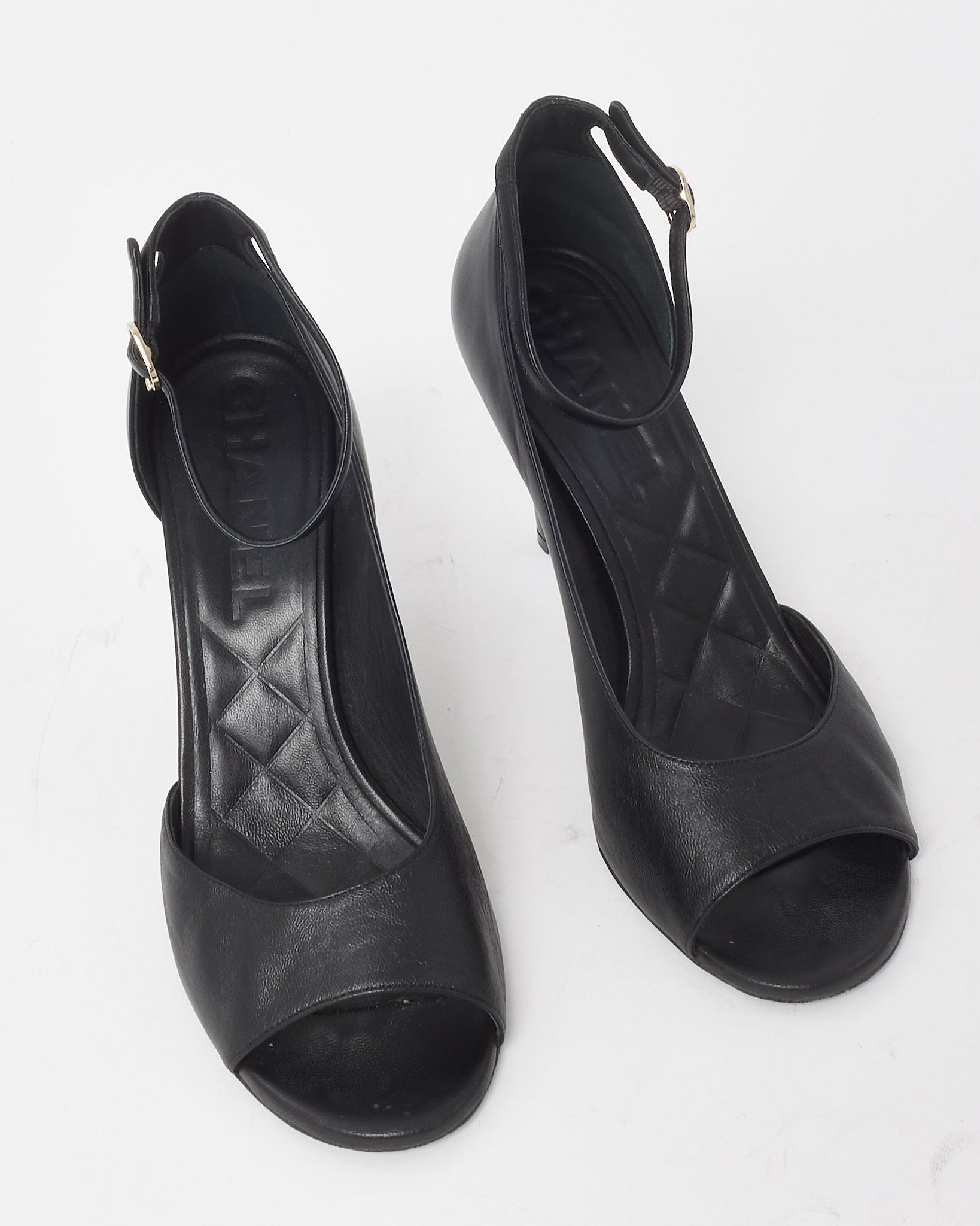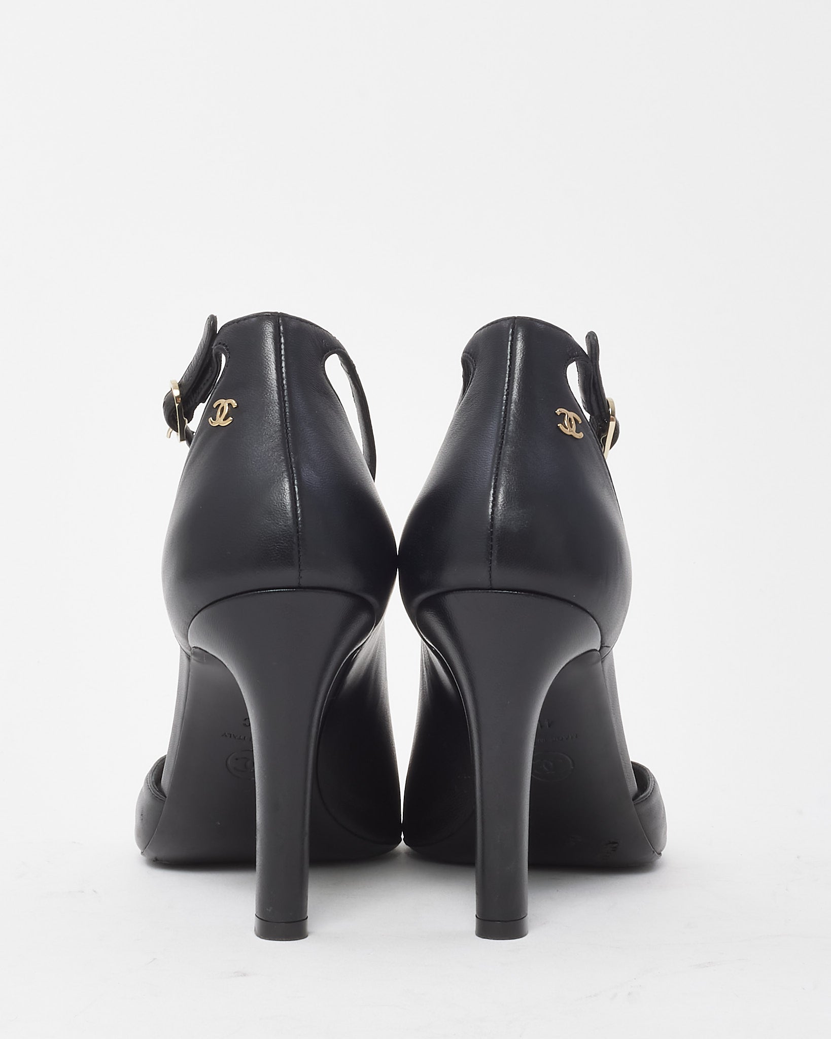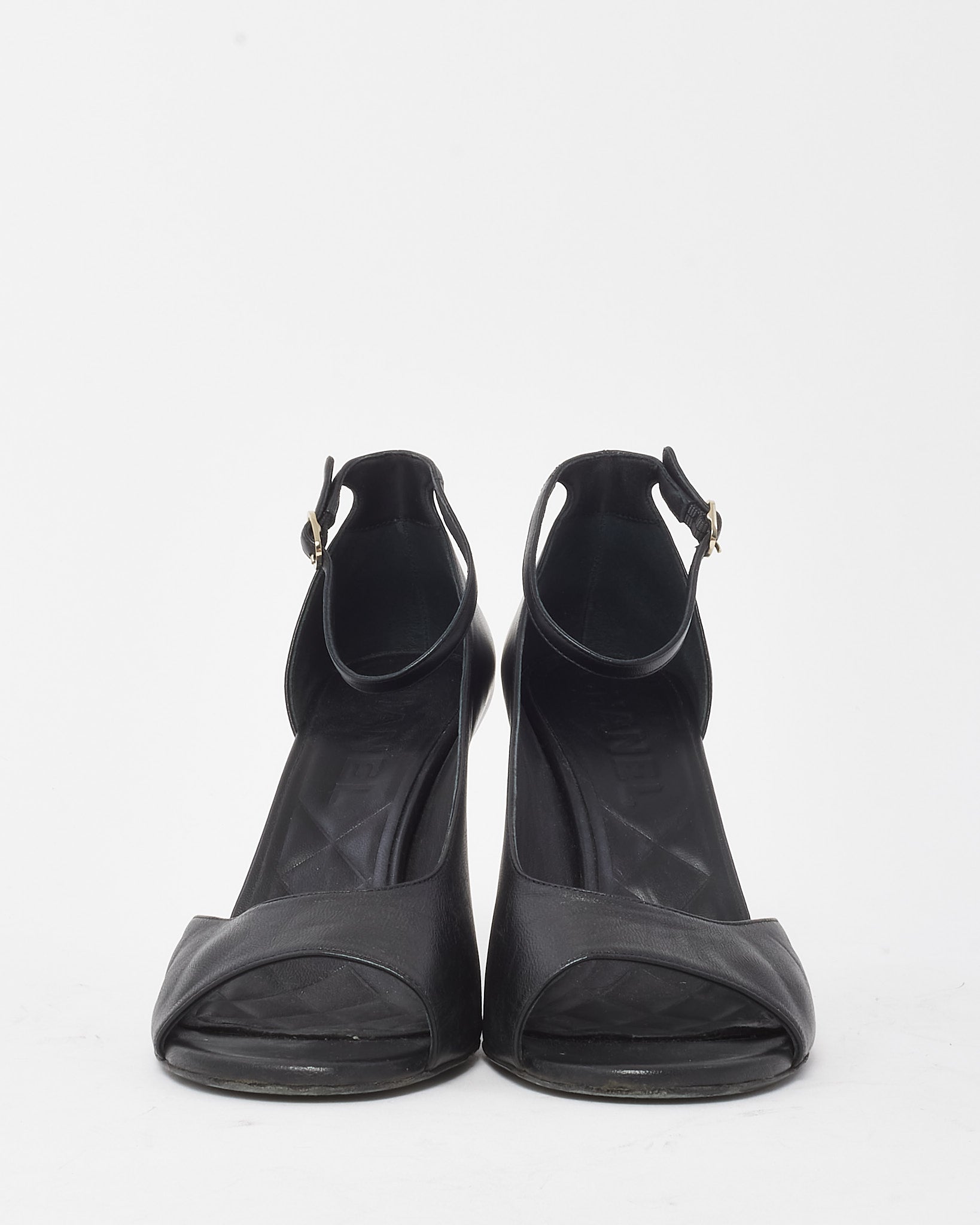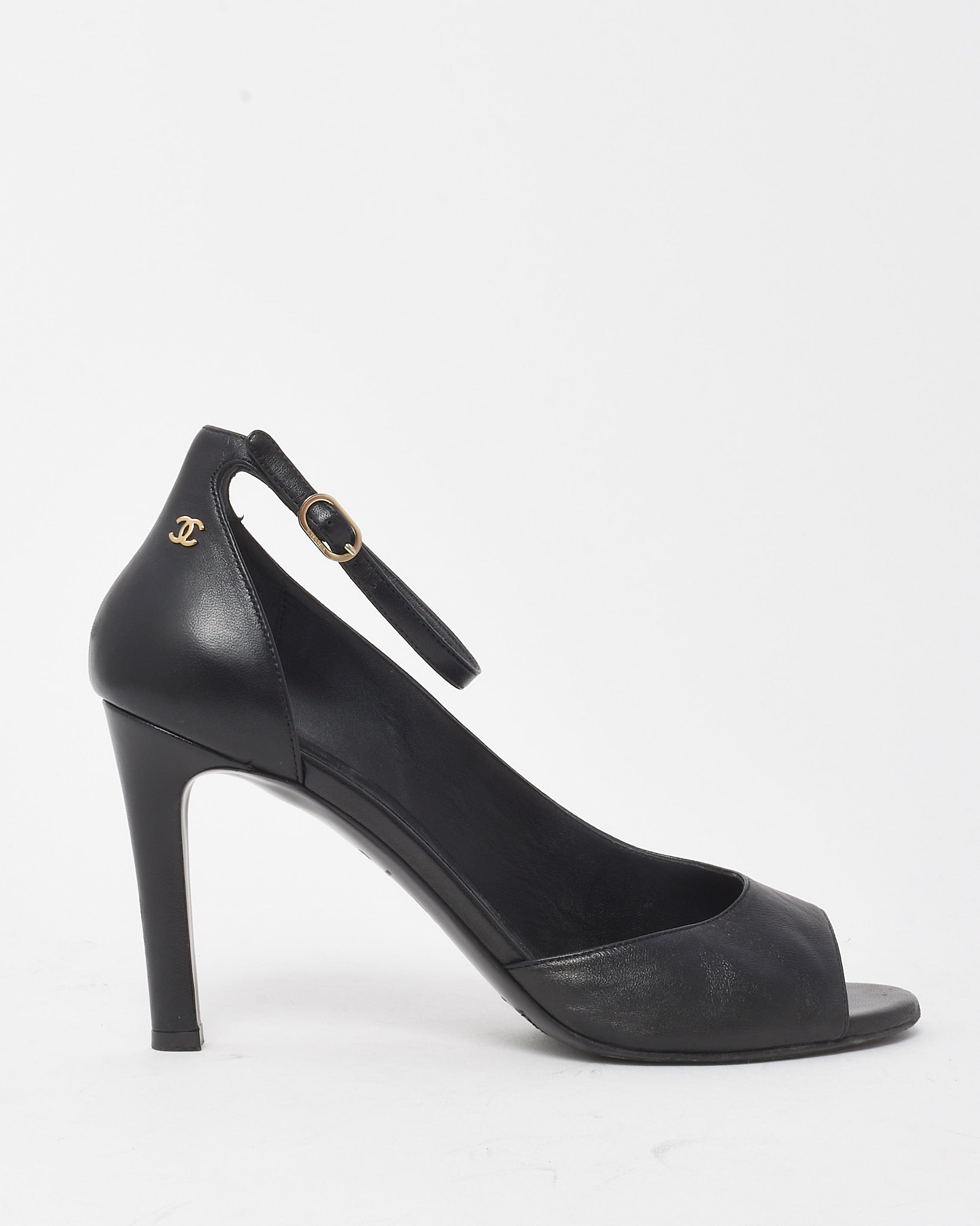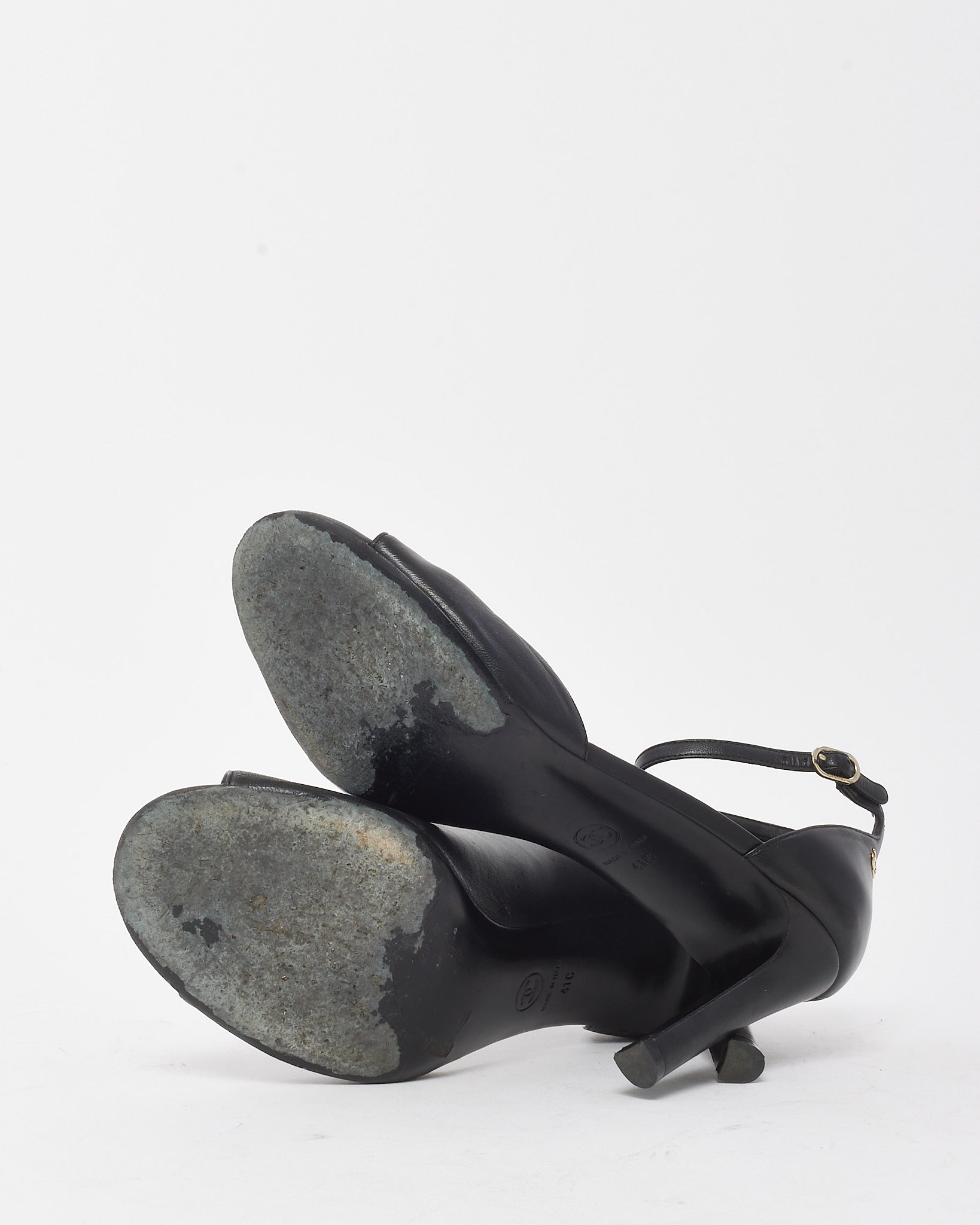 Black Leather CC Logo Ankle Strap Open Toe Pumps - 41