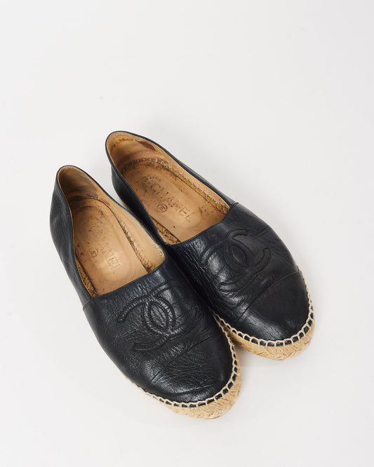 A perfect fusion of casual elegance and iconic style, the pre-owned authentic Chanel Black Leather CC Logo Espadrilles are a must-have for effortless luxury. Crafted from supple black leather, these espadrilles feature Chanel’s signature interlocking CC logo embossed on the front, adding a touch of refined branding.