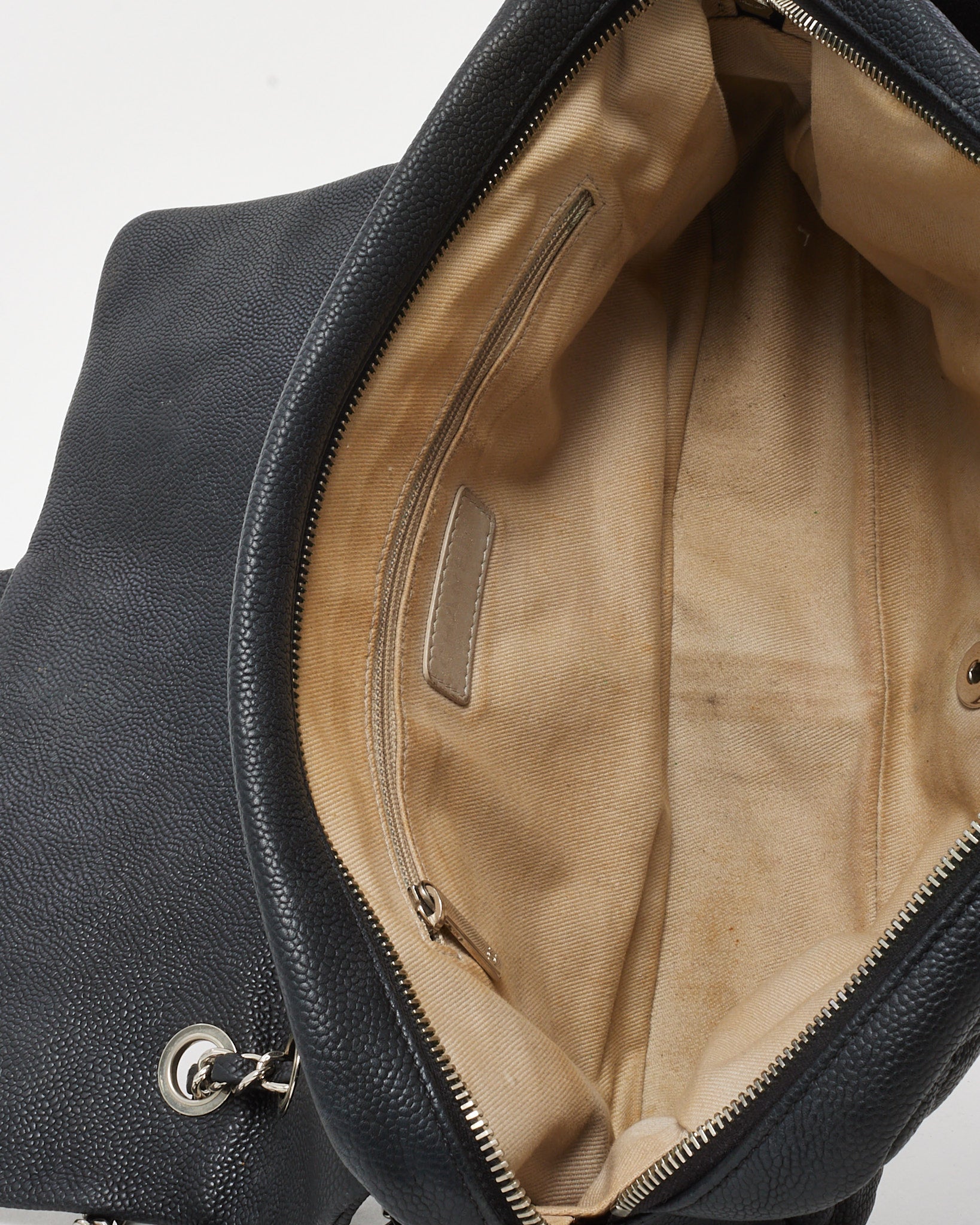 A refined silhouette with iconic appeal, this pre-loved authentic Chanel Easy Flap Bag is crafted in durable black caviar with a softly structured jumbo shape. Featuring the classic CC turn-lock closure and gleaming silver-tone hardware, it opens to a spacious interior perfect for day-to-evening transitions. A back slip pocket and adjustable shoulder strap offer added practicality. A sophisticated staple for collectors of timeless Chanel design.