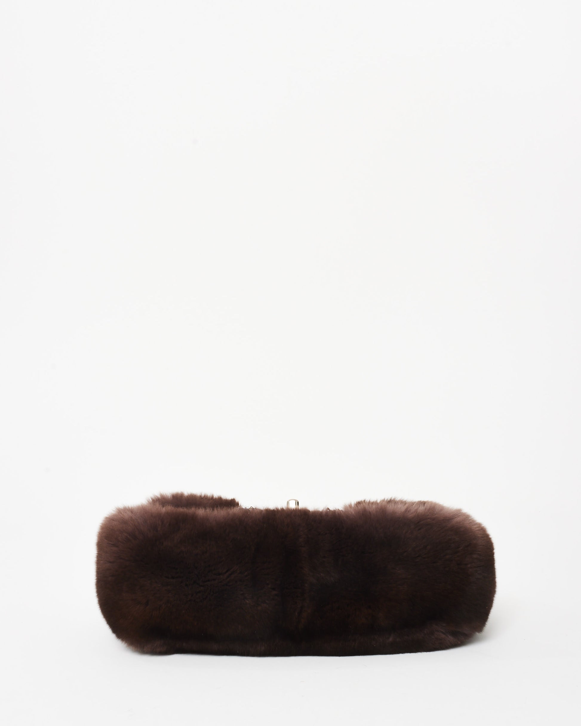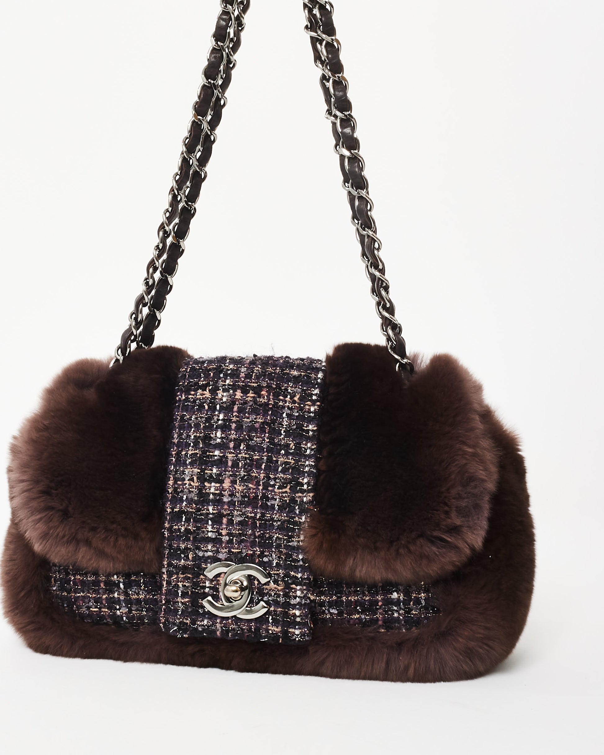 Brown Chinchilla Fur & Navy Multi Tweed Flap Bag SHW