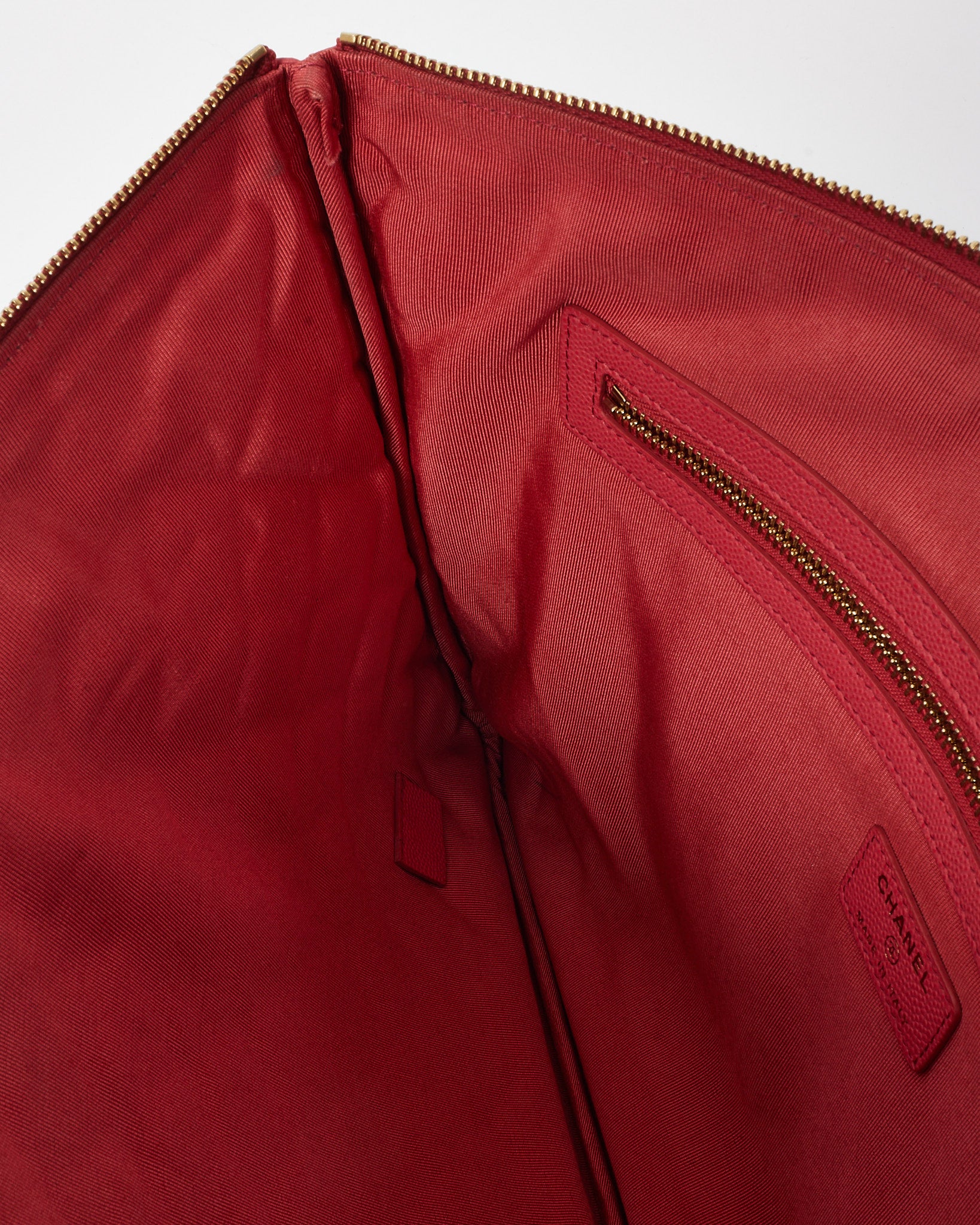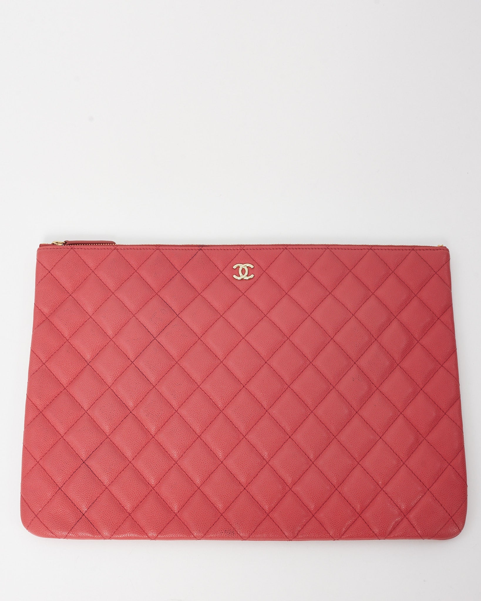 Vibrant and refined, this pre-owned authentic Chanel Medium O Case Clutch is crafted from fuchsia red caviar leather with signature diamond quilting and finished with gold-tone hardware. The zip-top silhouette features the iconic interlocking CC logo and opens to a spacious fabric-lined interior, perfect for organizing daily essentials.