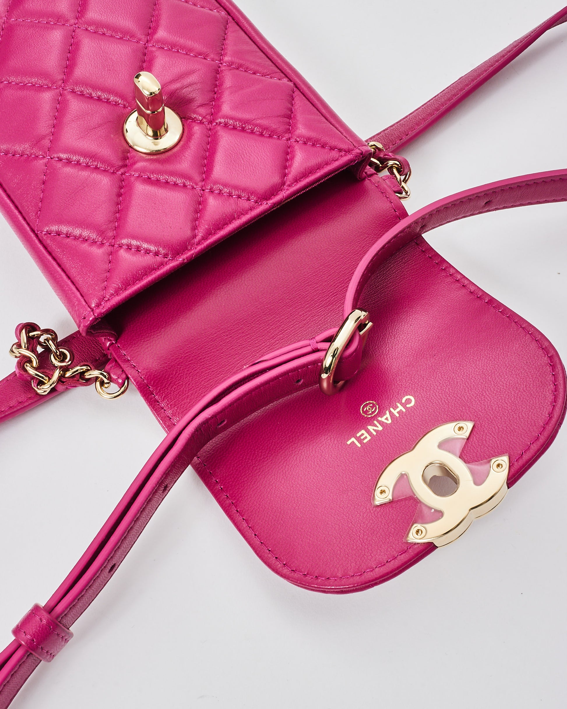 Explore Chanel's exquisite collection of handbags, featuring this certified pre-owned  Fuchsia Pink Lambskin Classic Phone Holder Belt Bag. Embodying timeless elegance and modern sustainability, each piece, including favorites like this, is authenticated by Retyche. Discover sustainable luxury — shop our current treasures or find inspiration for your next coveted find.