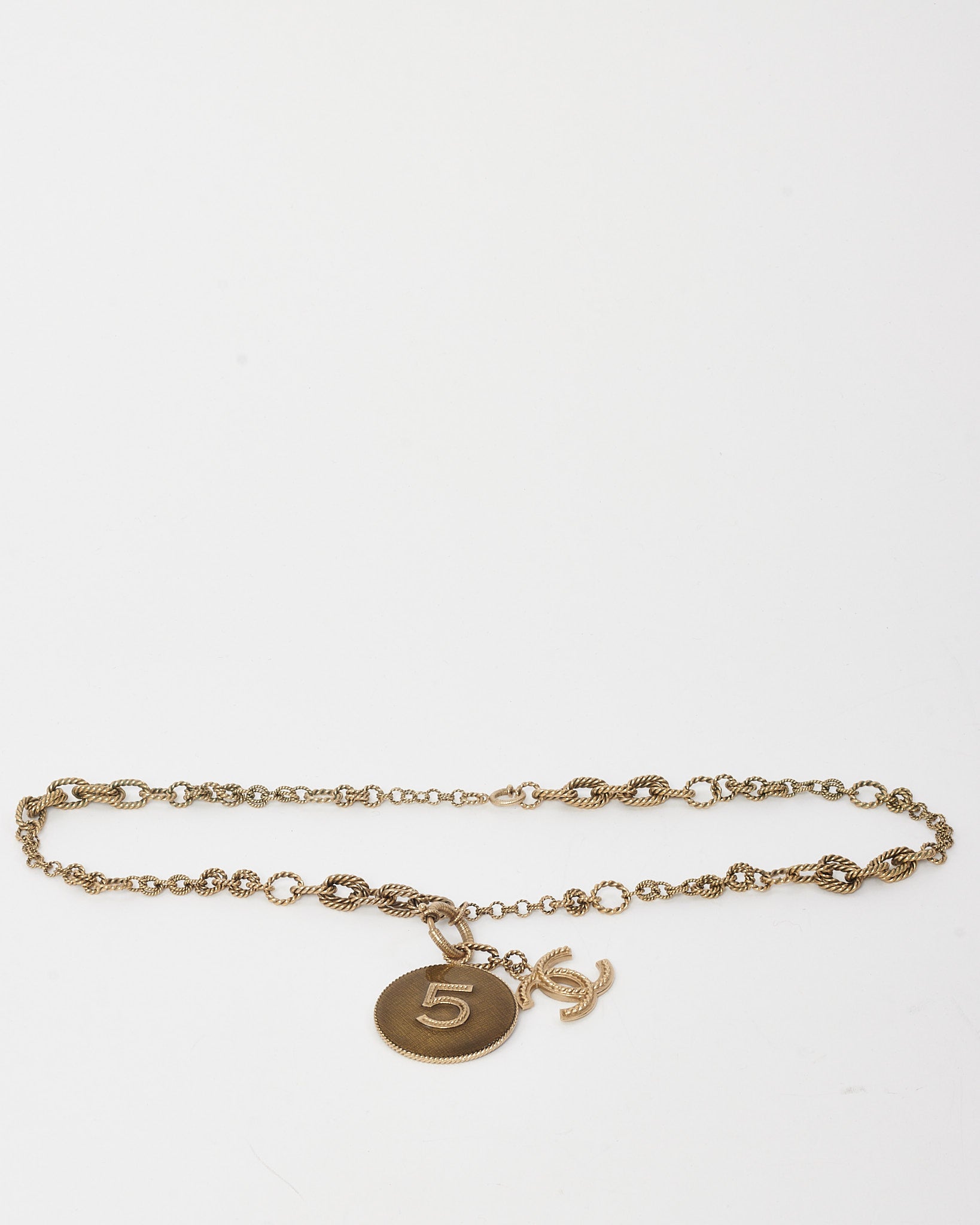 Add iconic charm to your jewelry collection with this pre-loved authentic Chanel Gold-Tone Metal CC No.5 Long Medallion Pendant Necklace. Crafted from gleaming gold-tone metal, this statement piece features an oversized circular medallion engraved with the signature interlocking CC logo and the number 5—a nod to the house’s legendary fragrance. Suspended from a long chain, the bold pendant lends vintage-inspired glamour to both casual and elevated looks. Timeless and collectible, it’s a striking accessory with unmistakable Chanel allure.