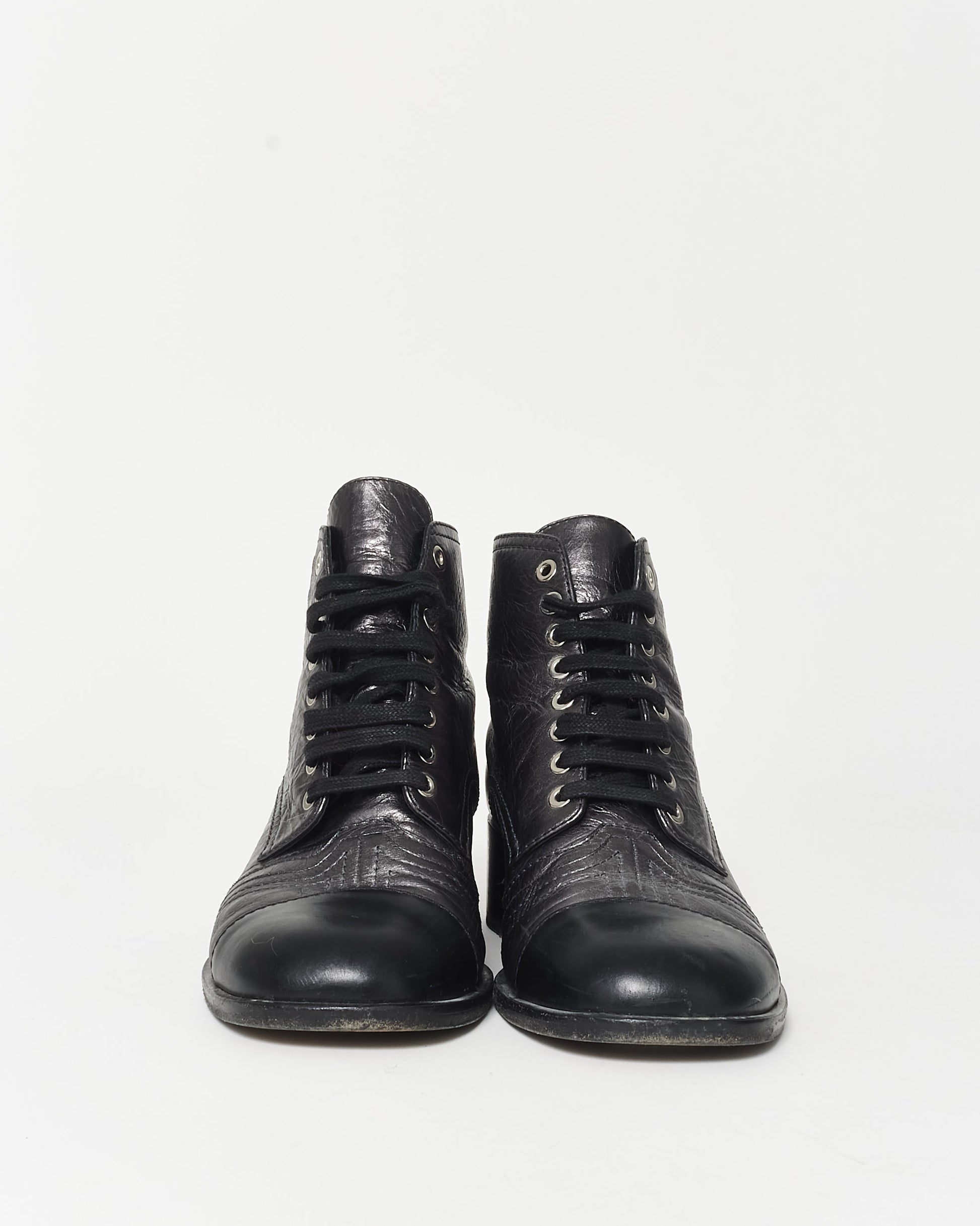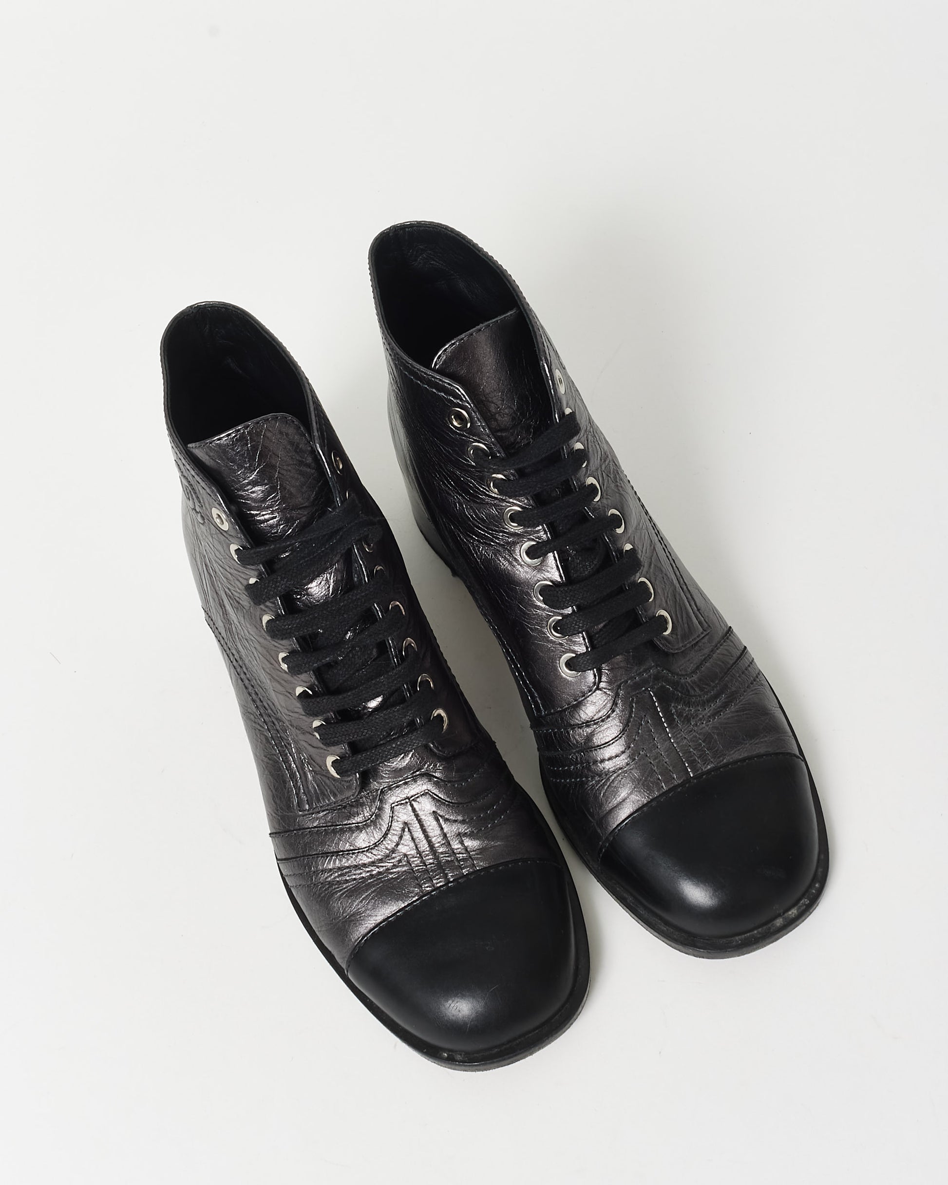 Shop these pre-owned authentic Chanel Gunmetal & Black Leather Logo Mini Combat Boots are a luxurious and edgy footwear choice that combines Chanel’s iconic elegance with a rugged twist. Crafted from premium black leather, these mini combat boots feature a gunmetal finish and the classic Chanel logo, adding a signature touch of sophistication. The lace-up design and sturdy rubber sole make them both stylish and practical, ideal for adding a bold statement to any outfit. Shop pre-owned authentic Chanel shoes at Retyche.
