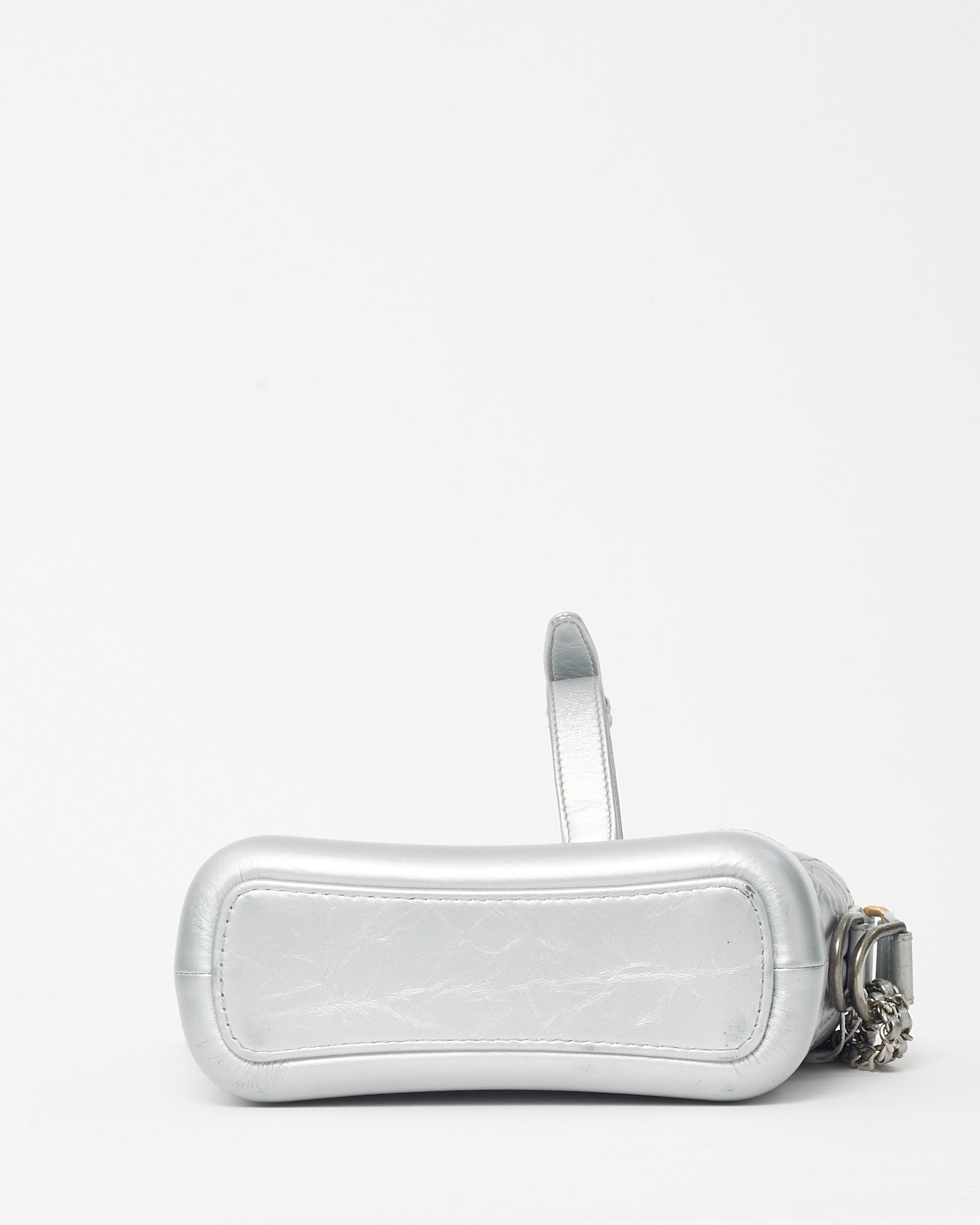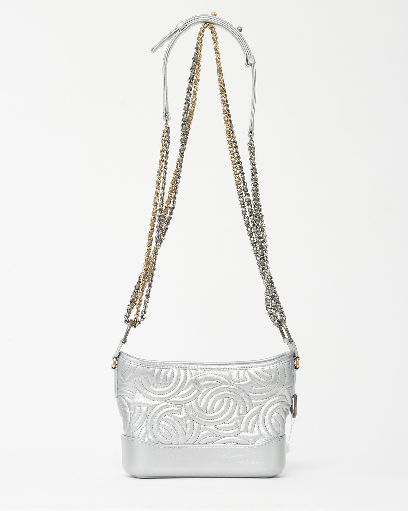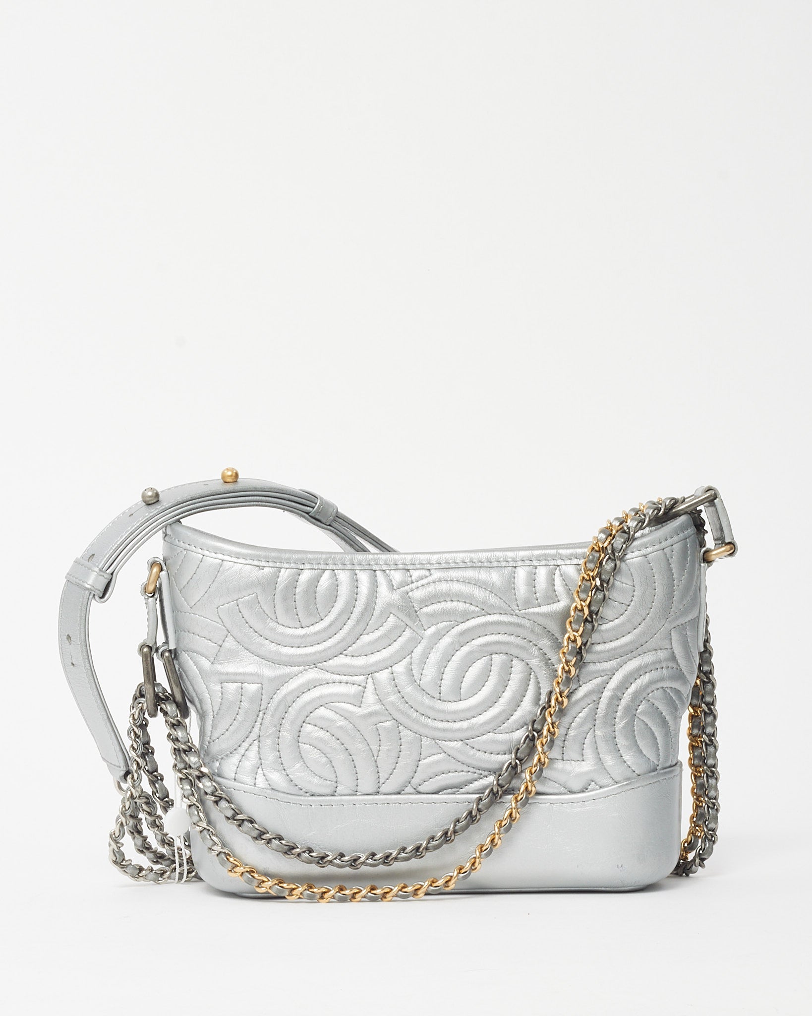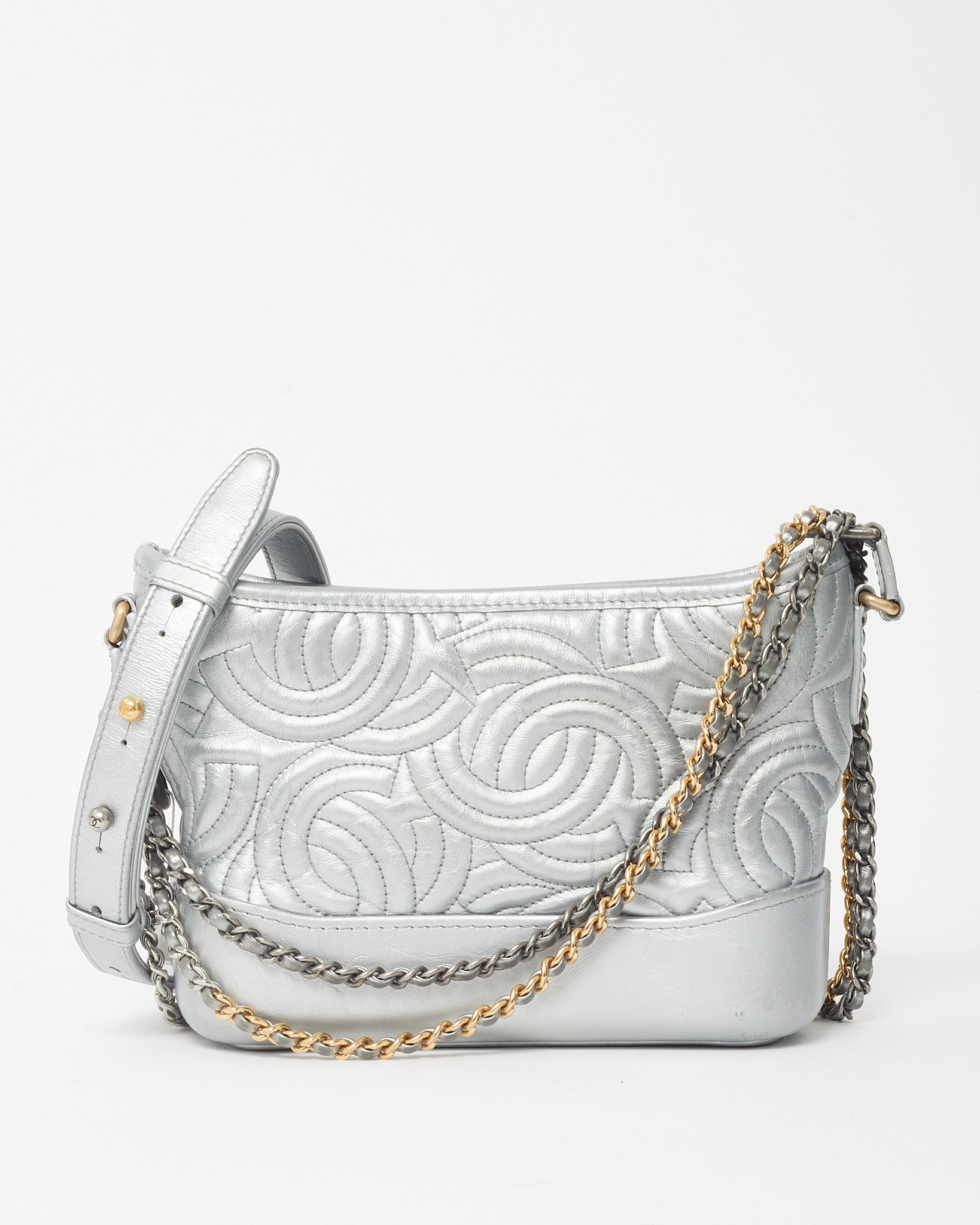 Modern and striking, this pre-loved authentic Chanel Silver CC Logo Embossed Leather Small Gabrielle Hobo Crossbody Bag captures the perfect balance of edge and elegance. Crafted from metallic silver leather embossed with the iconic CC logo, it features a structured yet supple silhouette with a zip-top closure and mixed-metal chain strap for versatile styling. The compact interior offers space for essentials, making it ideal for day-to-night wear. A standout Chanel design that exudes contemporary sophistication and timeless allure.