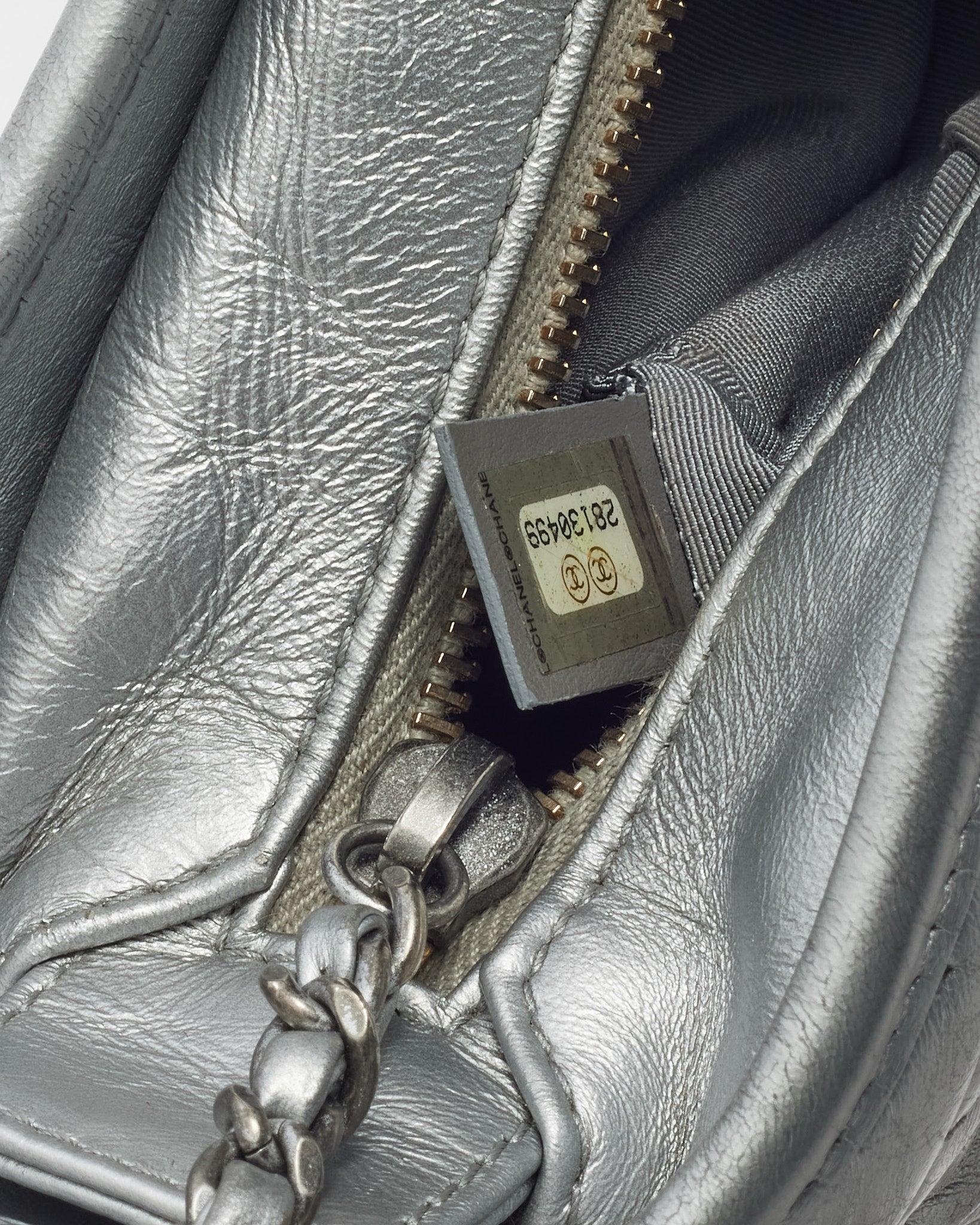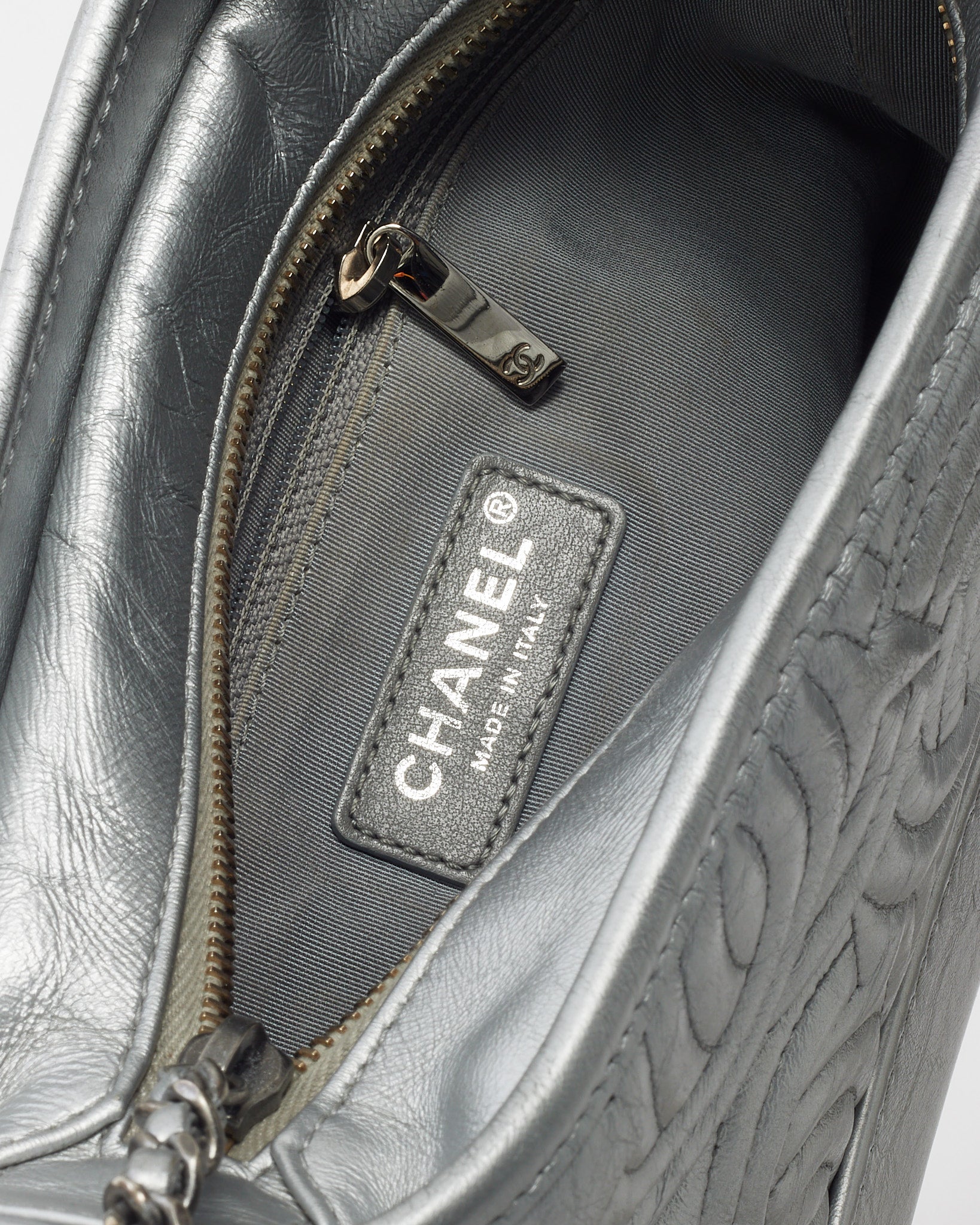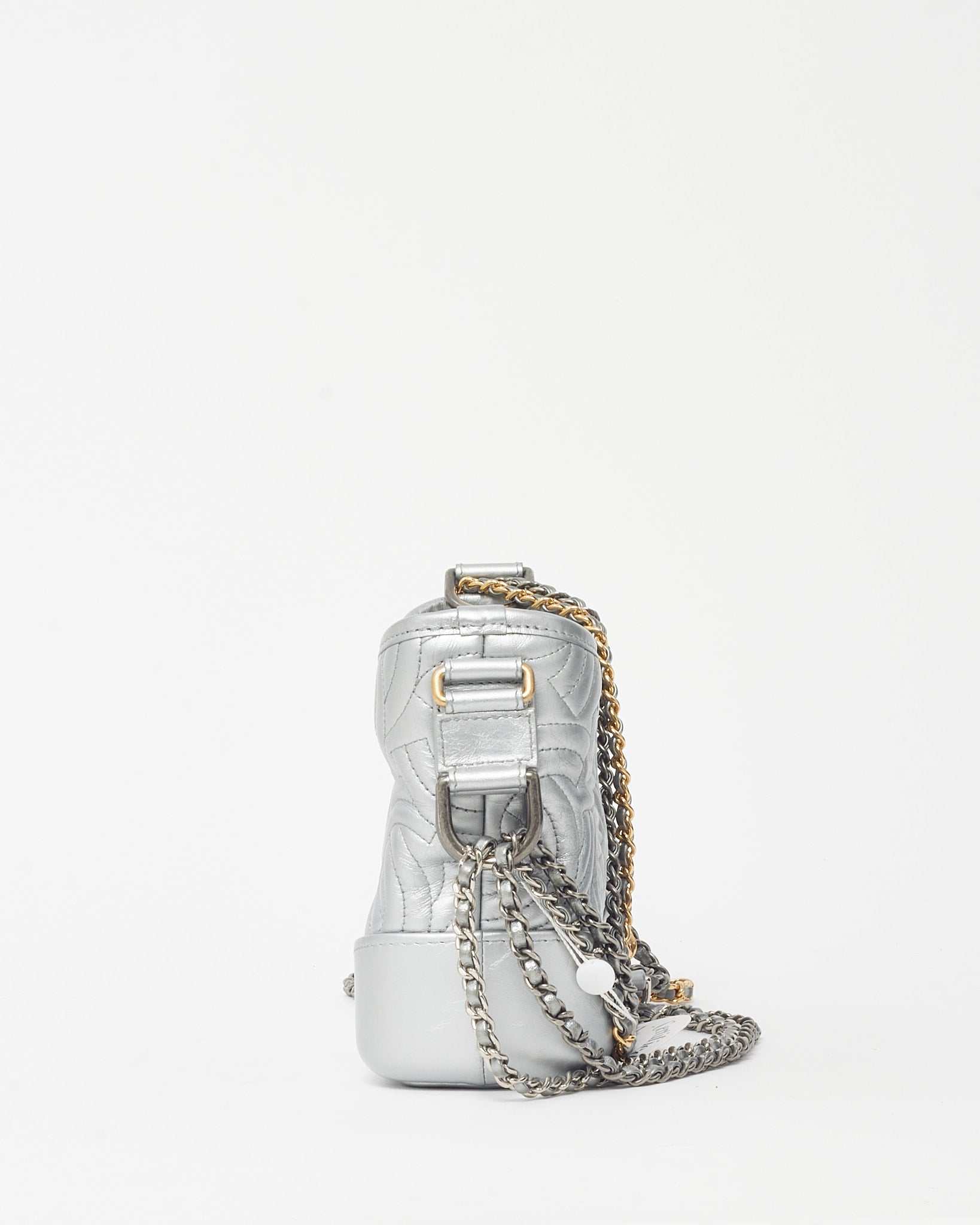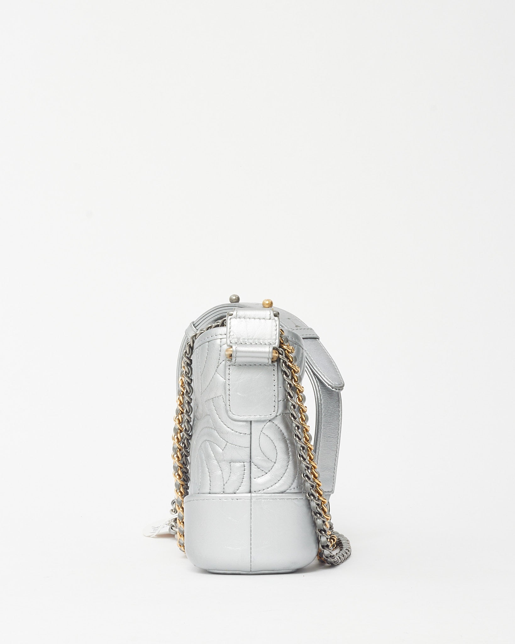 Modern and striking, this pre-loved authentic Chanel Silver CC Logo Embossed Leather Small Gabrielle Hobo Crossbody Bag captures the perfect balance of edge and elegance. Crafted from metallic silver leather embossed with the iconic CC logo, it features a structured yet supple silhouette with a zip-top closure and mixed-metal chain strap for versatile styling. The compact interior offers space for essentials, making it ideal for day-to-night wear. A standout Chanel design that exudes contemporary sophistication and timeless allure.