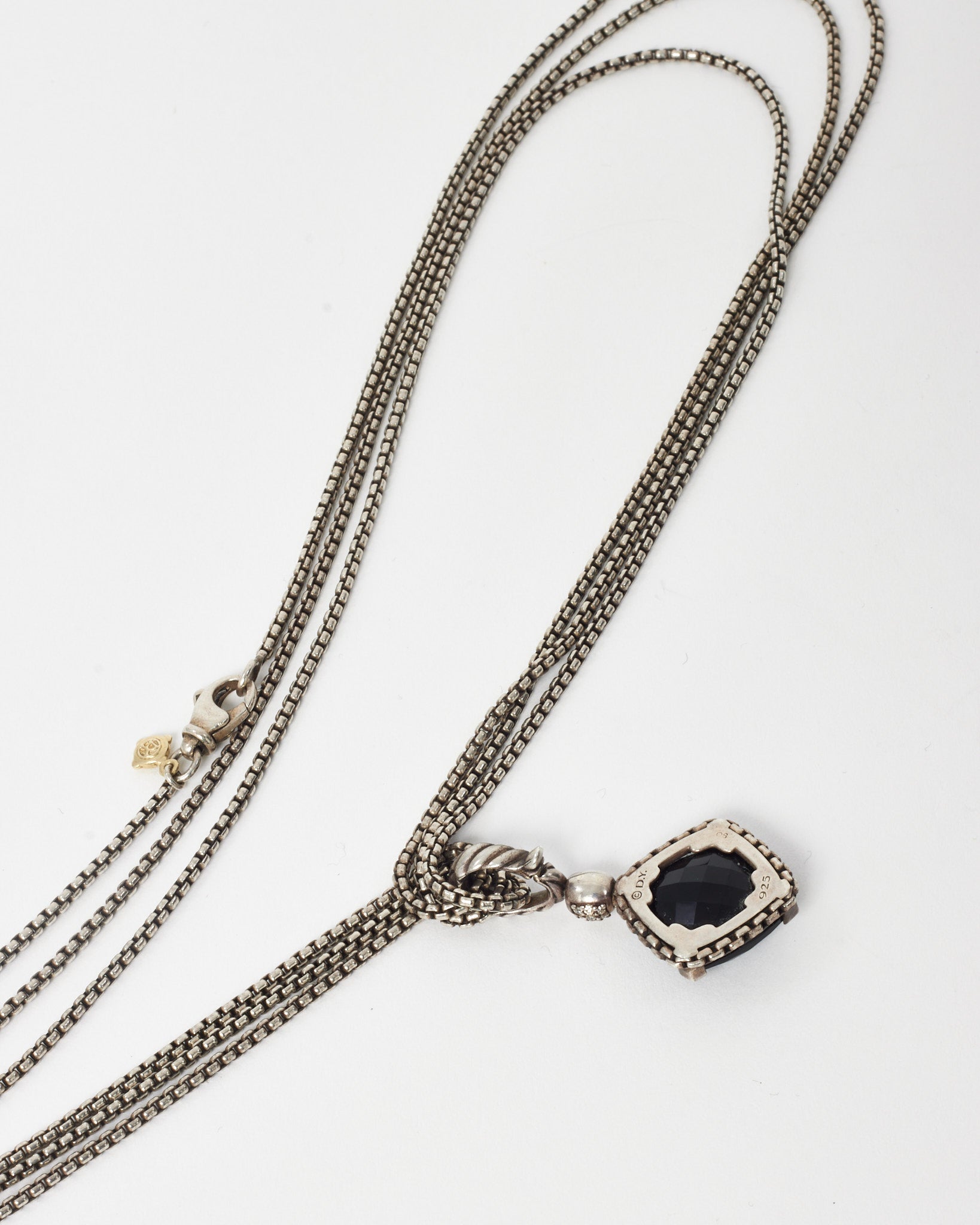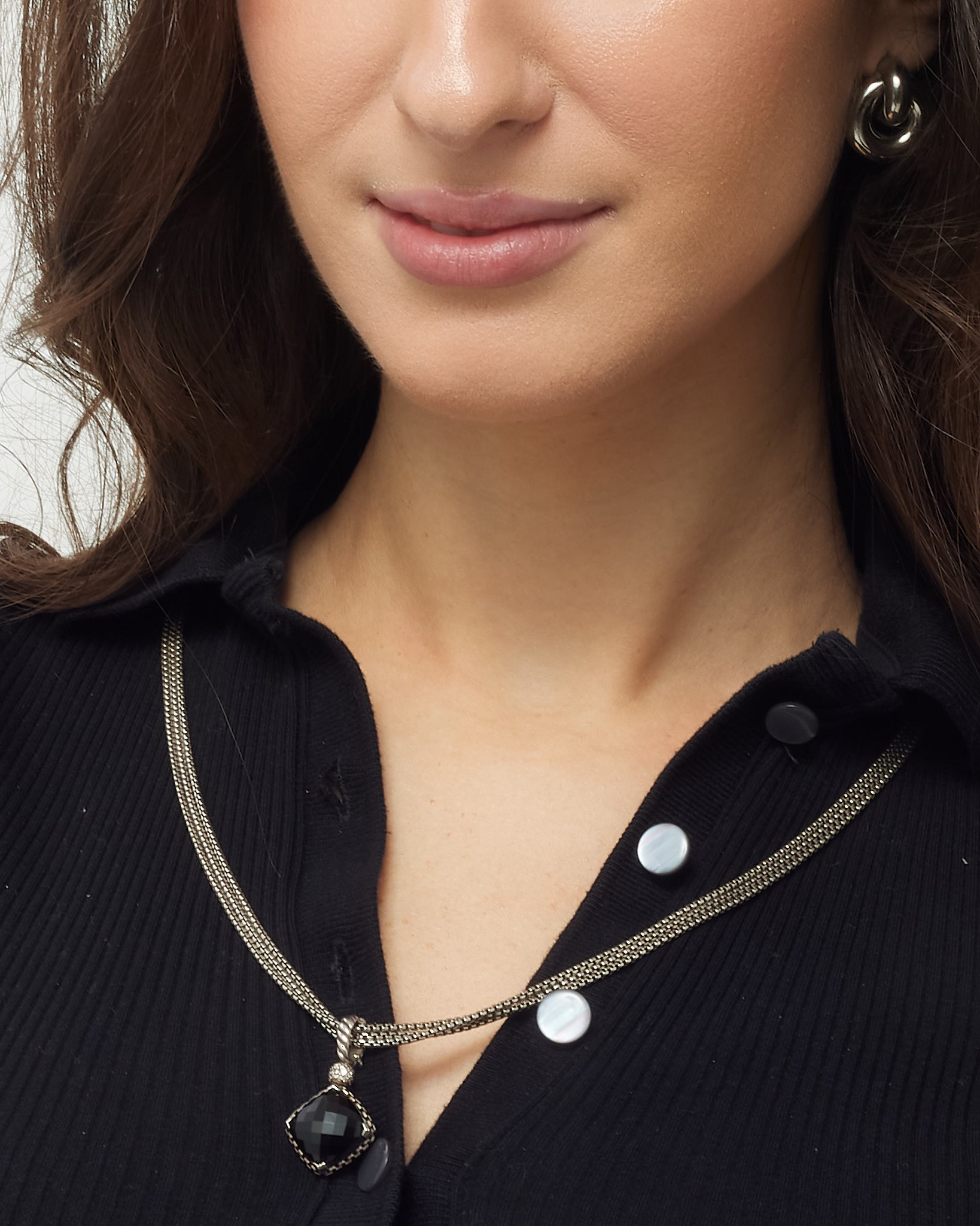 Sophisticated and eye-catching, this pre-loved authentic David Yurman Sterling Silver and Black Onyx Diamond Cushion On Point 20mm Pendant Necklace showcases the brand’s signature artistry and bold elegance. The pendant features a cushion-cut black onyx center with sparkling pavé diamonds, set in polished sterling silver for a refined finish. Suspended from a classic silver chain, this statement piece effortlessly balances modern edge with timeless luxury, perfect for both day and evening wear.