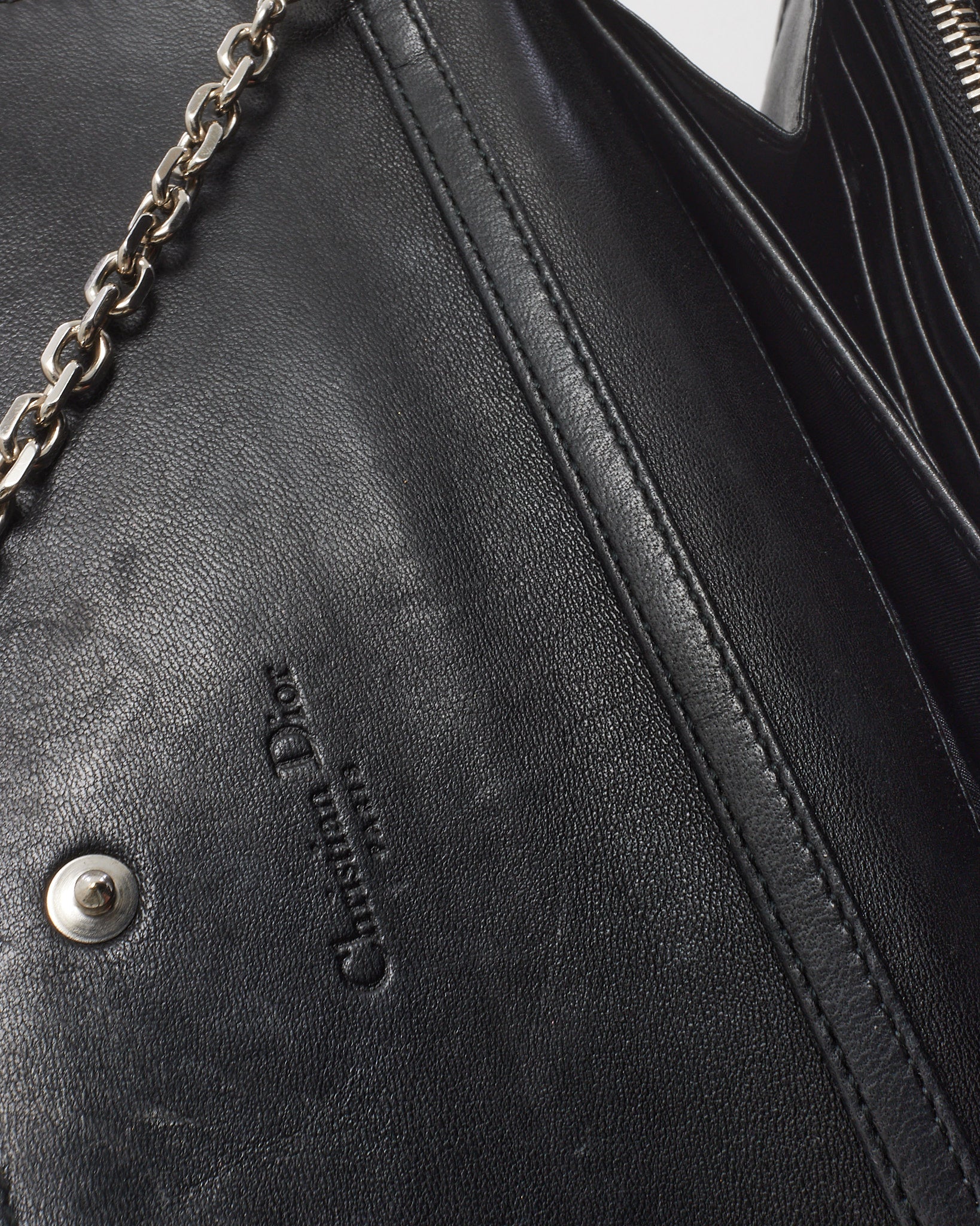 Timeless elegance meets modern versatility in this pre-loved authentic Dior Lady Dior Pouch. Crafted from signature black Cannage-stitched lambskin leather, this wallet-on-chain design is accented with silver-tone hardware and the iconic Dior charm. The flap opens to a compact yet functional interior featuring card slots and space for small essentials. Complete with a detachable chain strap, it can be styled as a clutch, crossbody, or wallet—making it the perfect piece for refined day-to-night transitions.