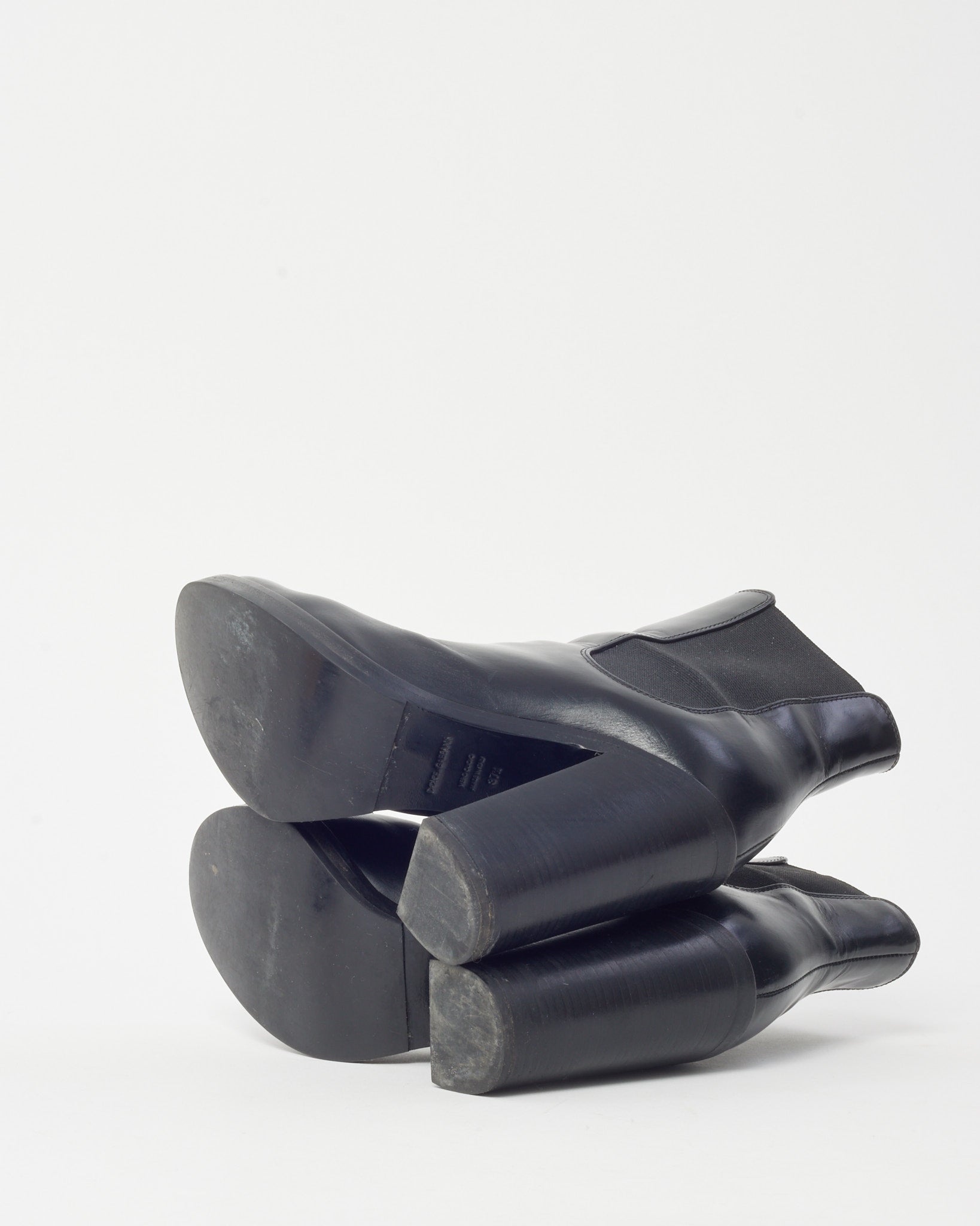 Step into sleek Italian sophistication with these pre-loved authentic Dolce & Gabbana Black Leather and Elastic Round Toe Heeled Booties - 37.5, crafted in smooth black leather with flexible elastic side panels for a streamlined fit. The classic round toe silhouette is balanced by a refined heel that offers both height and everyday wearability. Designed for effortless styling, these Dolce & Gabbana ankle booties transition seamlessly from tailored looks to casual denim. A timeless designer footwear staple that blends modern edge with enduring craftsmanship.