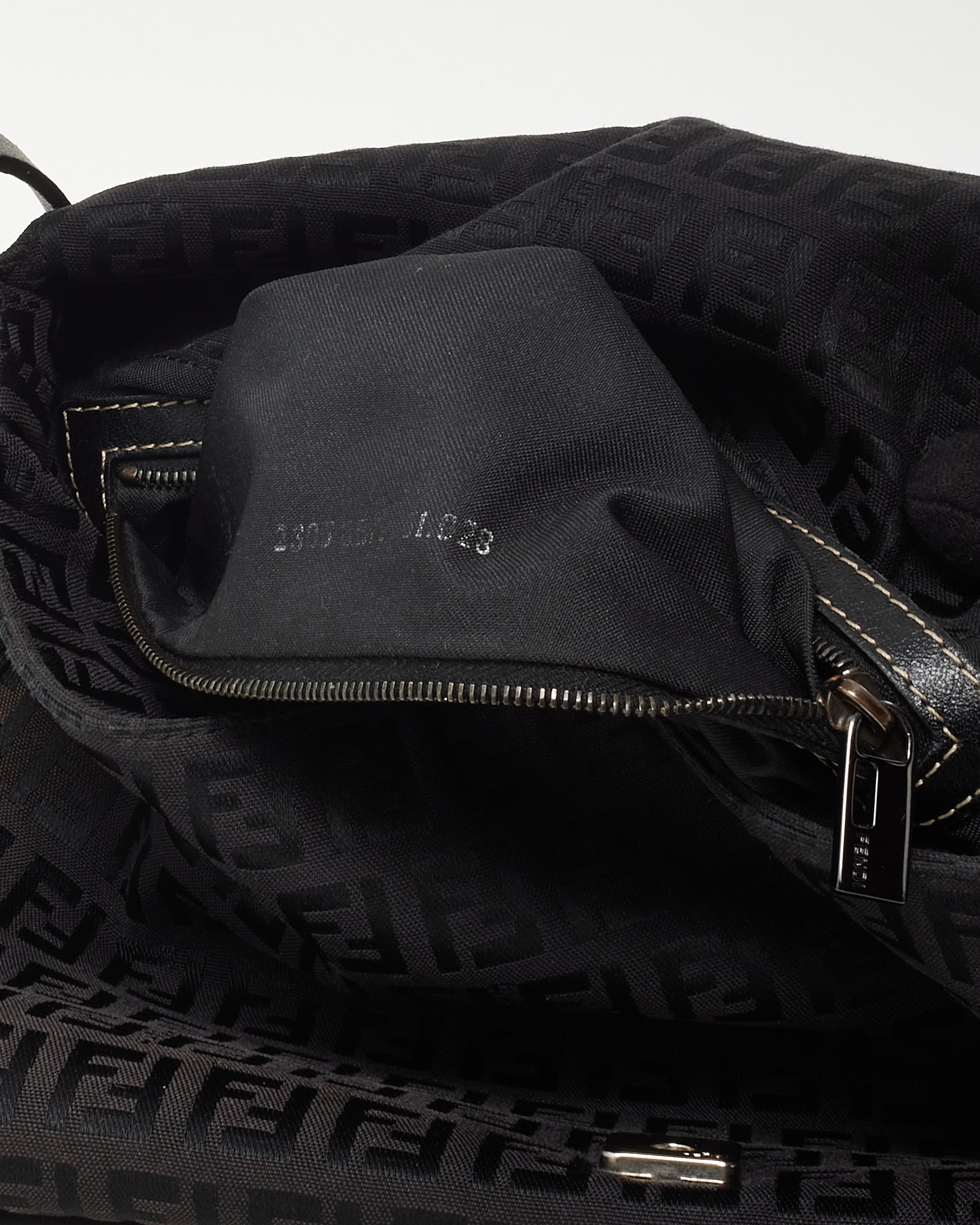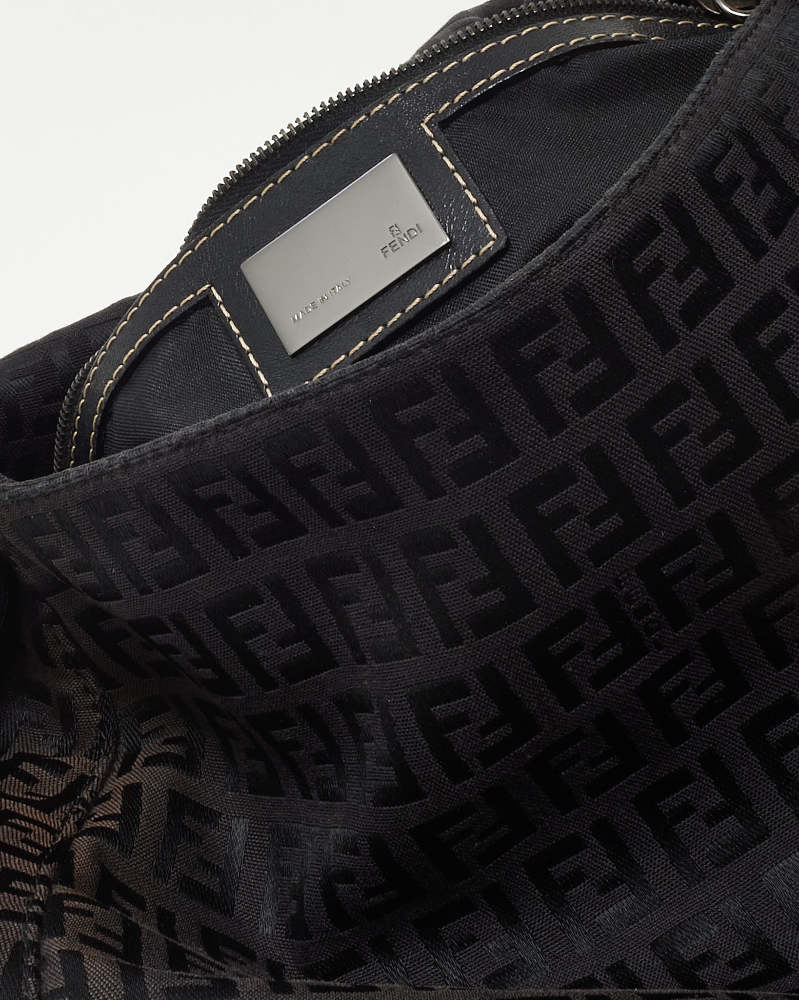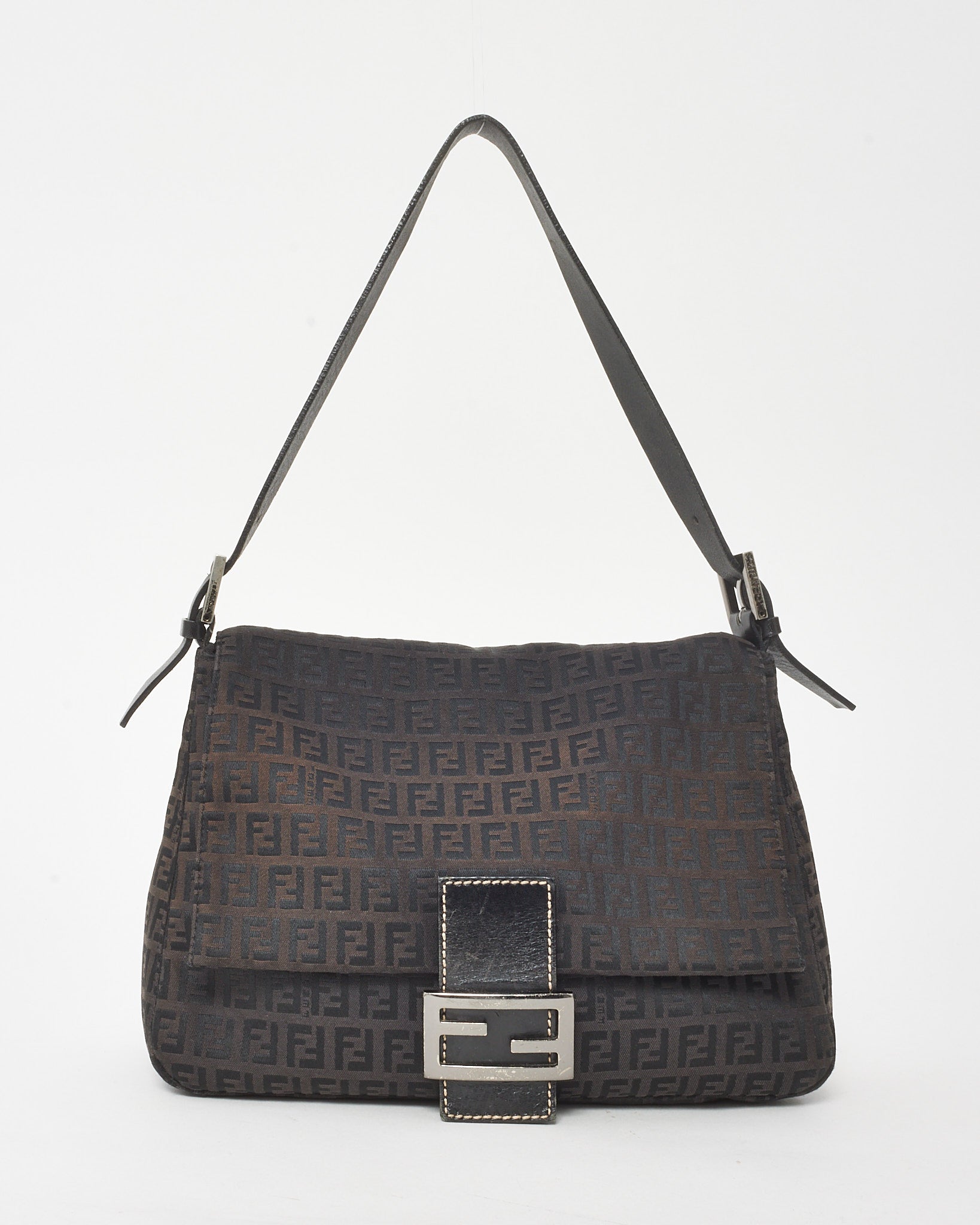 A timeless expression of Fendi’s iconic style, this pre-loved authentic Mamma Forever Baguette Shoulder Bag features black and dark brown Zucchino print canvas with leather trim and silver-tone hardware. The signature flap silhouette is finished with an FF logo buckle and magnetic snap closure, while the adjustable strap ensures versatile carry. A sophisticated everyday essential infused with heritage charm.