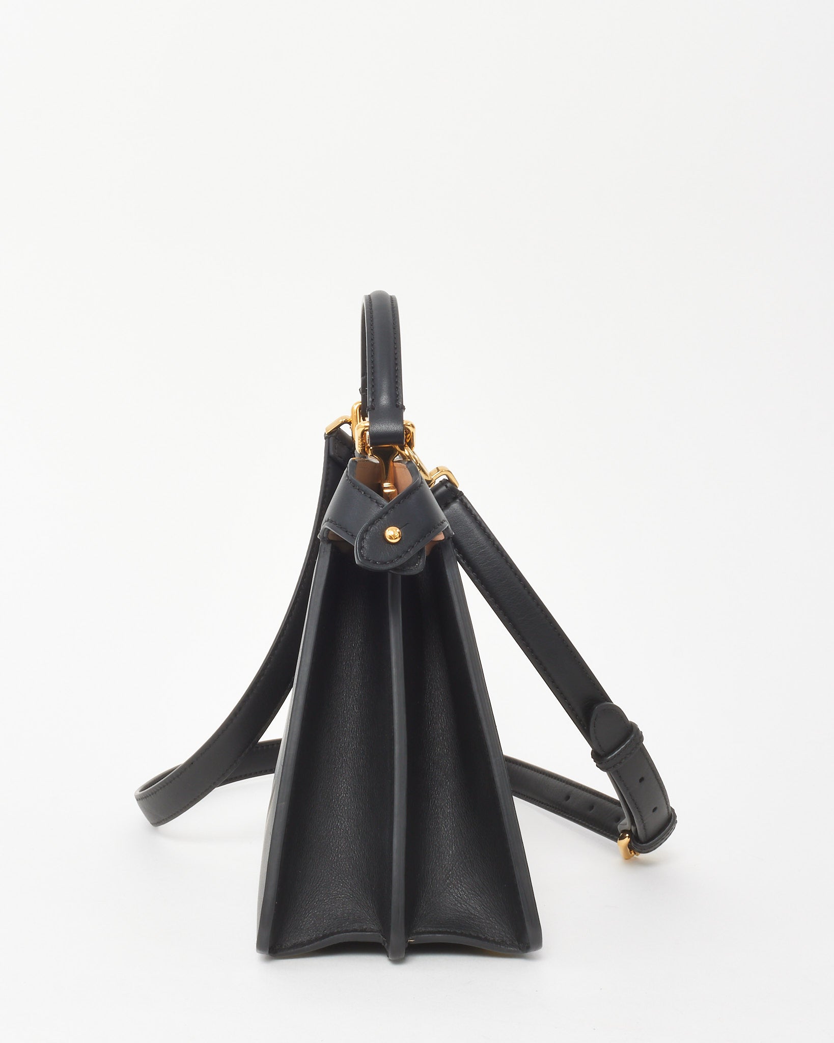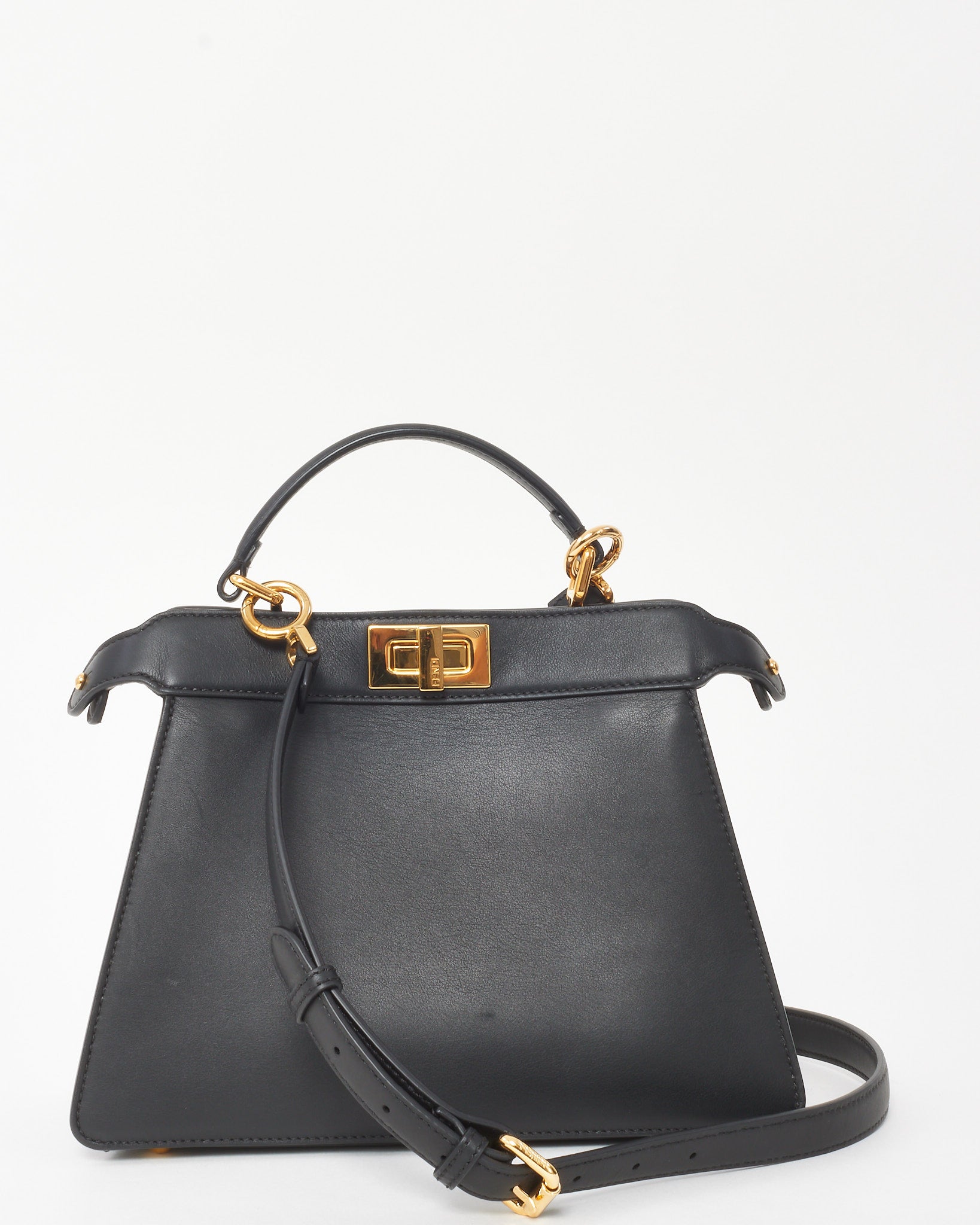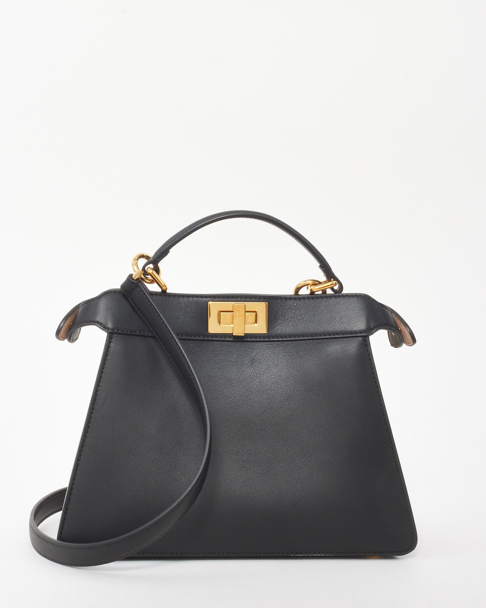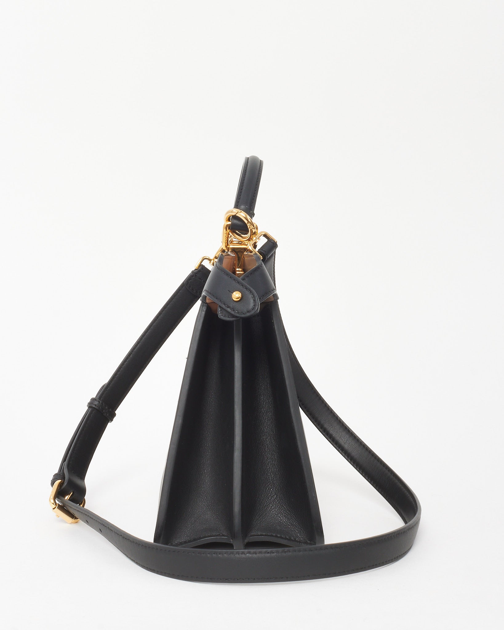 A timeless expression of Italian elegance, this pre-loved authentic Fendi Peekaboo ISeeU Bag is crafted in structured black leather with signature twist-lock closures and accordion sides. The compact silhouette opens to a dual-compartment interior with beige lining and slip pockets for effortless organization. Carried by the top handle or adjustable crossbody strap, this iconic design blends sophistication with modern versatility—a statement piece for refined everyday wear.