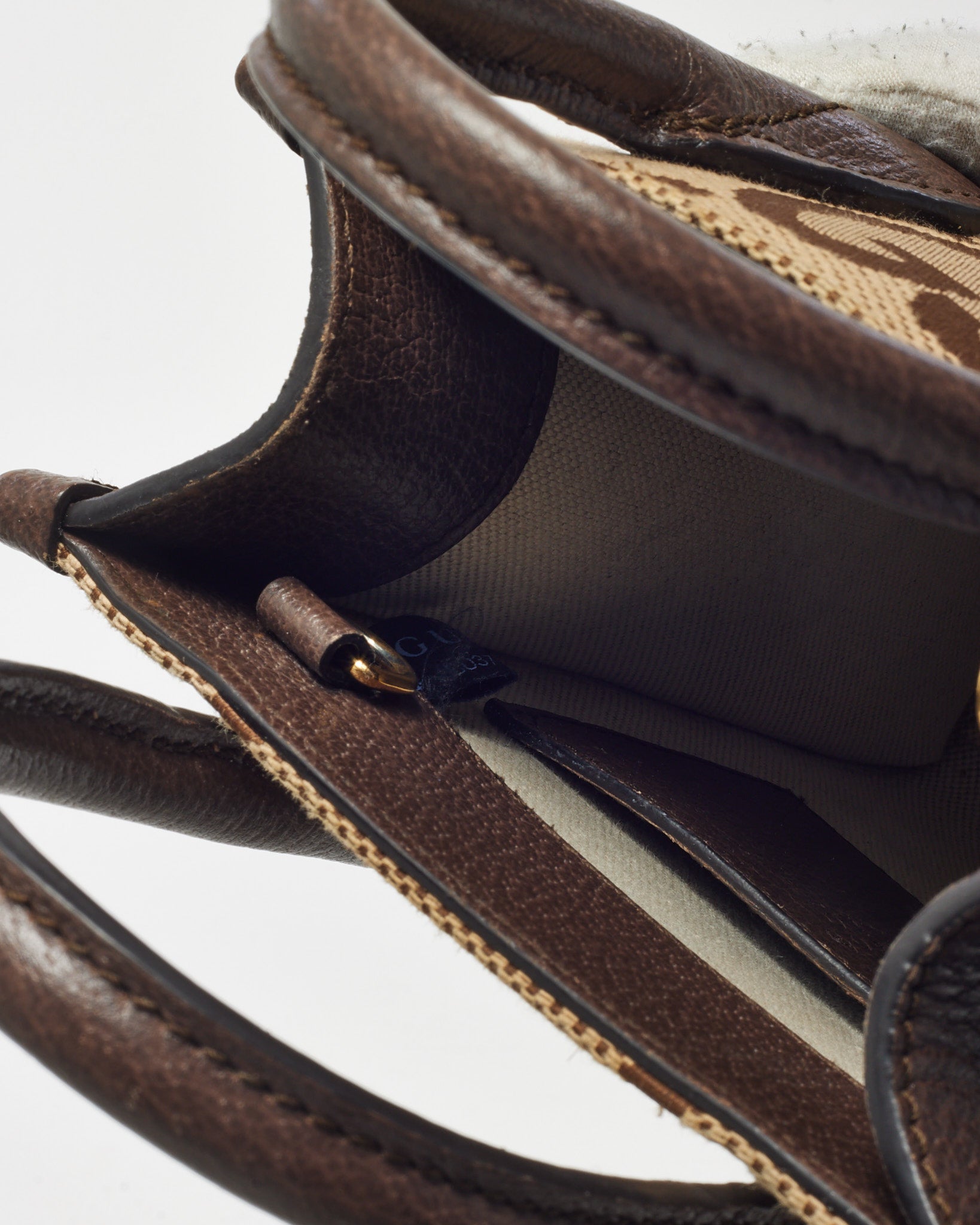 Infuse your look with iconic house style using this pre-loved authentic Gucci Beige and Brown Jumbo GG Monogram Canvas Mini 2Way Tote. Crafted from oversized GG monogram canvas with brown leather trim, this compact yet structured silhouette features dual top handles and a detachable green and red web shoulder strap for versatile carry options. Finished with gold-tone hardware and a canvas-lined interior, this mini tote is perfect for hands-free city days while making a bold statement in a scaled-up classic.