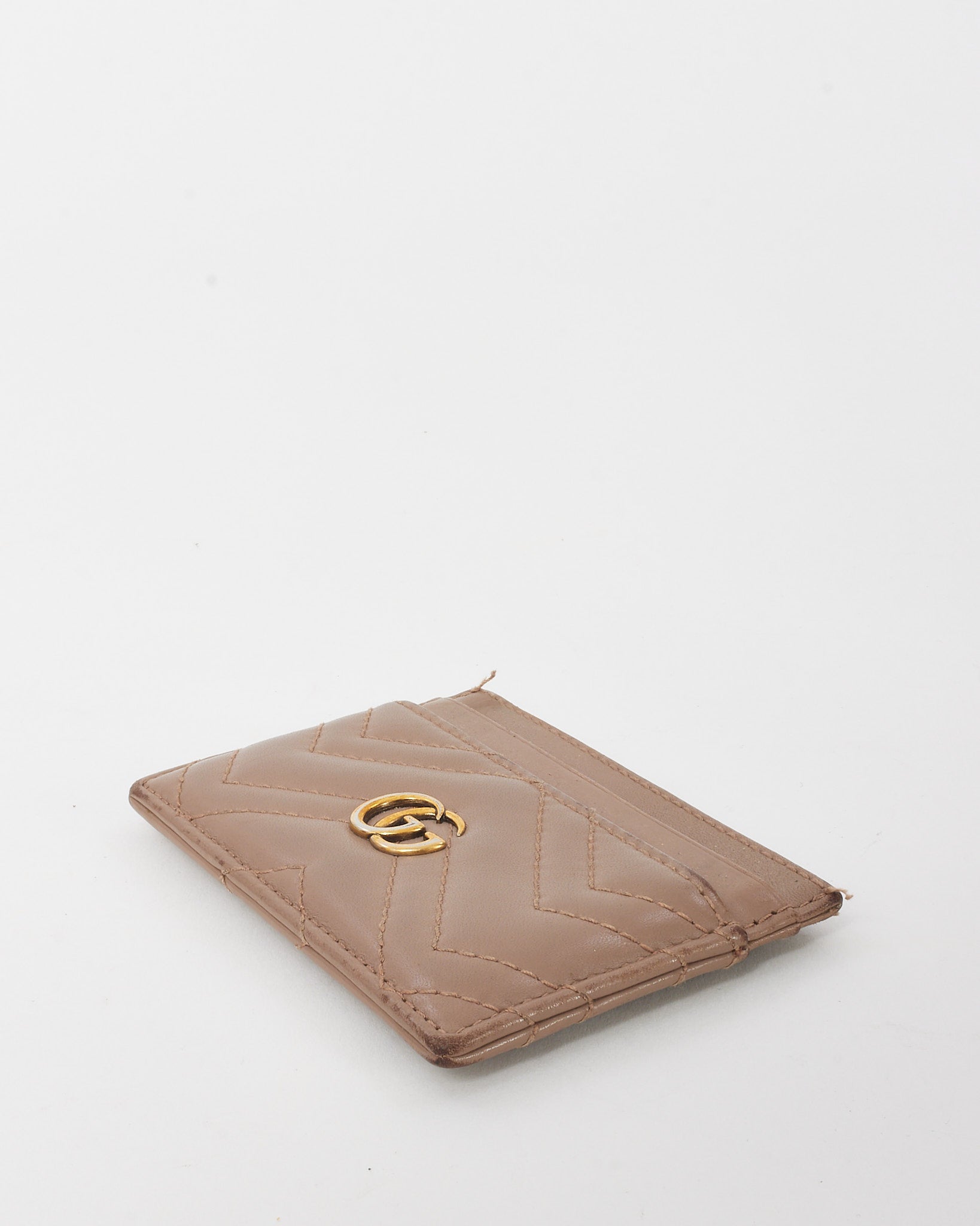 Compact and luxurious, this pre-owned authentic Gucci GG Marmont Card Case is crafted from soft beige chevron-quilted leather and finished with the signature gold-tone GG logo. The slim profile features multiple card slots and a central compartment, offering stylish organization in a streamlined design.