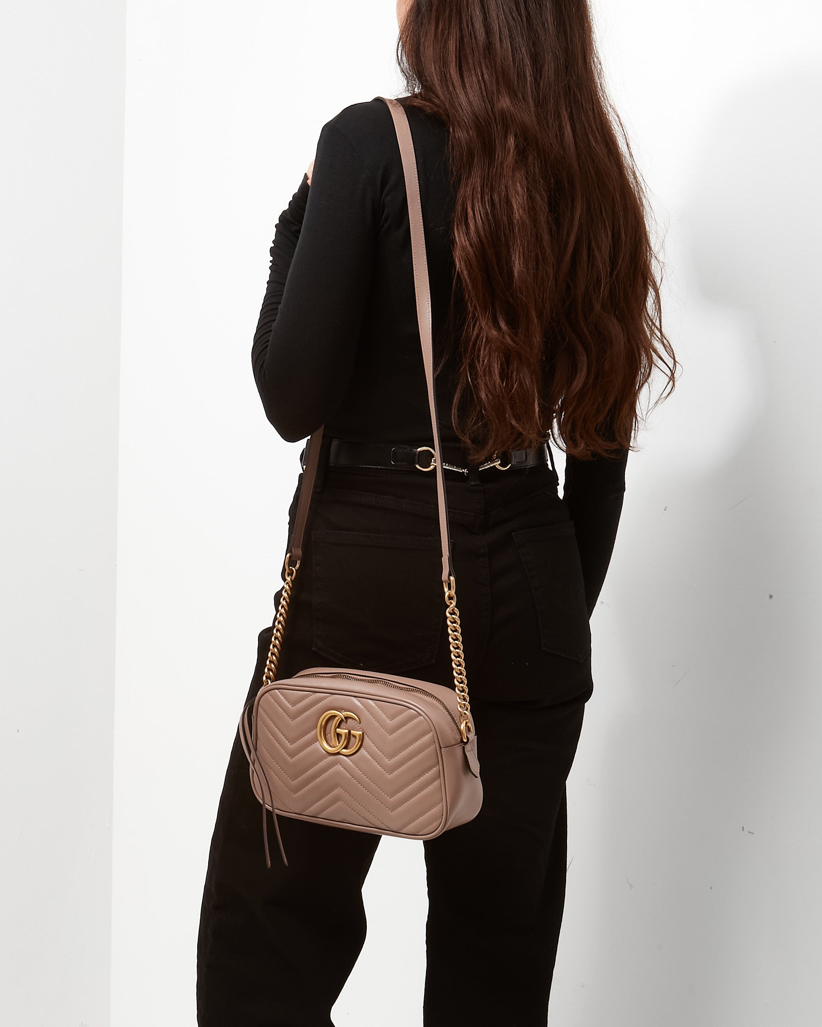 Add soft sophistication to your everyday rotation with this pre-loved authentic Gucci GG Marmont Small Camera Bag, crafted in beige dusty pink matelassé chevron leather. The softly structured silhouette is accented by the iconic double G logo in polished gold-tone hardware, delivering timeless Gucci appeal. Designed with a top zip closure and adjustable leather strap, this compact crossbody keeps essentials secure while offering hands-free ease. Feminine yet versatile, it’s the perfect statement piece to elevate both casual and dressy looks.