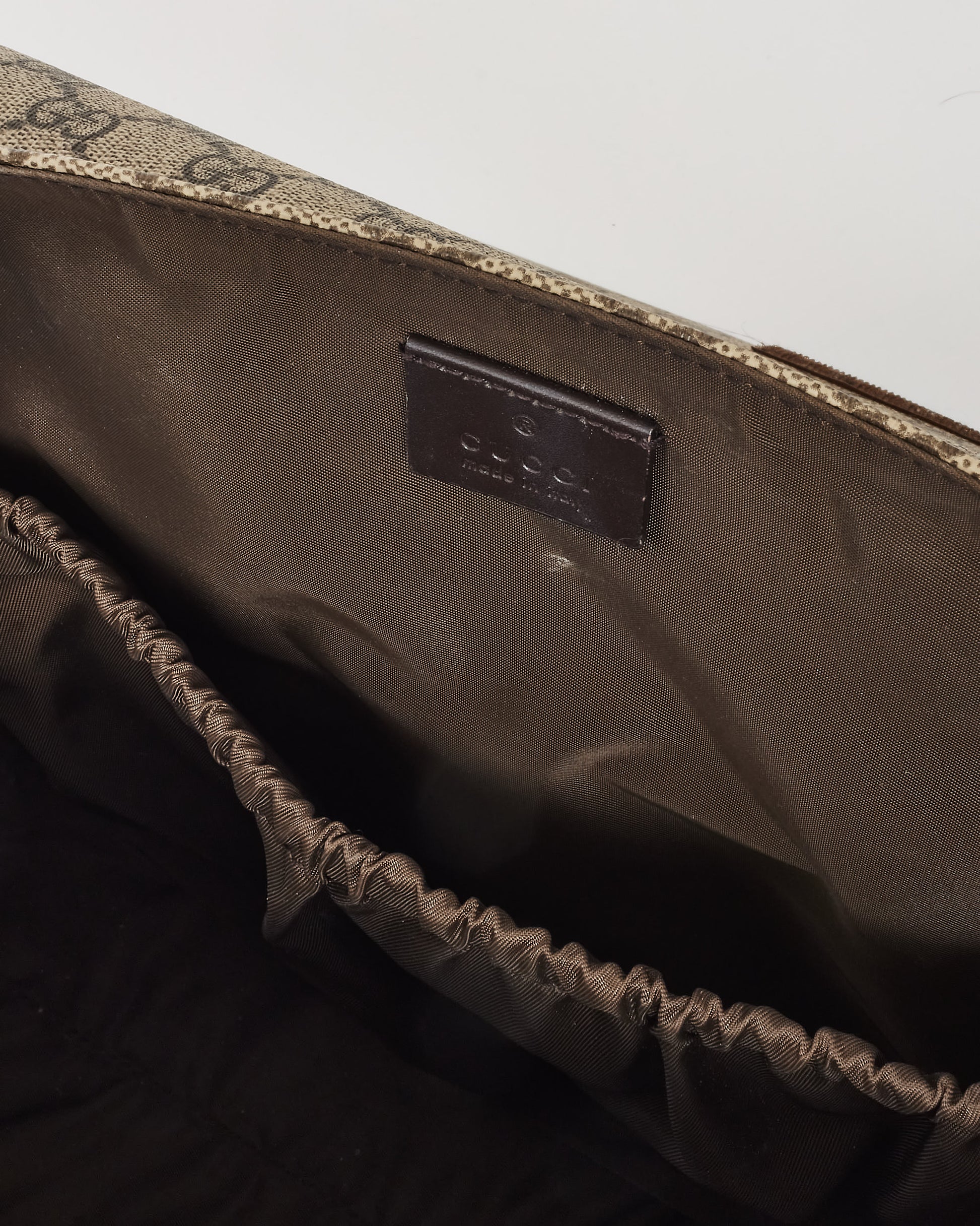 A perfect blend of luxury and practicality, the pre-owned authentic Gucci Beige & Ebony GG Monogram Supreme Coated Canvas Medium Diaper Bag is a stylish essential for parents on the go. Crafted from durable GG Supreme coated canvas in beige and ebony, this bag is designed to be both functional and effortlessly chic.
