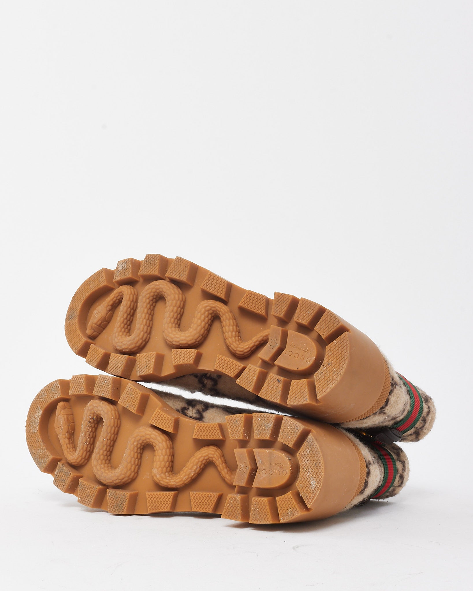 Make a statement with these pre-loved authentic Gucci Beige GG Monogram Wool Web Buckle Lace Up Combat Ankle Boots – a bold fusion of heritage design and rugged sophistication. Crafted from GG monogram wool with smooth leather trim, these boots feature lace-up fronts and signature green-red-green web buckle straps at the ankle. The chunky rubber sole adds both height and utility, making them ideal for city streets or off-duty style. A perfect blend of fashion and function, these boots reflect Gucci’s iconic detailing and fearless approach to contemporary dressing.