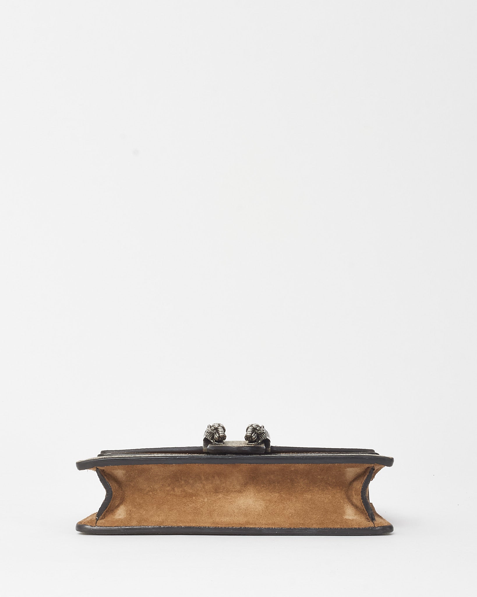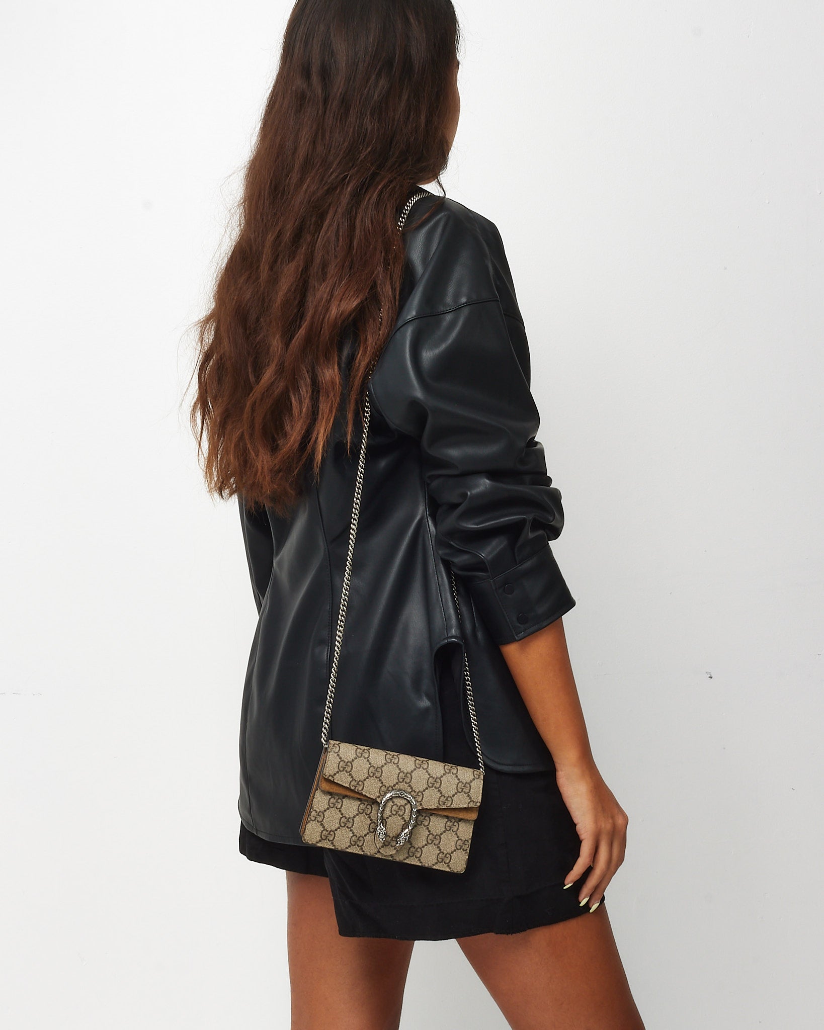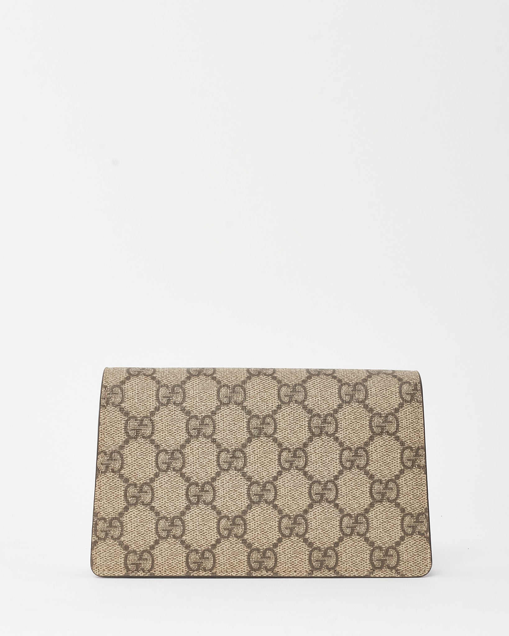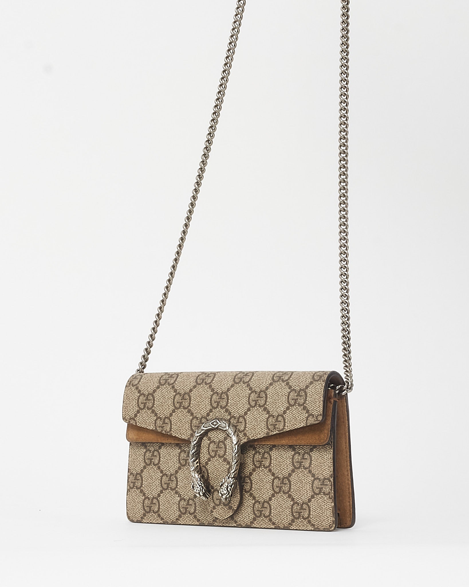Compact in size but bold in style, this pre-owned authentic Gucci Super Mini Dionysus Bag is crafted from beige GG Supreme coated canvas with taupe suede trim. Featuring the iconic textured tiger head spur closure and a sliding chain strap, it offers versatile wear as a shoulder, crossbody, or belt bag.