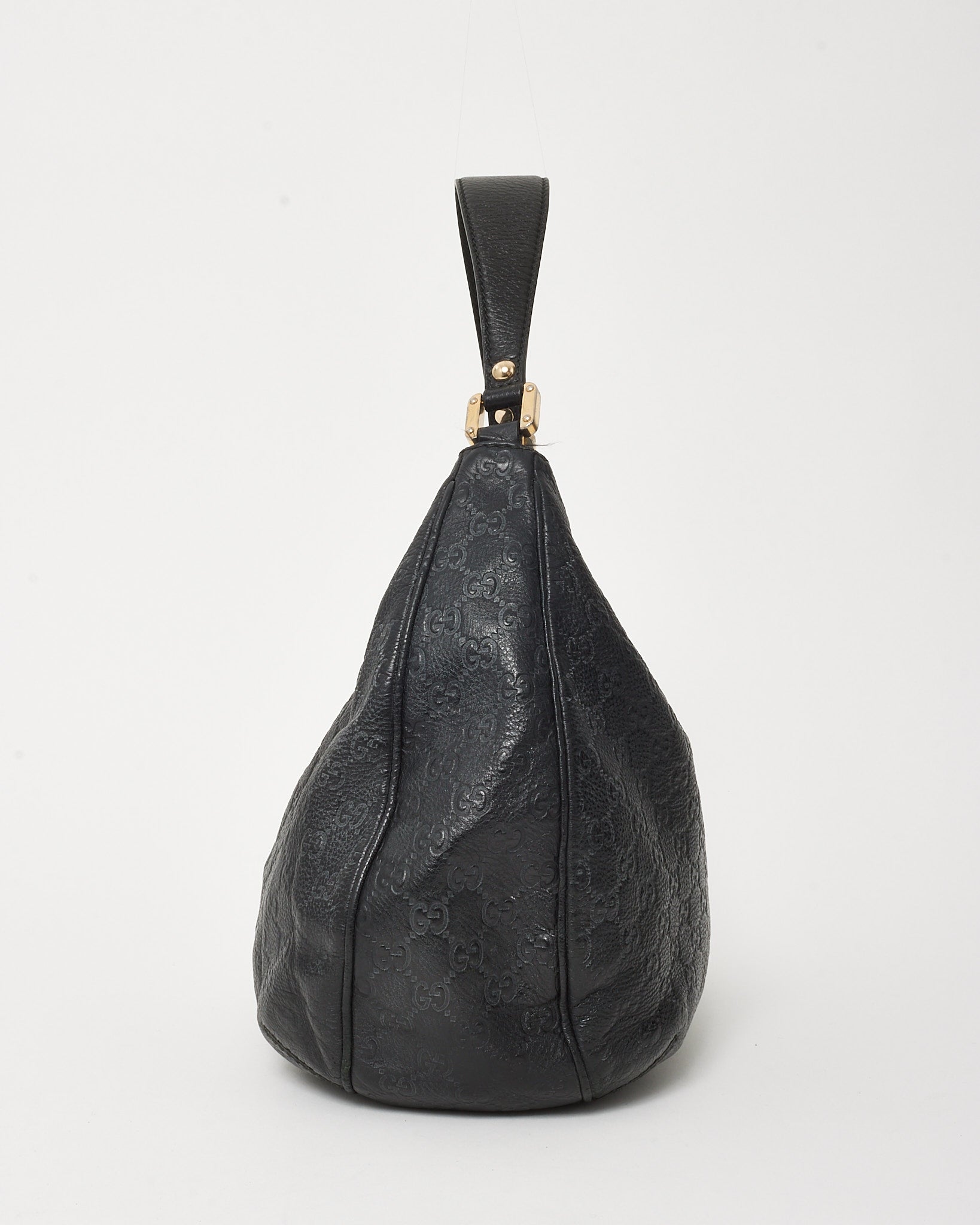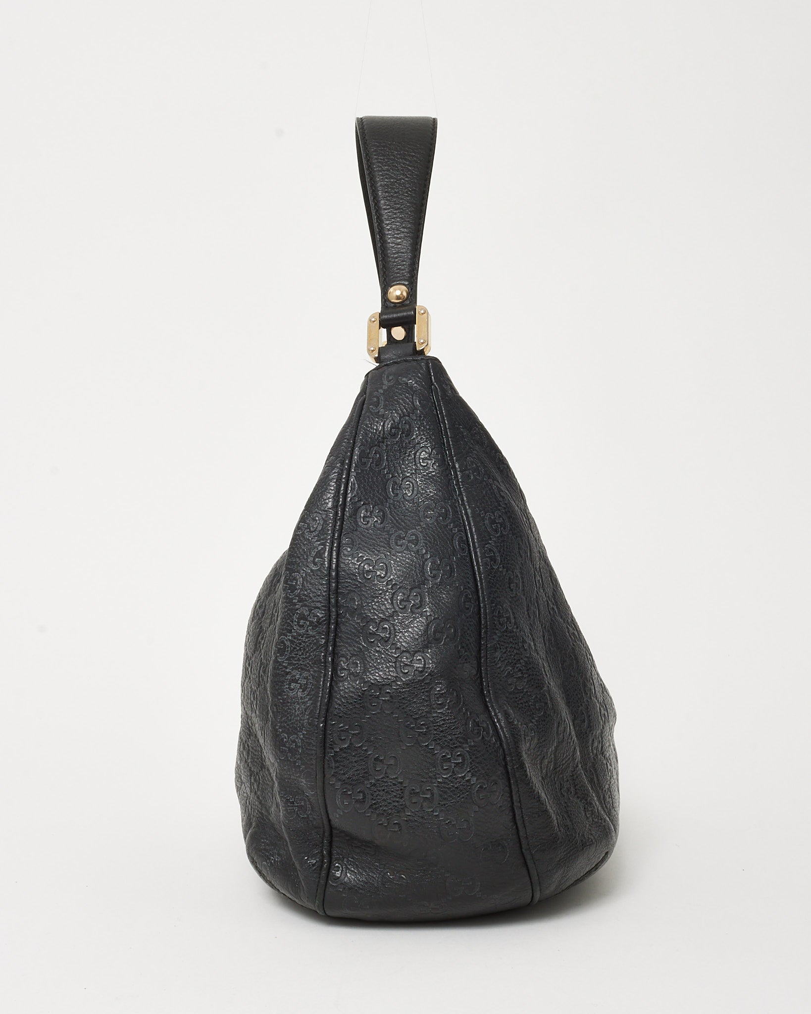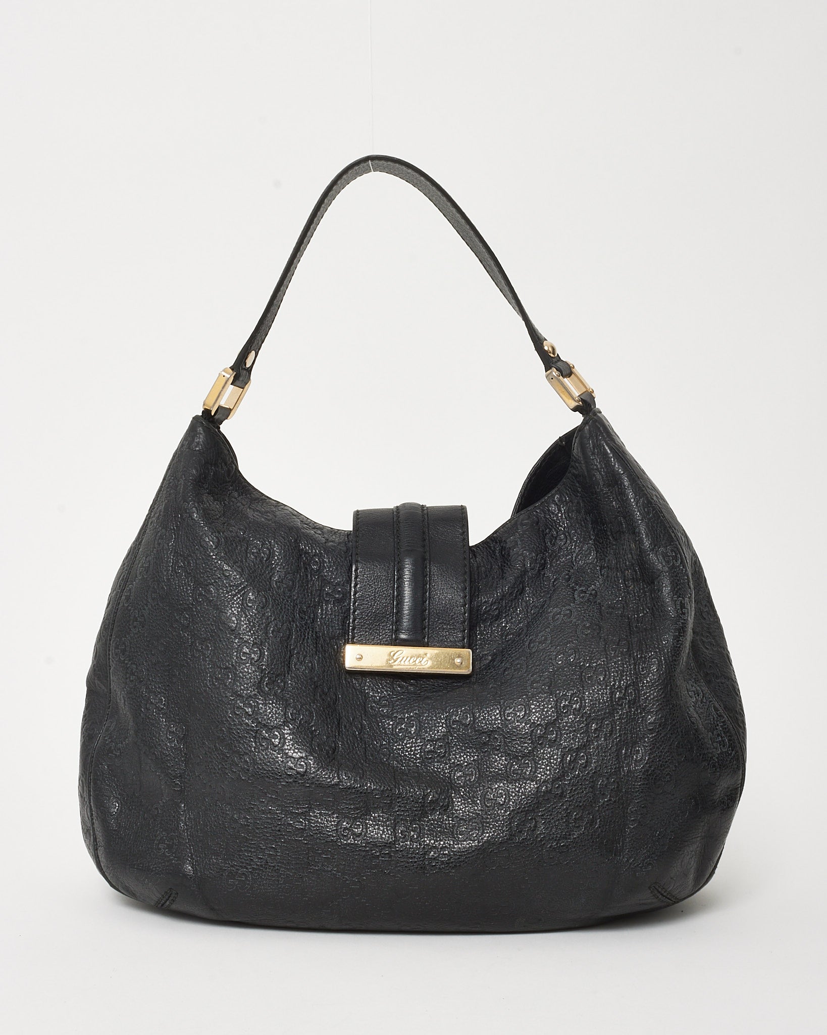 A timeless everyday essential, this pre-loved authentic Gucci Black Guccissima GG Monogram Leather New Web Hobo Bag is crafted from embossed leather and accented with a gold-tone logo plaque. The softly structured silhouette features a single top handle, spacious interior, and magnetic strap closure. A refined balance of function and luxury, perfect for elevating your daily wardrobe.